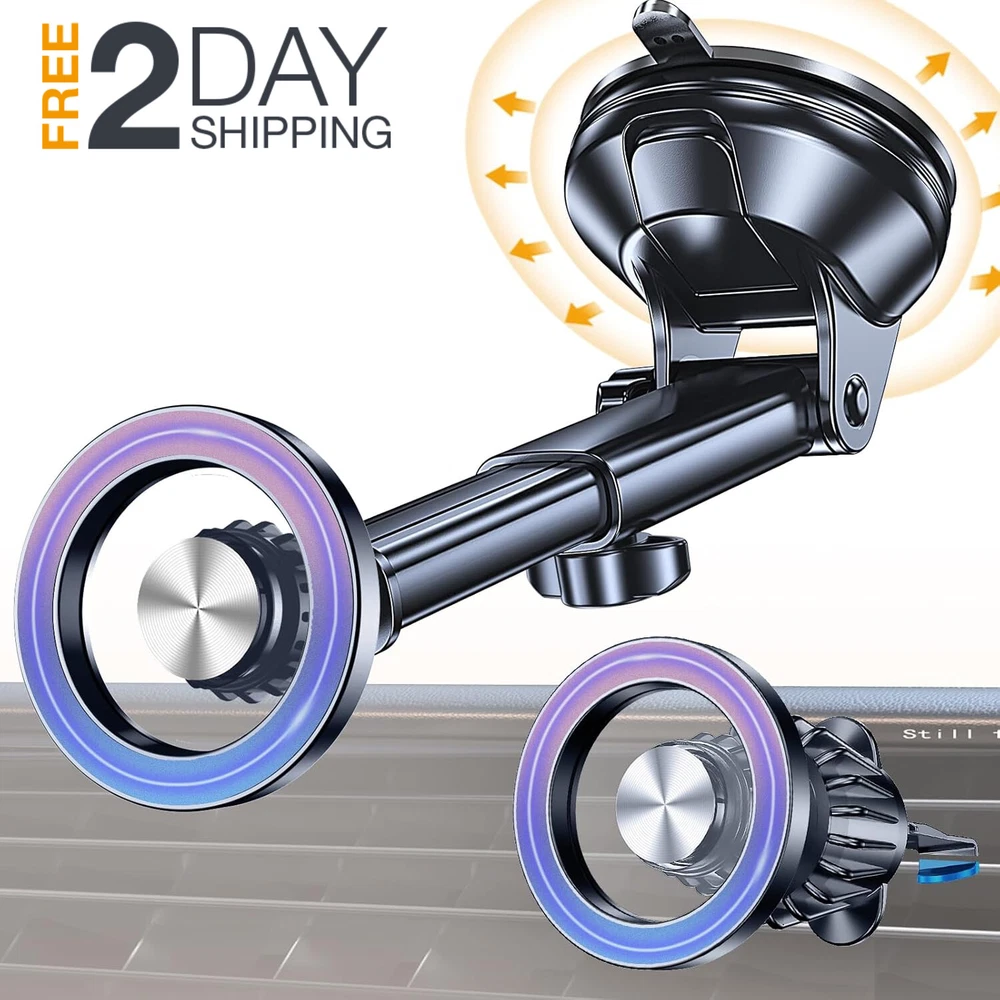 【2 in 1 fits Magsafe Magnetic Cell Phone Holder for Car】 - You are not sure which mounting method is more suitable for your car? No worries! 2 base suction cup/vent mount base magnetic car mount for flexible placement. Horizontal and vertical vents, dashboards and tables, all places work perfectly. In addition, you can choose to avoid problems caused by environmental influences due to low winter temperatures and hot summers. Suitable for all cars, pickups, suv's, cabs, etc 【STRONG MAGNETIC MagSafe Car Mount】 - This powerful magnetic phone holder can create a powerful attraction that firmly supports your device while allowing you to drive without distraction. it easily and securely holds your phone through bumps, sharp turns or even sudden stops, no worrying of dropping your phone. 【Adjust Car Holder Mount As You Wish】 - The ball joint and arm of this mobile phone car mount are 10 x sturdier than normal ones. Adjustable 270° Telescopic Arm/360° Rotation Ball Joint/Extendable Arm, allow you to rotate your phone to landscape or portrait and adjust your phone to a position angle that meets your need. During driving, you can adjust this car cell phone holder according to your front passenger seat to avoid obstructing the sight and ensure driving stability and safety. 【Secure Stable Install】 - The car cell phone mount features an extra strong suction cup . the reusable suction cup attaches firmly to the car windshield directly reusable suction cup combo provide a powerful hold and superior sticking strength on the dashboard. 【Complete Package Included, For Every Situation】: 1 * MagSafe Car Mount; 1 * Sticky Suction Cup Base; 1 * Sturdy Vent Clip; 1 * Thick metal ring; 1 * Considerate User Manual. We offer prompt efficient after sale service to ensure a happy purchasing. For any issue among the using of our product, you are warmly welcomed to contact us by e-mail. Our professional customer service is always there for your until you are satisfied with the solution.