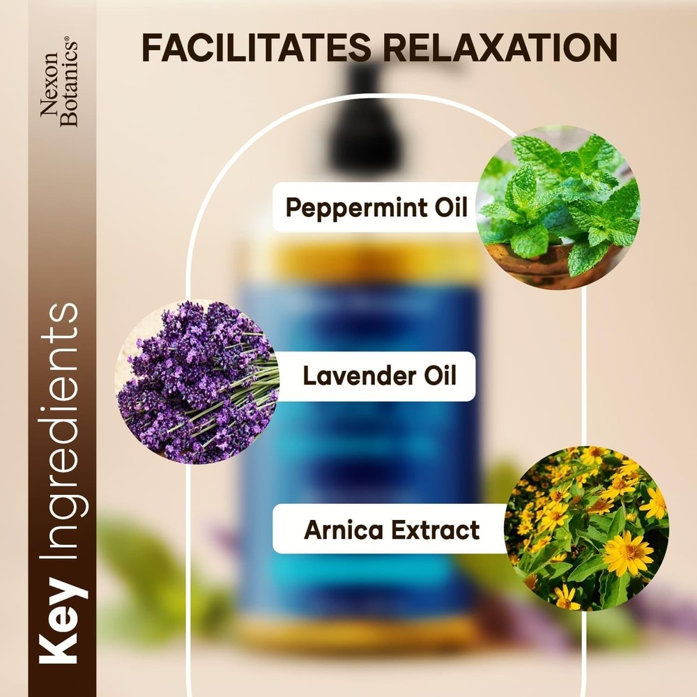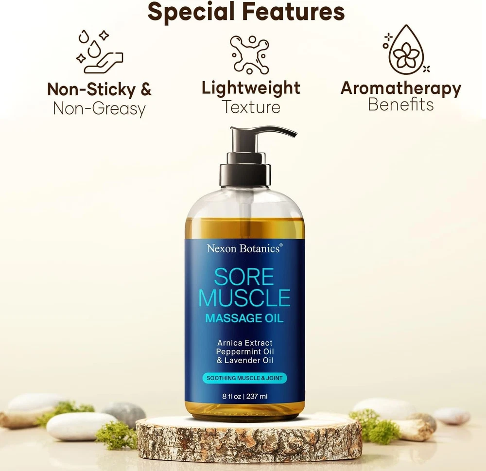 Free eBay listing template designed by dewiso.com Sore Muscle Massage Oil for Massage Therapy 8 fl oz - Refreshing and Relaxing - Natural Oils with Arnica, Peppermint and Lavender Oil - for Men and Women - Nexon Botanics FREE AND FAST SHIPPING! About this item Sore Muscle Relief: Dive into comfort with our sore muscle massage oil, designed to relieve soreness and unlock a sensation of deep muscle and joint relaxation. Expert Blend: Chosen by massage therapists for its effectiveness, this professional massage oil for massage therapy is a top pick for both office and home use. Arnica Powered Relief: Infused with the natural benefits of arnica, our arnica massage oil is a potent ally for combating aches and discomfort. Natural Goodness: Embrace the purity of our natural body massage oil, crafted to pamper your skin and enhance your wellbeing without any harsh chemicals. Can be used as a body moisturizer. Heating Comfort: Enjoy the gentle warmth that helps loosen stiffness, allowing our warming massage oil to soothe and relax your muscles thoroughly. Show more Product We offer a 30-Day Return Policy on items which you are not completely satisfied with. You have the option for a full-refund or an exchange of the item. No returns are available on items shipped outside of the US . Shipping We offer Free Shipping to the US and ship within 2 business days of payment, usually sooner. We use UPS express shipping. That's why your products are usually delivered within 3 days . Contact We try our very best to make sure every customer is completely satisfied. If there's a problem , message us! We're happy to help. 24/7 live chat available.