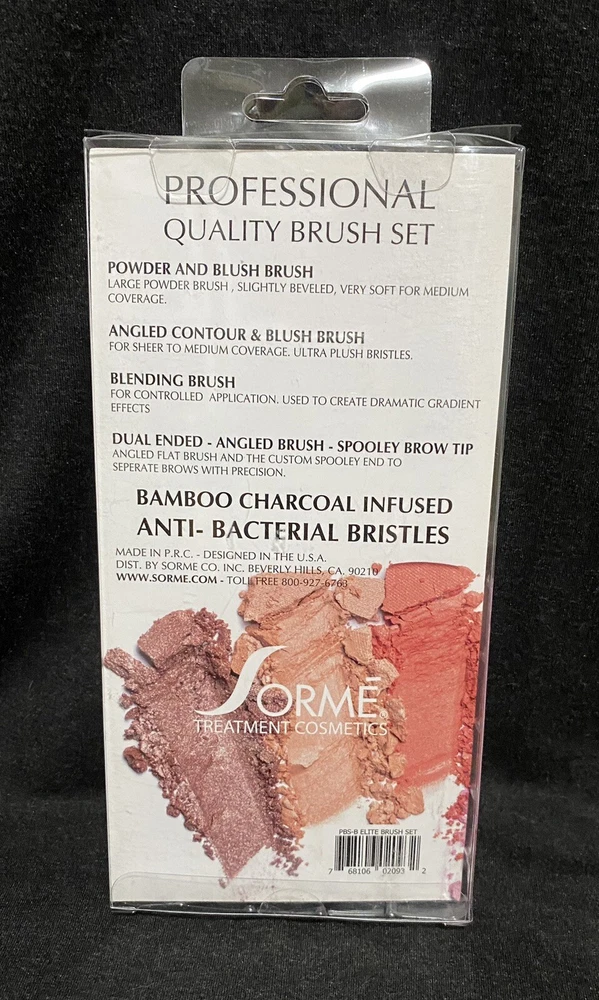 Sorme Treatment Cosmetics Elite 4-Piece Brush Set. * Powder and blush brush * Angled contour and blush brush * Blending brush * Dual ended-angle brush-spooley brow tip Bamboo charcoal infused antibacterial bristles. Shipping is $4.99! We ship all items with the utmost care.