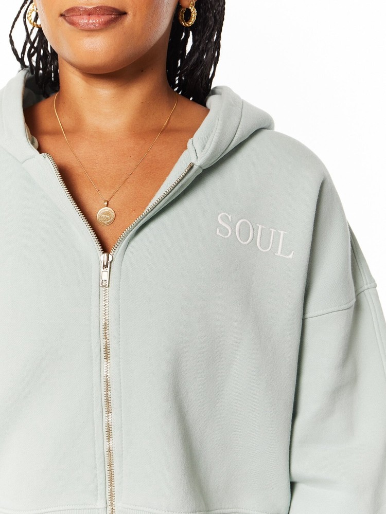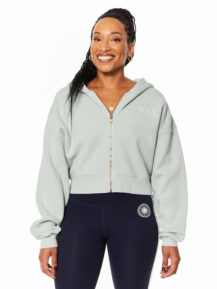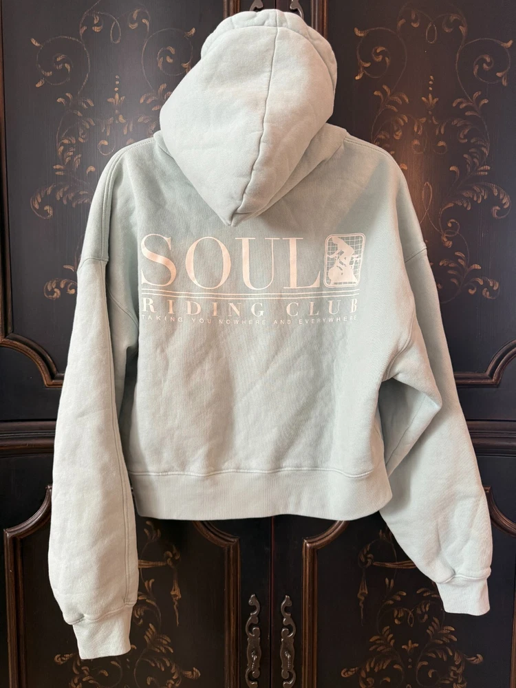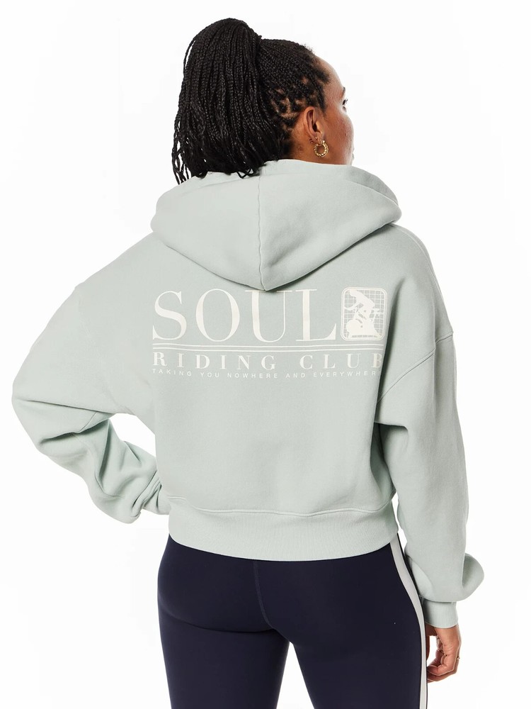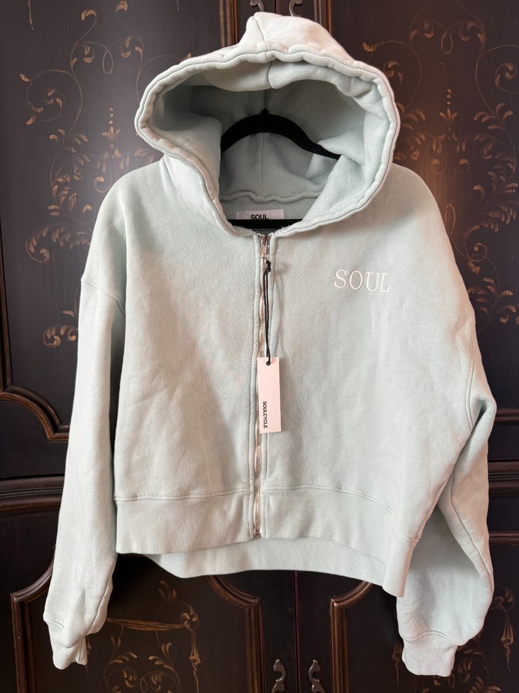 $128.00 MSRP Description This oversized, cropped Soul by SoulCycle hoodie is so comfy you'll never want to take it off. Features "SOUL" graphic on left chest, and "SOUL RIDING" in white on center back. Made in LA. 100% Cotton. Machine wash cold, tumble dry low. Model wears size S.