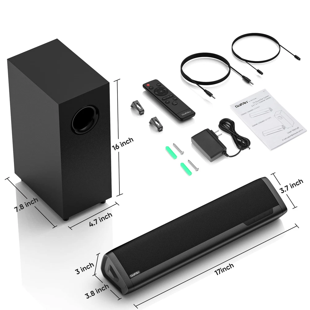 【Enjoy Deep Bass from Dedicated Subwoofer】The deep rich bass from our new generation sound bar(20Watts*2 output)and subwoofer(30Watts) will activate every cell in your body.The large cavity space of the subwoofer makes the bass punchy and full of magnetic. The surround sound of soundbar and subwoofer collide with each other in every corner of your room like waves, which allowing you immersed in music, movie and gaming. 【Multifunctional LED Indicator&Soft Light】Unlike other sound bars, The three-color LED lights help you better identify which the connection mode the sound bar is on(Optical-Purple, Bluetooth-Blue, Auxiliary-Green). Not only that, the volume progress bar below soundbar reminds you the volume level of total or bass.The soundbar's LED indicator and soft lighting make it possible for you to watch TV without distractions. 【3 Equalizer Modes】You can adjust soundbar to three different equalizer modes according to different TV shows like news, movie and music. It is an excellent sound bar for your TV. In addition, we provide replace remote control for free. (Remote control is not with universal or TV remotes) 【Wireless&Wired Connection】The Bluetooth chip can help you connect devices such as computers and cell phones to the sound bar. Auxiliary input model and optical input model are also available as an option for you to connect your computer, TV and speakers.(We also provide Auxiliary cable and Optical cable for free) 【What's You Get! 】The package contains the following products:Soundbar*1, subwoofer*1, remote control*1, user manual*1, 3.5mm to 3.5mm auxiliary cable*1, optical cable*1, brackets*2 expanded plastic pipe*2 and screws*2. In addition, you will receive our product quality for more than year and professional after-sales service. 【with Fire TV Remote】Soundbar is with Fire TV remote control. Additional remotes with Roku box or Roku TVs can be provided as per your request. NOT with insignia ROKU TV.