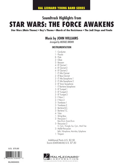 Soundtrack Highlights from Star Wars: The Force Awakens Publisher: Hal Leonard Category: Band/Orchestra/Ensemble Series: Young Concert Band Format: Softcover Opening with the familiar strains of the main theme, this carefully paced medley also includes important themes for new characters Rey and Kylo Ren, and the rousing march theme of the good guys. Film music at its best from John Williams, and effectively adapted for younger players. Inventory # : 04004655 UPC: 888680608408 ISBN: Width: 9" Length: 12" Height: 0.74" Product Weight: 2.2 lbs. Number of Pages: Band Grade Level: 3 Authorized Dealer Ships Fast From The USA