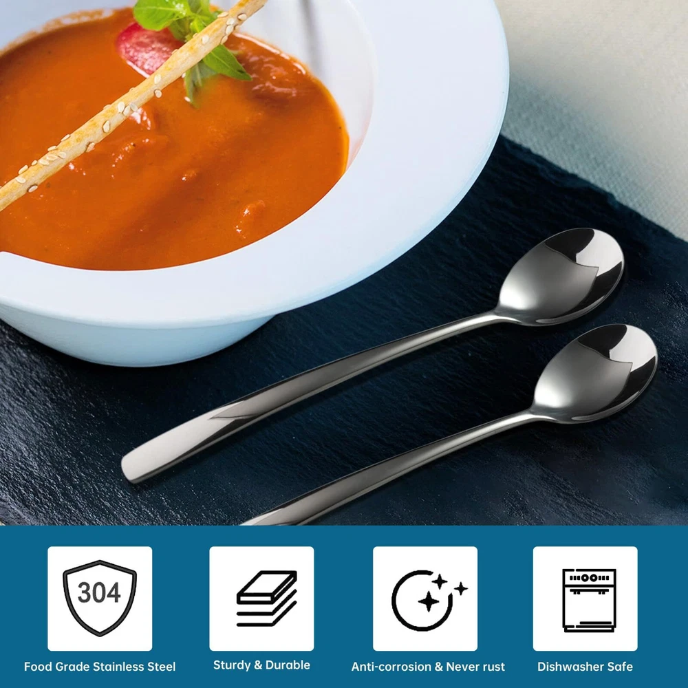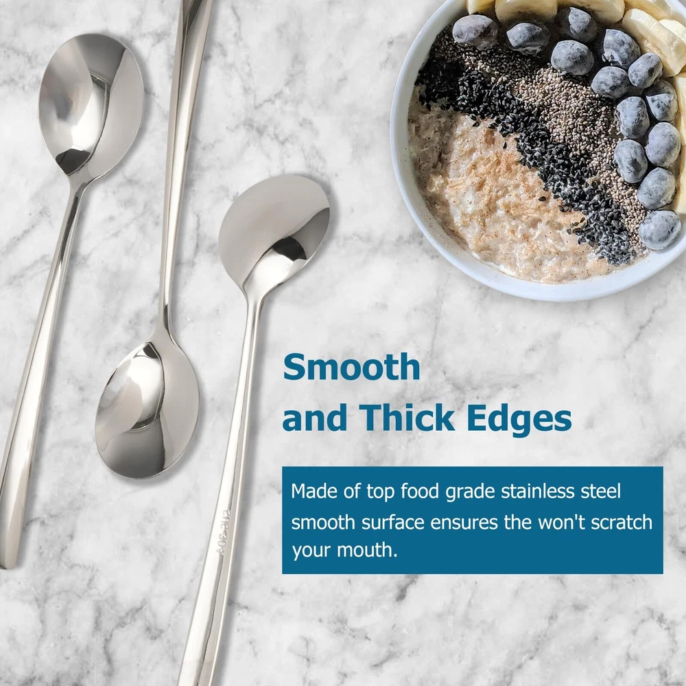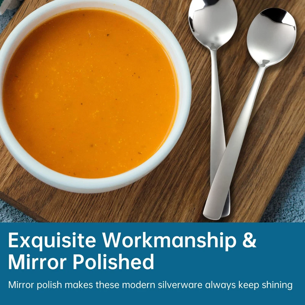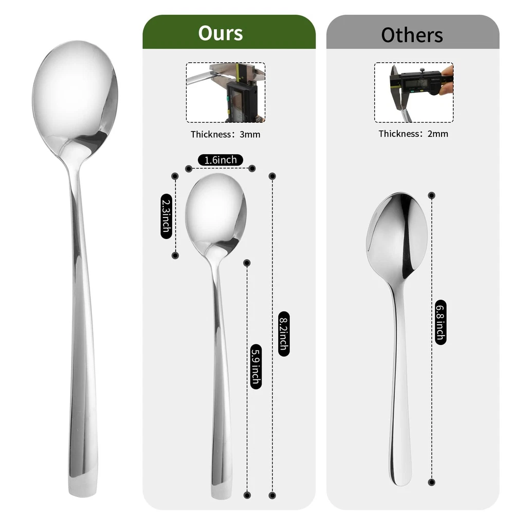 The Soup Spoons 4-Piece silverware set is the perfect addition to your kitchenware collection. Crafted from high-quality food-grade stainless steel, these round spoons are designed to last. These soup spoons are not only durable but also stylish, with their sleek silverware design. Measuring 8.3 inches in length, these dinner spoons are perfect for enjoying your favorite soups, stews, chili, and broths. The round shape of the spoons makes them ideal for scooping up every last drop of deliciousness. With their mirror-polished finish, these metal spoons add a touch of elegance to any table setting. Whether you're hosting a formal dinner party or simply enjoying a meal at home, these spoons will surely impress your guests. One of the standout features of these spoons silverware is their dishwasher-safe design. After enjoying a hearty meal, simply toss them in the dishwasher for quick and convenient cleaning. This saves you time and effort, allowing you to spend more time enjoying your meal and less time doing dishes. Upgrade your kitchen utensils with the Soup Spoons 4-Piece set. With their soup spoon-specific design, stainless steel construction, round shape, and polished finish, these stainless steel spoons are a must-have. Order yours today and elevate your dining experience to a whole new level of sophistication. Food Grade Stainless Steel: 4-Piece 8.2 inch soup spoons is made of premium quality 18/8 stainless steel without any toxic materials, ensuring durability and long-lasting use. Rust resistance and nickel free, healthy and durable for everyday use. Heavy Duty:Ours spoons silverware set is made of thick and weighted steel, that mean is hard to bend, even for scooping out hard ice cream. Smooth edges without rough spots or angles that they won’t scratch your mouth. Mirror finished surface always keeps shiny. Multipurpose Spoons: This spoon set are slightly larger in spoon size and length than other dinner spoons,the handles are longer and don't slip into larger bowls. Perfect for enjoying soups, chili, stews, and dessert, rice, macaroni soup, oatmeal, cereal and so on. The stainless steel spoons multipurpose design makes it ideal for both everyday use and special occasions. Comfortable grip & Great weight: Well balanced and feel comfortable when holding in hand. Perfect size and weight for soups or chili. This metal spoons have a great weight on your hand not light and not too heavy, just the right amount.If you wanted some restaurant style soup spoons and these work perfectly. Stylish and Practical:Nice, thick round spoons, strong, sturdy, shiny, and polished. Simple enough to blend in with your other cutlery and solid. This spoons silverware set can perfectly replace the spoons lost in your daily life. Most importantly, the dinner spoons are dishwasher safe, for releasing your hands and save your time. Exactly what you want!