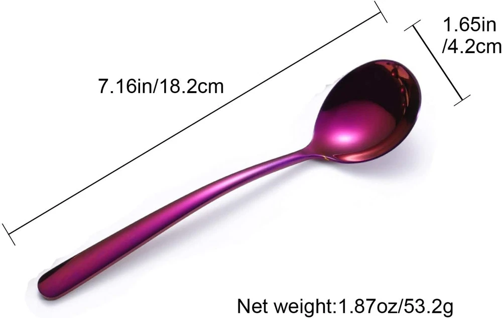 Store New Arrivals Add to Favorite View Feedback Contact Soup Spoons 6-Pack 18/10 Stainless Steel Large and Heavy Duty round Spoons Elegance Series 7 Inch Long 1.9 Ounces Weight by (Purple Soup Spoons) Description Style Modern, Custom, Classic Color purple soup spoons Material Stainless Steel Material Type Stainless Steel Item Weight 1.9 Ounces Style Name Modern, Custom, Classic Is the item dishwasher safe? Yes Product Dimensions 7"L x 1.65"W Item Dimensions L x W 7"L x 1.65"W 🍨 Made of High Quality 18/10 (SUS 304) Stainless Steel, extremely durable, Quality . 🍨 Set of 6 pcs, 7 inch long, 1.65 inch wide. Titanium plating of purple color. Shining and Beautiful. 🍨 Ergonomic and Elegance design, the best choice of soup spoons for adults. Suit for soup, bouillon, porridge and so on. 🍨 Heavy duty, mirror polishing, smooth edge and no dent at all. The handle is thick and smooth and good handling. 🍨 Dish-washer is safe and easy to clean, suit for Home, Restaurant, Cafe Material:18/10 (sus 304) food grade Stainless Steel Applicable Occasions:Home and Kitchen,Picnic,Camping,Office,Restaurant Package Includes:6 pcs spoons Net weight: 1.9oz Size: 7 inch long, 1.65 inch wide color: purple ABOUT US We offer the best prices around on high quality products. Our E-store includes media such as books, movies, music and games while offering electronics, toys, sporting apparel, clothing, tools, general home, garden items and more. SHIPPING We are always working hard to ensure your package arrives as soon as possible. Please understand that some factors like weather, high postal traffic, and the performance of shipping companies are outside of our control. We offer free shipping to the lower 48 states and ship within 2 business days of payment, usually sooner. We do not accept P.O. Boxes. Please provide a physical address. For shipping outside of the continental USA, we only use eBay's Global Shipping Program.The item is shipped to KY and then sent to the rest of the world. International customers are responsible for all duties and taxes. Continue to check out in order to calculate costs for shipping the item to your country. Messages regarding eBay's Global Shipping Program MUST be directed at eBay EXCLUSIVELY. RETURNS We offer a 30-Day Return Policy on items which you are not completely satisfied with. You have the option for a full-refund or an exchange of the item. No returns are available on items shipped outside of the USA. PAYMENT We accept PayPal. CONTACT US This page content is yet to come Please ad us to your favorite seller and visit again later Thank You CUSTOMER SATISFACTION We try our very best to make sure every customer is completely satisfied. If there's a problem, message us! We're happy to help. WE ACCEPT Copyright © 2021 AutoDS. | All Rights Reserved
