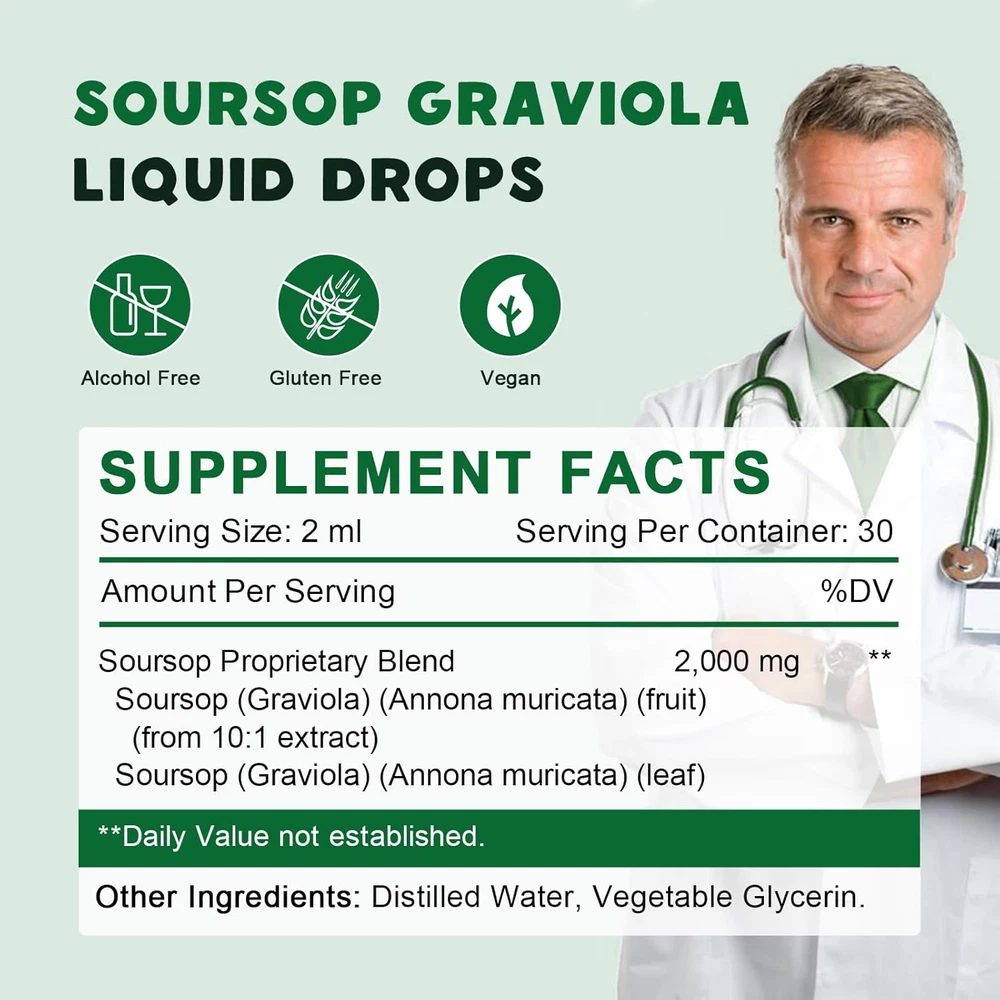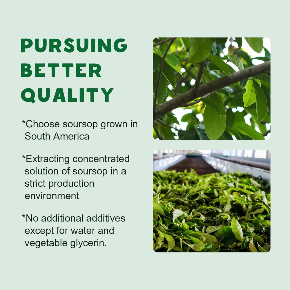 What is Soursop? : Soursop is also known as the Graviola or Guanabana. Soursop is known for its rich multivitamin content and delicious taste. Our soursop liquid drop is extracted from the soursop leaves and fruits. No Superfluous Additives: In addition to high-quality graviola leaves and fruit extracts, our graviola liquid drops only contain organic glycerin and water and no other unnecessary additives. Graviola is the perfect natural supplement to serve your body better without adding anything extra. Immune Support: Our product is a highly concentrated soursop extract with a centuries-old tradition of consumption in Mexico. Locals frequently use it as a natural immune booster. This plant extract can serve as a daily dietary supplement to enhance our immunity. Natural Antioxidant: Soursop leaves are rich in flavonoids and multiple vitamins, which can effectively remove free radicals in the body, increase skin vitality, and promote physical health. Easy to absorb and eat: Compared with soursop leaves tea and soursop extract capsules, our soursop liquid drops are convenient to eat, delicious, no need to soak in hot water or swallow the unpleasant capsules and can be added to mix with other foods edible.
