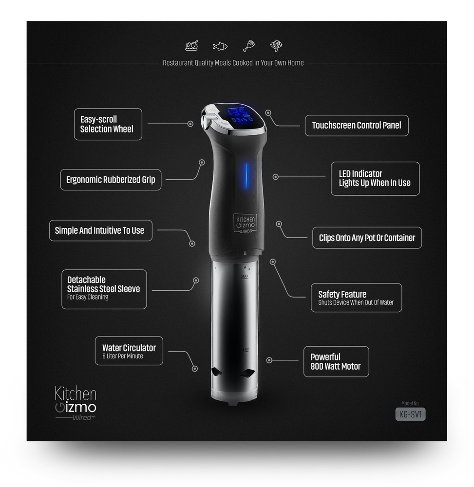 EASY TO USE: Remarkably intuitive with predictable results. This is the easiest and most delicious way to prepare food. CREATE RESTAURANT QUALITY DISHES: Once only an option for high-end eateries you can now create perfectly cooked dishes that look and taste amazing! RELIABLE AND QUIET OPERATION: Fits almost any pot with our strong-grip clip. Cooks precisely and quietly with temperatures up to 194 F and a +/- margin of error of less than 1 F. ETL approved HIGH-END FEEL - LOW-END MAINTENANCE: Removable sleeve allows for easy cleaning. Choose the correct time and temperature easily with the smooth scrolling selection wheel. FREE BONUS: We included a cookbook with tried and true Sous Vide recipes for every dish that will impress you and your guests. For the more daring chef we have included a handy chart to help you figure out the right temperature and cook times.