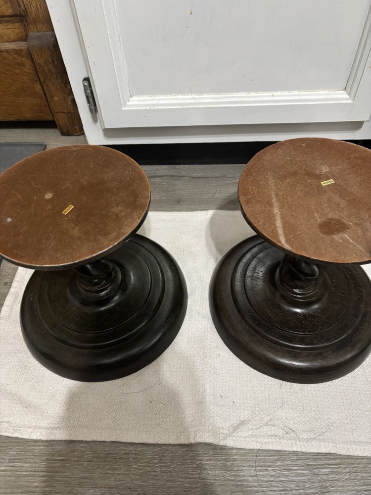 Southern Living At Home Pedestals (2). Wood. Heavy. Original Owner. I have used these as risers for Christmas displays, to hold pies, the list goes on. There are small areas to be touched up with wood paint marker otherwise in good condition. Please see pictures.
