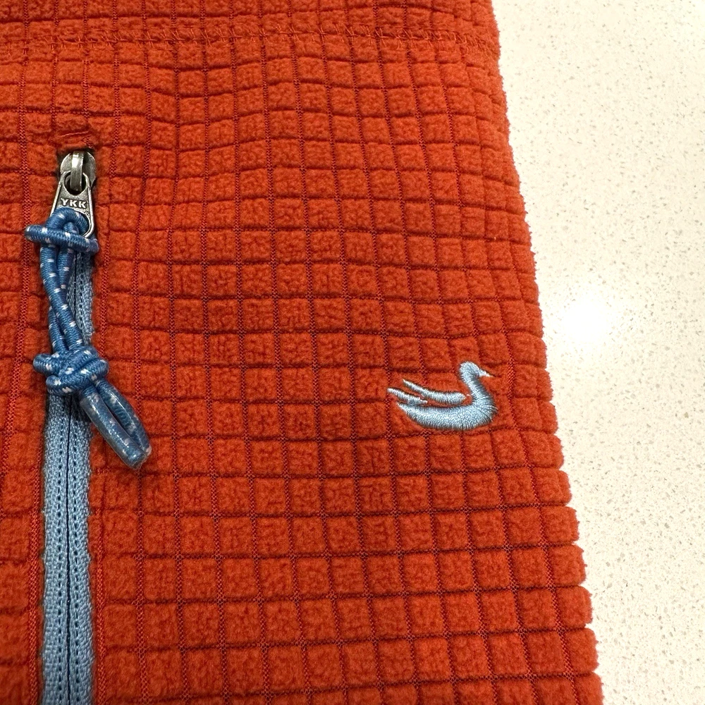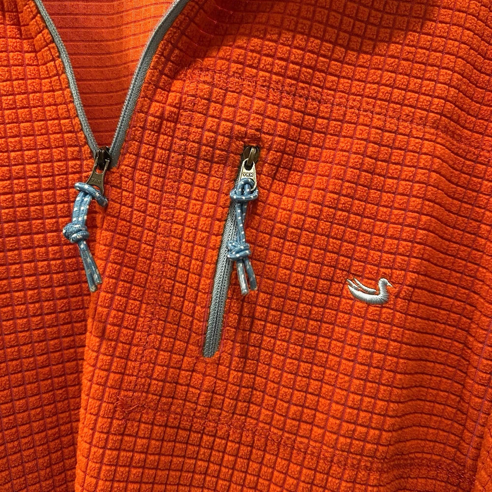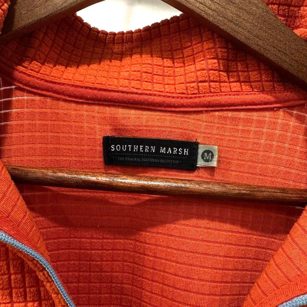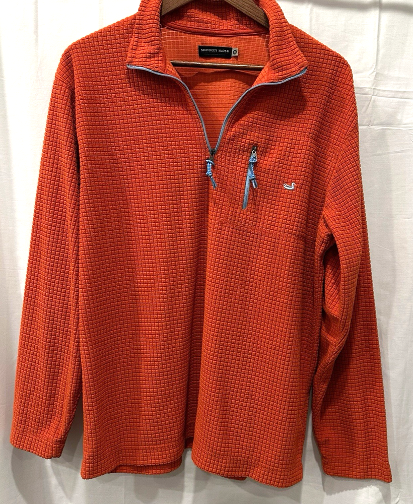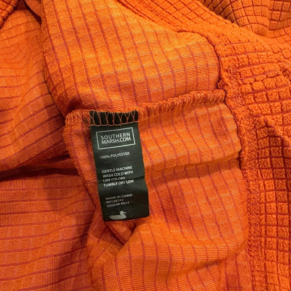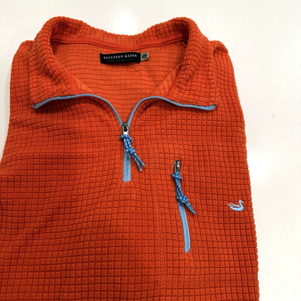 Southern Marsh Men's Medium Fieldtec 1/4 Zip Orange Pullover Waffle Fleece. Made of 100% polyester with a waffle-knit design, this pullover features a collared neckline,1/4 zip and a front zip breast pocket. Complete with embroidered logo. Sweater is in excellent condition. No holes or stains! Measurements (flat): Pit to Pit - 22in Shoulder (seam to seam) - 19in Top of Collar to Bottom - 30in Shoulder seam to Cuff - 24.5in Please use these measurements to compare with something you own before purchasing. This item will ship USPS Ground Advantage.