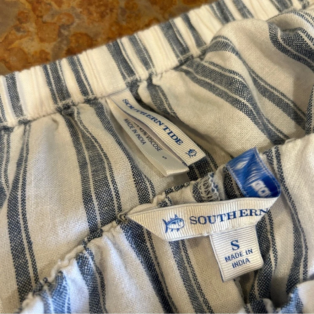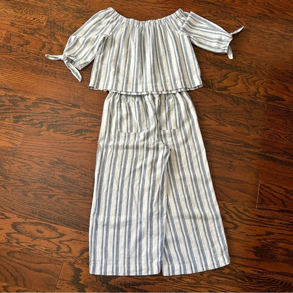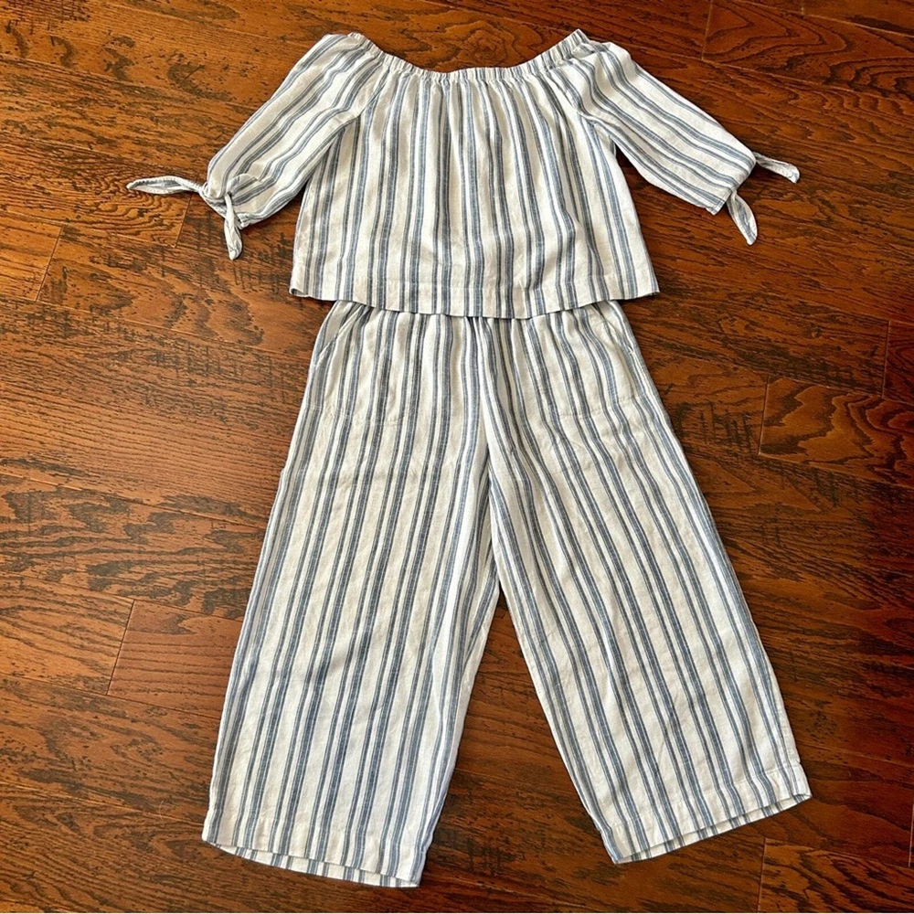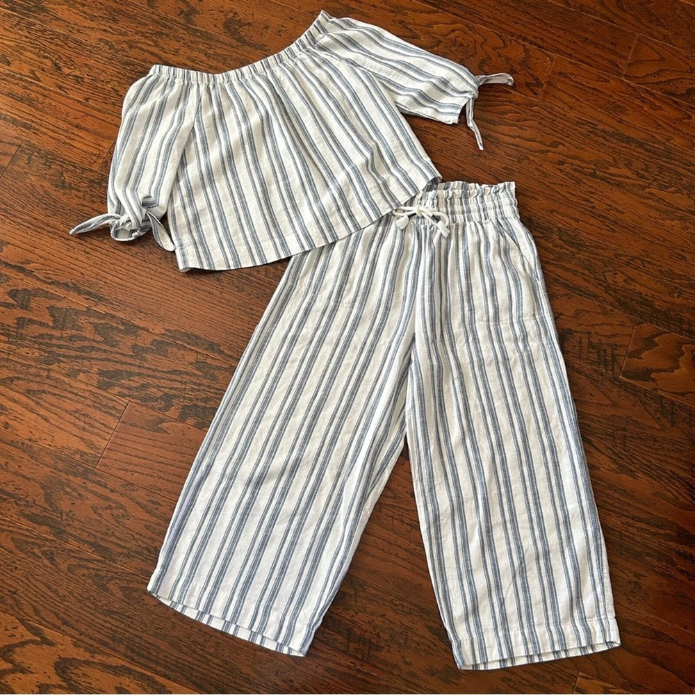 Southern Tide 2-Piece Set Crop Pants and off-the-shoulder Blouse Blue/White Stripes - Size Small Flawless - $175 Retail Elevate your daytime look with this Southern Tide striped wide leg crop pants and blouse set in Aged Denim Stripes. Easy-on drawstring waist provides ultimate comfort and the modern, cropped silhouette makes a great new addition to your wardrobe. The off-the-shoulder top has 3/4 sleeves with knots at hems. Regular fit. Top has off-the-shoulder neckline and three-quarter length sleeves. Allover stripe pattern. Tie detail on the wrist. Pants have crop length Wide Leg Ruffle edge on top of elastic waistband Front and back pockets Drawcord waistband 55% viscose, 45% linen. Machine wash, tumble dry Top approx. 19" armpit to armpit and 19" shoulder to hem Pants are 13/5" at elastic waist un-stretched 21" inseam and 22" leg opening Southern Tide Linen Blend 2-Piece Set Crop Pants and Blouse in Blue/White Stripes Size Small