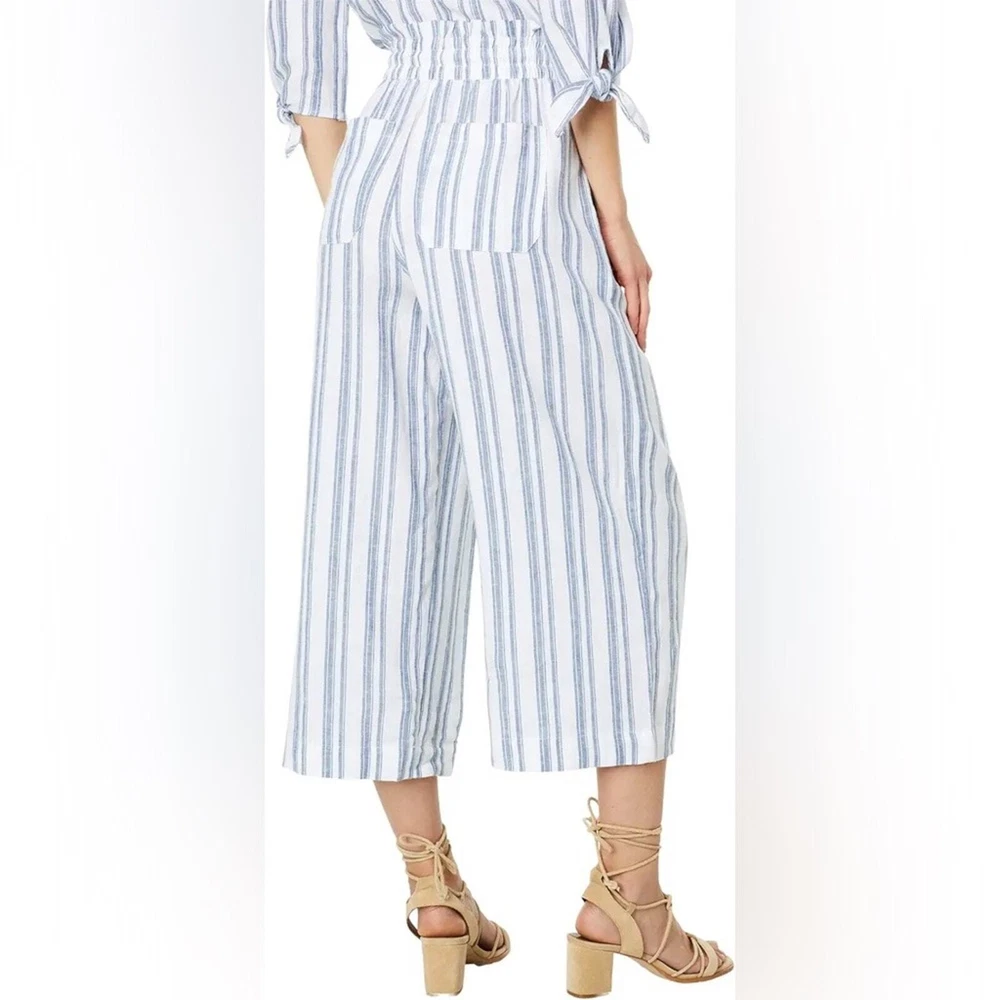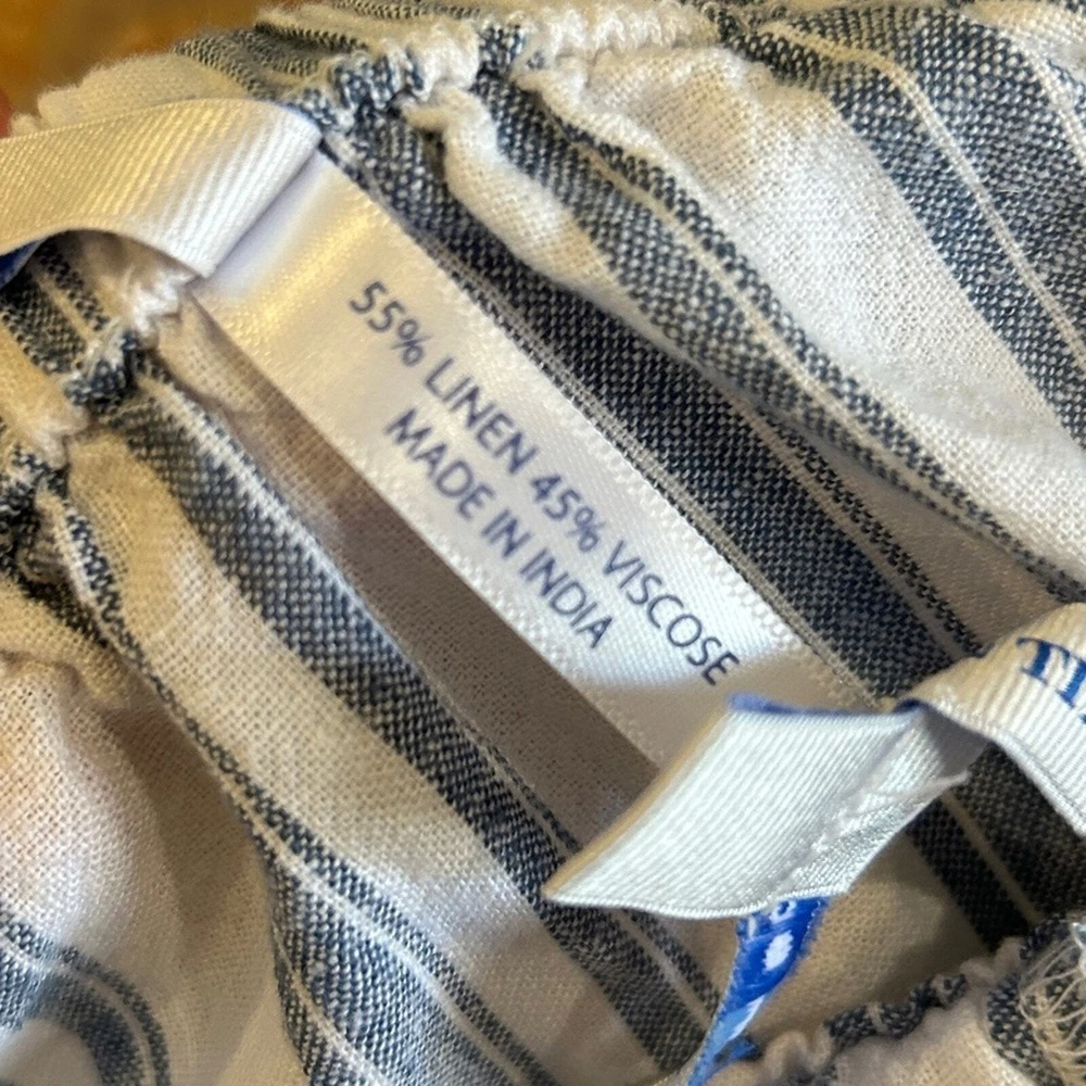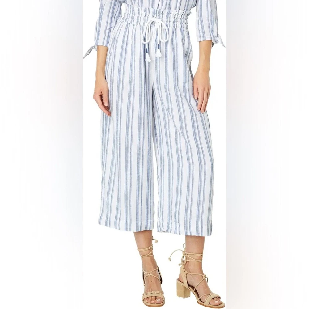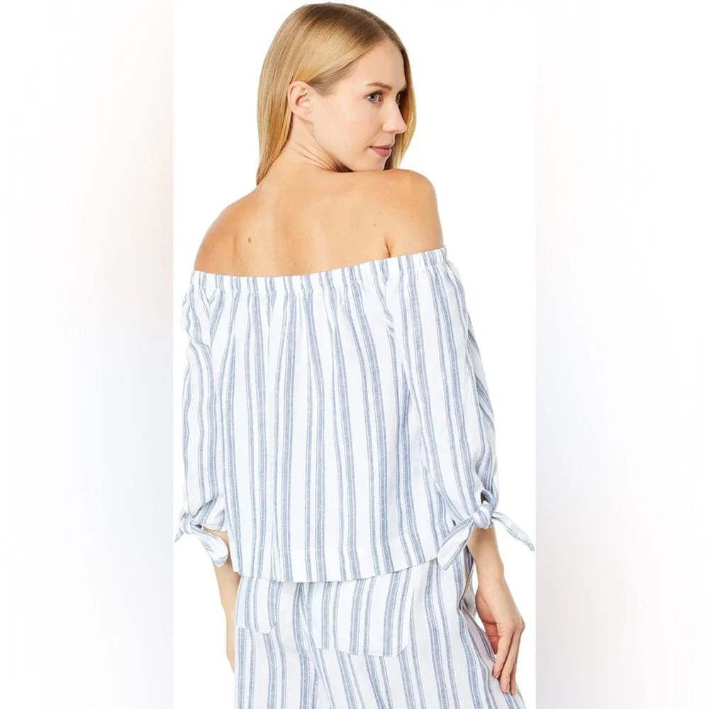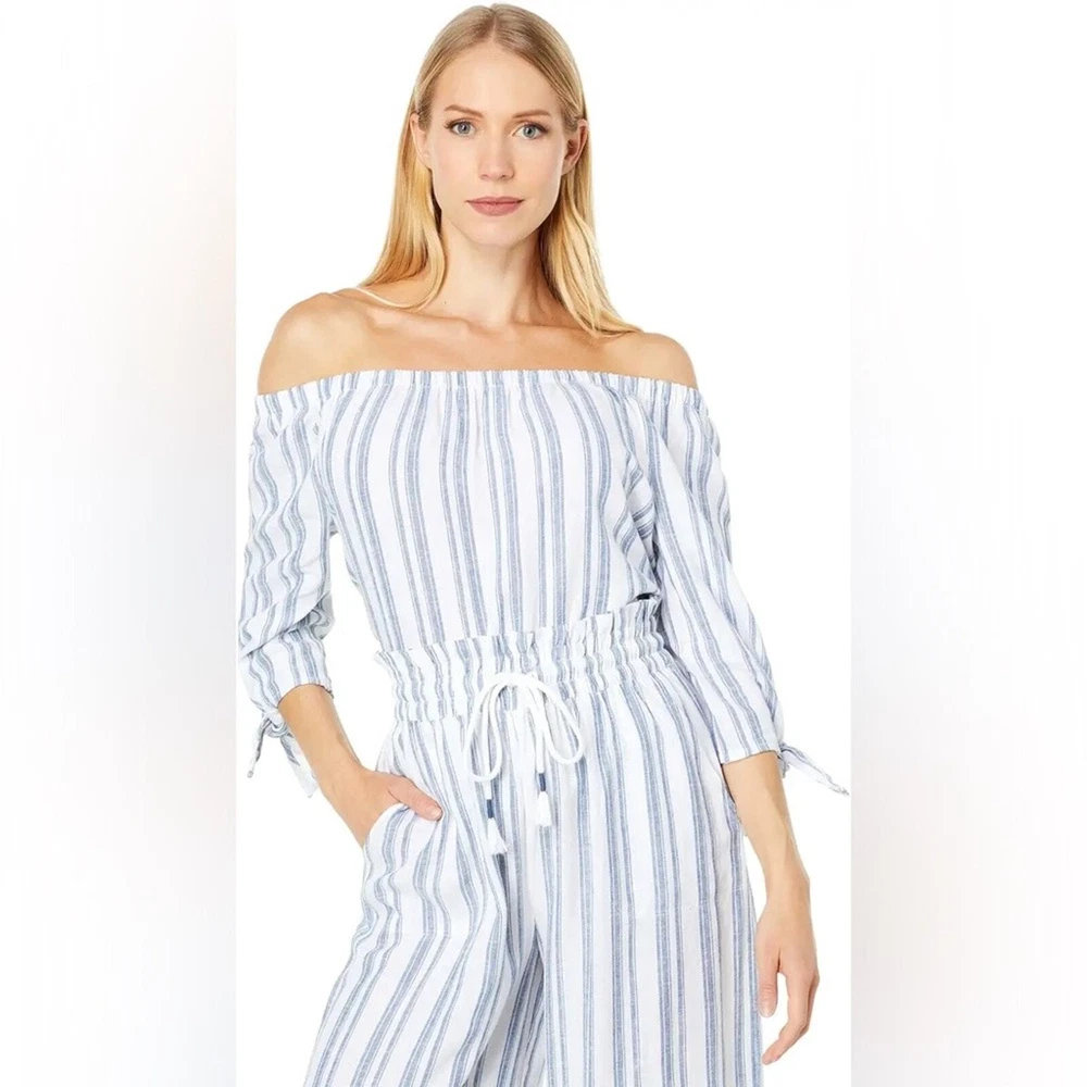Southern Tide 2-Piece Set Crop Pants and off-the-shoulder Blouse Blue/White Stripes - Size Small Flawless - $175 Retail Elevate your daytime look with this Southern Tide striped wide leg crop pants and blouse set in Aged Denim Stripes. Easy-on drawstring waist provides ultimate comfort and the modern, cropped silhouette makes a great new addition to your wardrobe. The off-the-shoulder top has 3/4 sleeves with knots at hems. Regular fit. Top has off-the-shoulder neckline and three-quarter length sleeves. Allover stripe pattern. Tie detail on the wrist. Pants have crop length Wide Leg Ruffle edge on top of elastic waistband Front and back pockets Drawcord waistband 55% viscose, 45% linen. Machine wash, tumble dry Top approx. 19" armpit to armpit and 19" shoulder to hem Pants are 13/5" at elastic waist un-stretched 21" inseam and 22" leg opening Southern Tide Linen Blend 2-Piece Set Crop Pants and Blouse in Blue/White Stripes Size Small
