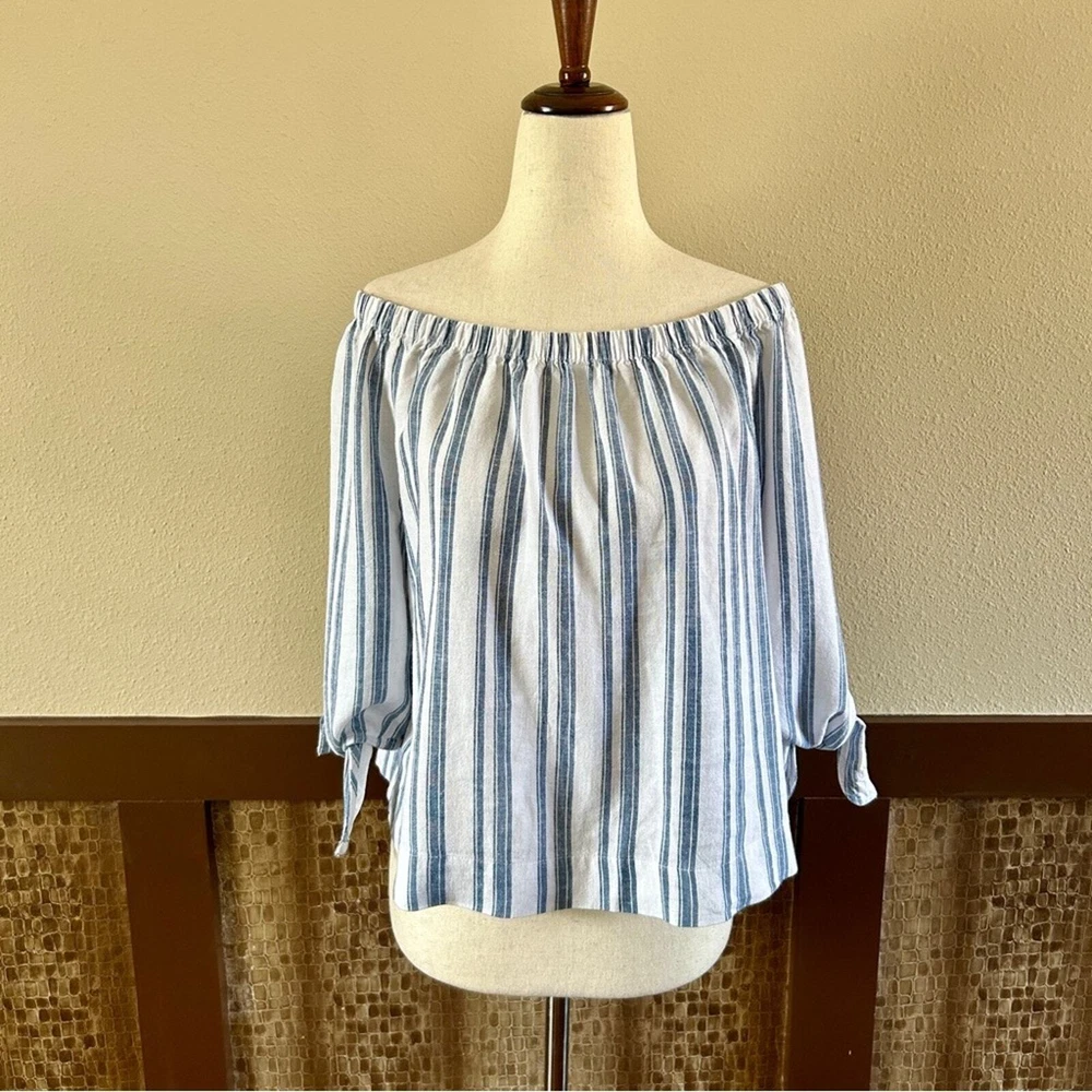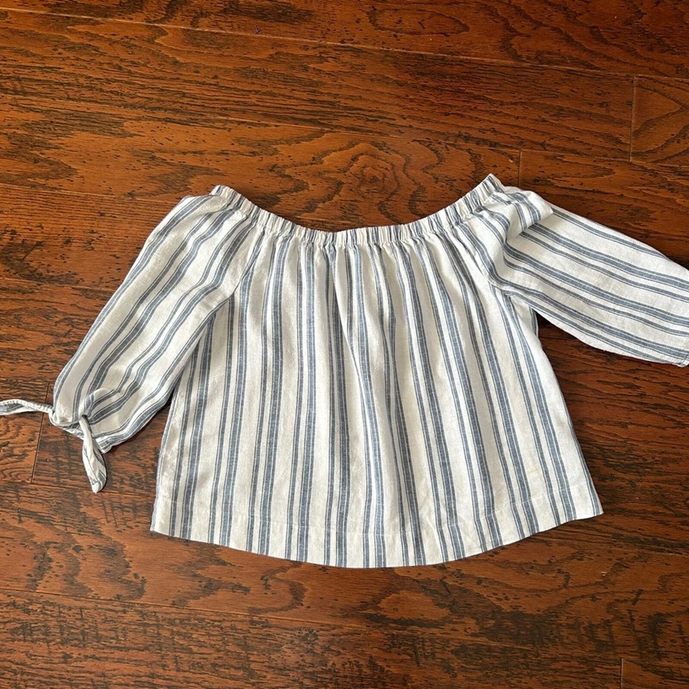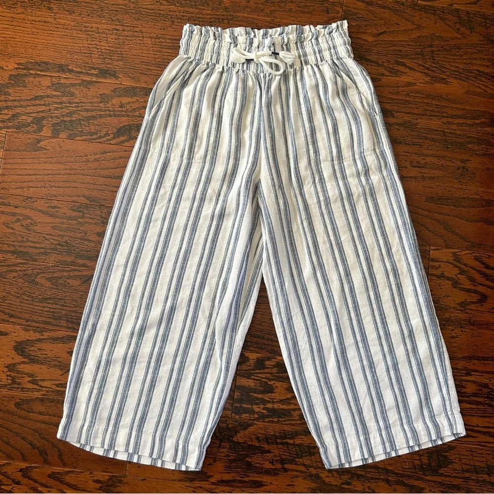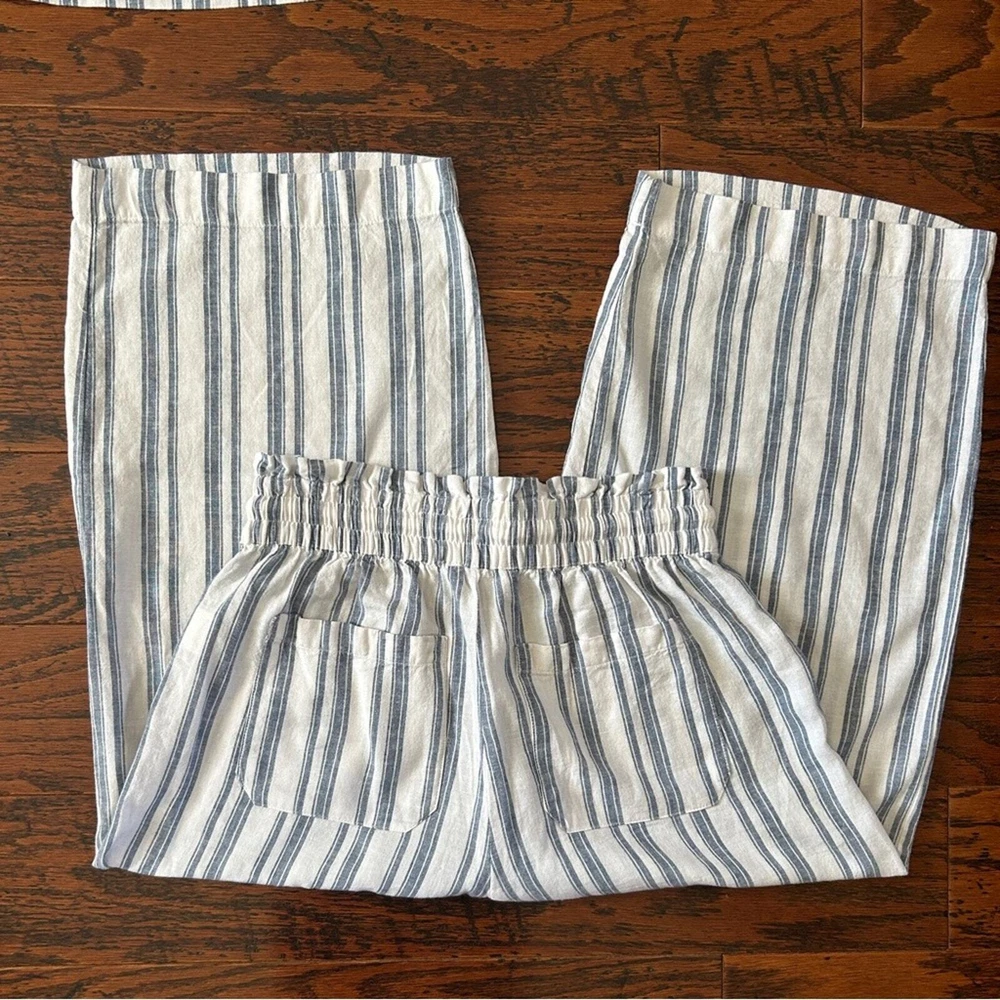 Southern Tide 2-Piece Set Crop Pants and off-the-shoulder Blouse Blue/White Stripes - Size Small Flawless - $175 Retail Elevate your daytime look with this Southern Tide striped wide leg crop pants and blouse set in Aged Denim Stripes. Easy-on drawstring waist provides ultimate comfort and the modern, cropped silhouette makes a great new addition to your wardrobe. The off-the-shoulder top has 3/4 sleeves with knots at hems. Regular fit. Top has off-the-shoulder neckline and three-quarter length sleeves. Allover stripe pattern. Tie detail on the wrist. Pants have crop length Wide Leg Ruffle edge on top of elastic waistband Front and back pockets Drawcord waistband 55% viscose, 45% linen. Machine wash, tumble dry Top approx. 19" armpit to armpit and 19" shoulder to hem Pants are 13/5" at elastic waist un-stretched 21" inseam and 22" leg opening Southern Tide Linen Blend 2-Piece Set Crop Pants and Blouse in Blue/White Stripes Size Small