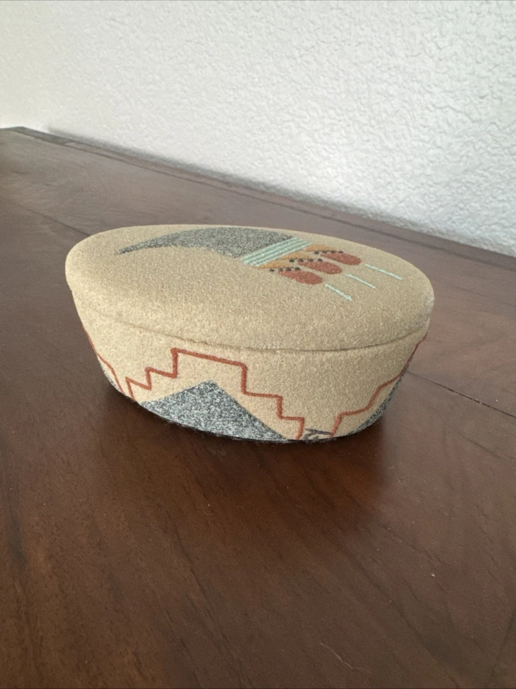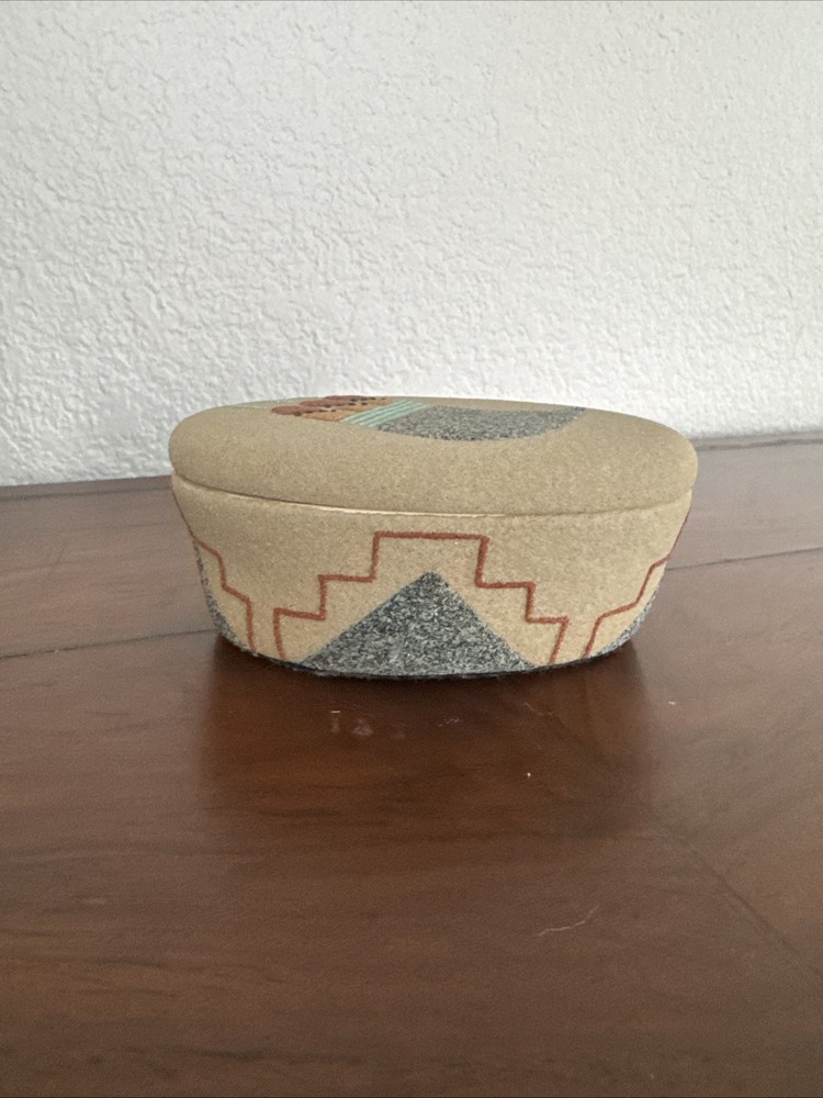 Add a touch of Southwestern charm to your home with this beautiful oval lidded trinket box. Crafted with a textured sand art finish, it features earthy desert tones with a tribal-inspired feather motif on the lid and geometric designs around the sides. This piece is perfect for storing jewelry, keepsakes, or small treasures, while also serving as a decorative accent for any rustic, boho, or Native American-inspired decor. ✅ Features: • Handmade sand art-style trinket box • Oval shape with fitted lid • Tribal feather motif with geometric Southwestern patterns • Felt-lined bottom to protect surfaces • Great for jewelry, keepsakes, or decorative use 📏 Dimensions (approx.): • Length: ~6–7 inches • Width: ~4 inches • Height: ~2–3 inches 🎨 Condition: Pre-owned and in excellent condition with no chips or cracks. Please see photos for details. Southwestern decor, sand art trinket box, handmade jewelry box, boho rustic keepsake, Native American style decor, desert motif, tribal feather design, rustic oval box