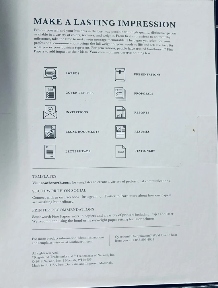 This Southworth Fine Business Paper is a high-quality product that is perfect for various collectibles, paper, and stationery needs. With a watermarked design and made of 100% cotton, this paper is durable and reliable for everyday use or special occasions. The 24lb weight and 100 sheet count provide ample paper for all your needs. This item has been carefully crafted to meet the highest standards of quality and is sure to meet all your expectations. Whether you are looking for a specialty paper for a unique project or just need a reliable option for everyday use, this Southworth Fine Business Paper is an excellent choice.