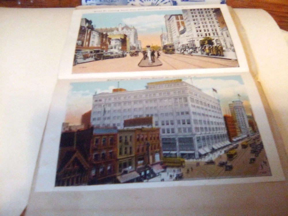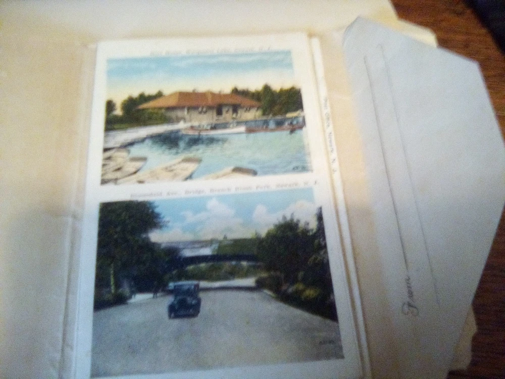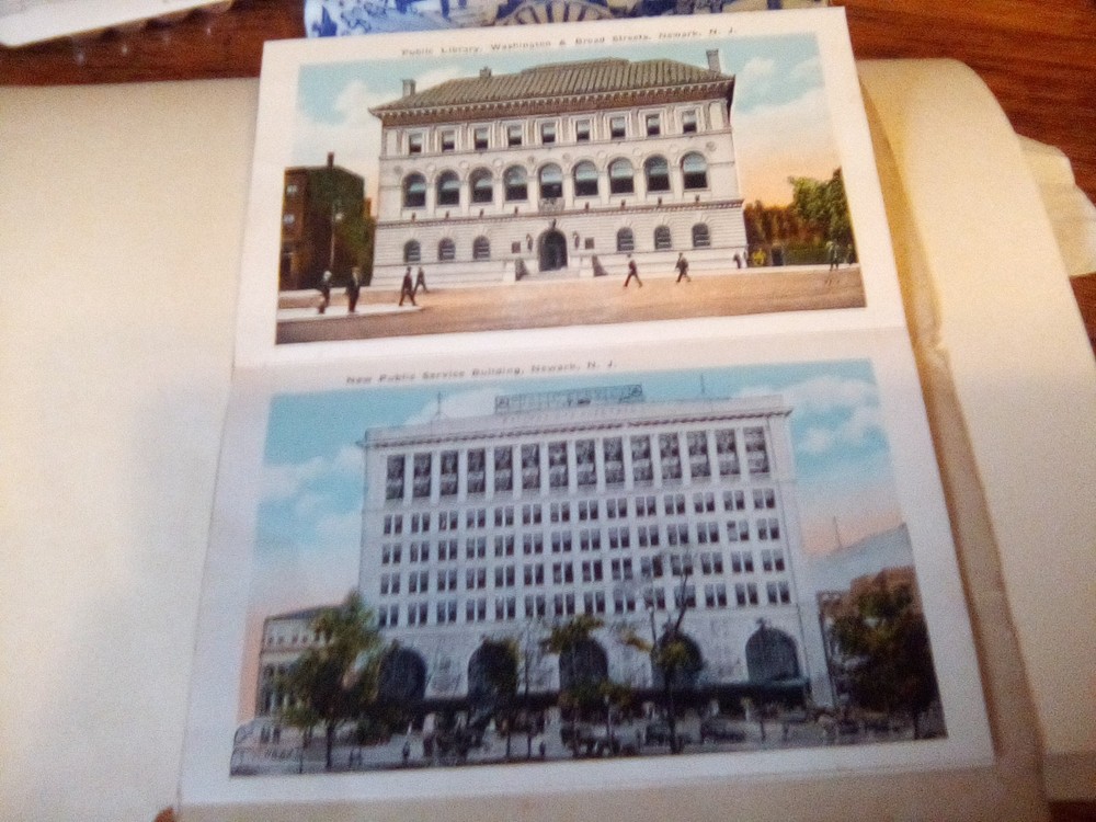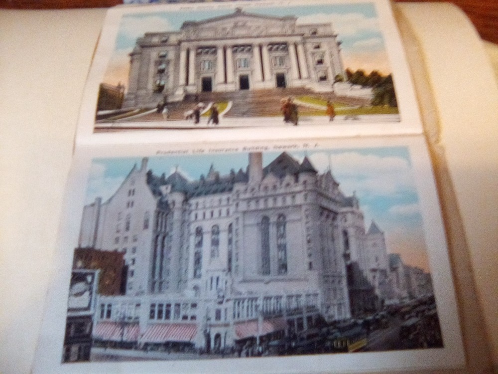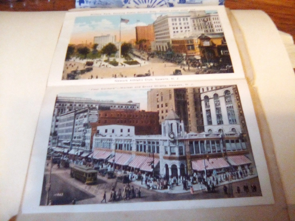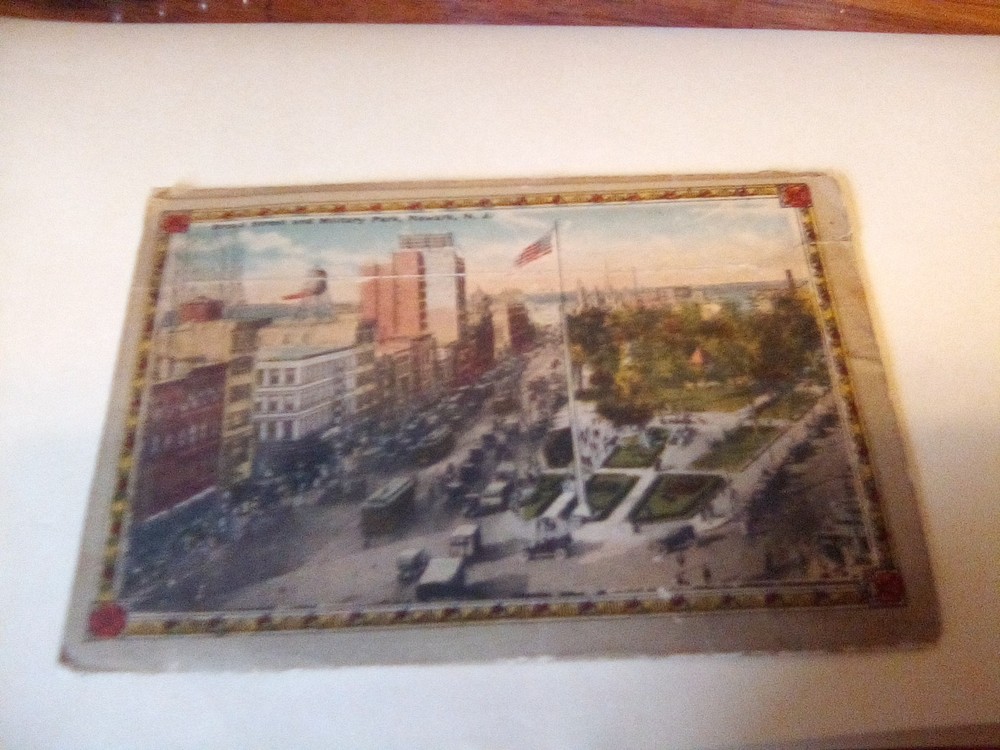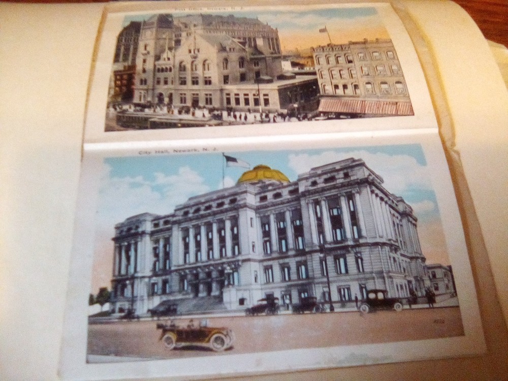 The product is a souvenir folder featuring a postcard of Newark, New Jersey, posted in 1926. This original lithograph print measures 6 x 4 inches and showcases a roadside attraction in the city. The postcard captures aspects of tourism, travel, landscapes, architecture, famous places, transportation, and historical figures from the early 20th century. Made of paper and originating from the United States, this collectible item is a unique piece of history from a specific time period and location.