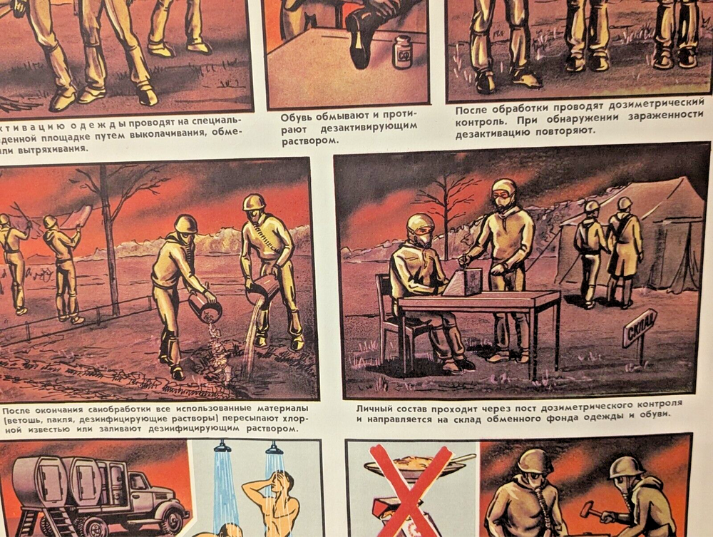 Soviet Radiation Propaganda Poster Poster Original The inscription on the poster: "Sanitary treatment of personnel after a nuclear explosion" Dimensions: Length: 25 inches OR 60 CENTIMETERS Height: 16 inches OR 43 CENTIMETERS Cosmetic condition: see photos Send the next day after payment. Send the track code. I combine items, so you can save on shipping by ordering two or more lots. Items are well packed. Payment via PayPal. I'm glad that you are interested in lots that I sell. Wish you a good shopping.