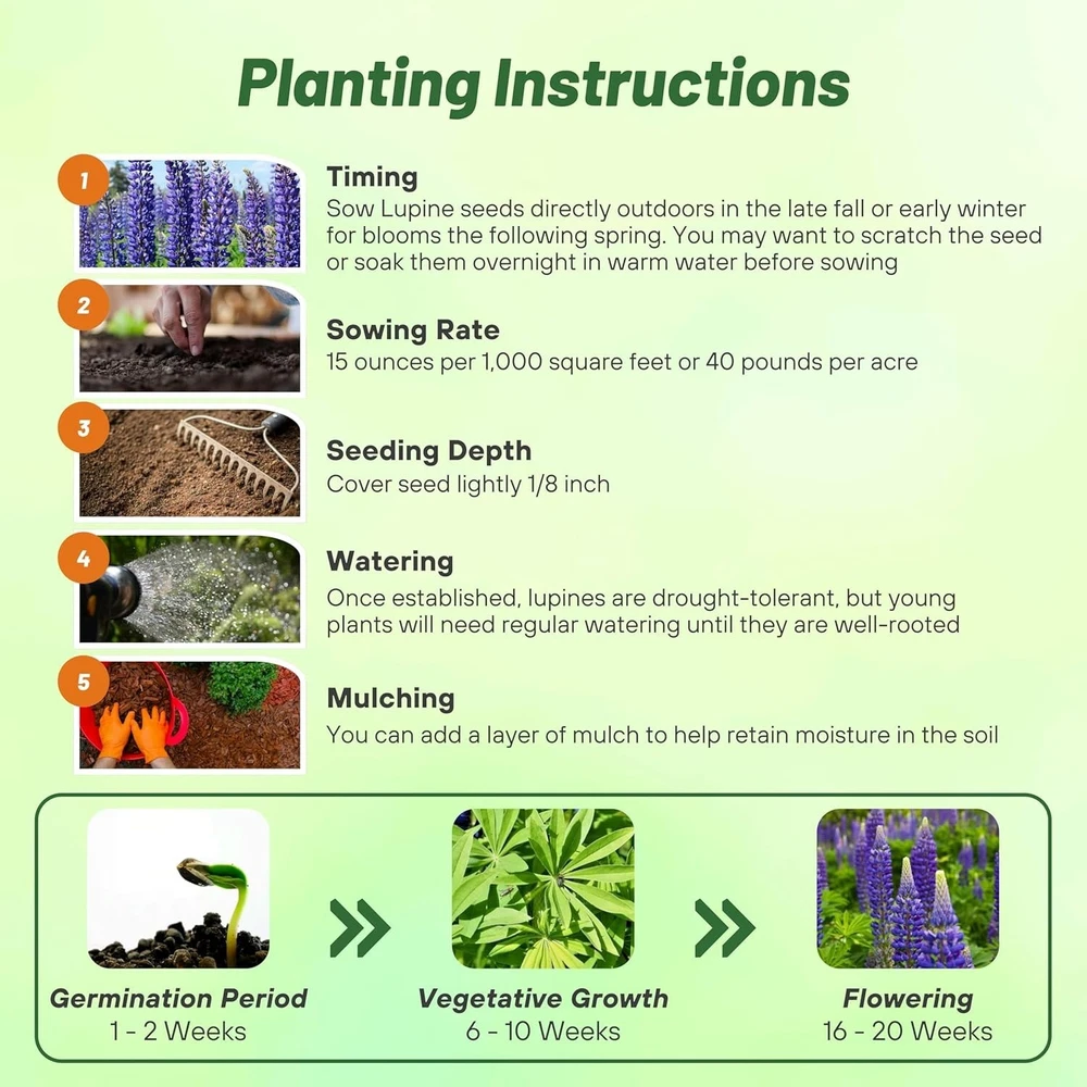 Sow 1 lb of Blue Lupine Seeds - Low Maintenance Perennial Flower for Gardens ‹ › ‹ › ‹ › ‹ › ‹ › ‹ › ‹ › ‹ › ‹ › ‹ › ‹ › Sow 1 lb of Blue Lupine Seeds Low Maintenance Perennial Flower for Gardens Overview: The perennial lupine, scientifically known as Lupinus perennis, is a stunning and resilient flower that can thrive in USDA zones 3 - 9. Whether left to flourish in the wild or nurtured in your garden, these beloved wildflowers will enhance your landscape with their striking beauty while contributing positively to the soil by fixing nitrogen. Key Characteristics: Height: Can reach up to 36 inches, creating a lovely vertical element in your garden. Wildlife Friendly: Known for attracting butterflies and hummingbirds, offering a vibrant spectacle of nature. Low Maintenance: Once established, lupines require minimal watering, making them a drought-tolerant option. Early Summer Bloomer: Enjoy a burst of color right at the start of summer, brightening up the garden space. Deer Resistant: These handsome flowers are unappealing to deer, ensuring your garden remains untouched. Planting Instructions: Soak seeds in water for 24 hours prior to planting to soften the seed coat. Start seeds indoors 6–8 weeks before the last frost, with a germination time of approximately 14 days at 68°F. Plant open-pollinated, heirloom, non-GMO seeds at a rate of 1 pound per 1,000 square feet or 40 pounds per acre. Space plants 18–24 inches apart for optimal growth. For areas with a long growing season, seeds can be sown directly outdoors after the last frost. Preferred conditions: full sun to partial shade, with well-drained soil for flourishing growth. Why Choose Blue Lupine Seeds? Transform your garden into a serene, beautiful haven that attracts delightful wildlife while requiring minimal care. Blue Lupine offers not just aesthetic value, but a sustainable approach to gardening. Ideal for pollinator gardens, naturalized landscapes, and as a striking addition to floral displays, these seeds are a must-have for any gardener looking to create lasting beauty in their outdoor spaces. Immerse yourself in the joy and ease of cultivating Blue Lupine – sow your seeds today and watch your garden come alive! Shipping Free & Fast Shipping - We offer free shipping to most of the USA with a normal delivery time of 3-7 days. However, due to the current situation, additional delivery time (up to 3 weeks) may be required for some items. Alternative Carriers - We may use alternative carriers (e.g. USPS, FedEx, UPS, etc.) to ensure your package arrives safely and on time. Due to the use of multiple carriers, we are unable to provide a tracking number automatically. Handling Time - Orders are processed and shipped within 1-2 business days of receiving cleared payment. Shipping Restrictions - Shipping to Alaska, Hawaii, Puerto Rico, Guam, and other US territories may incur shipping charges or delivery restrictions. Please contact us before ordering, or your order can be refunded/cancelled. State Restrictions - There may be restrictions based on your state of purchase. For example, certain items may not be shipped to California due to state regulations. Contact for Tracking Updates - If you require tracking updates or have any concerns about the delivery of your order, please feel free to contact us, and we will be happy to assist you. Return 30-Day Hassle-Free Returns - We want you to be completely satisfied with your purchase. If you are not, you can return the item within 30 days of receiving it for a full refund or exchange. Easy Return Process - To start a return, simply contact us and we will provide you with a prepaid return shipping label and detailed instructions. Restocking Fee - There are no restocking fees for returns. However, the buyer is responsible for return shipping costs if the return is not due to a seller's error. Refund Processing Time - Refunds will be processed within 5 business days of receiving the returned item in its original condition. Payment We accept all major credit cards, PayPal, and Apple Pay for your convenience. Your payment information is secure and encrypted to ensure a safe and seamless transaction. Please complete your payment within 3 days of purchase to avoid any delays in shipping. Feedback Your feedback is extremely important to us. We strive to provide the best products and customer service possible. If you are satisfied with your purchase, please take a moment to leave us a positive review. If you have any concerns or issues with your order, please contact us before leaving negative feedback. We are committed to resolving any problems and ensuring your satisfaction. Contact Us If you have any questions or concerns, please feel free to reach out to our customer support team. You can contact us through the eBay messaging system. We are available Monday to Friday, 9:00 am to 5:00 pm EST, and we will do our best to respond to your inquiry within 24 hours. Thank you for supporting our small family business! UPC: Not Set Unit Quantity: 1 lb. Features: Perennial,attractive to butterflies,attractive to hummingbirds,drought tolerant,fix nitrogen in soil,germination in 14 days,heirloom seeds,nitrogen-fixing,open pollinated,seasonal bloomer,shrub-like foliage,tall erect stems Season of Interest: Fall,Spring,Summer Sunlight: Full Sun,Partial Sun Climate: Not Set Color: Blue Soil Type: Loam Brand: Unbranded Type: Flower Seeds Common Name: Lupine Genus: Lupinus Life Cycle: Perennial Watering: Light Indoor/Outdoor: Outdoor Cultivating Difficulty: Easy MPN: Not Set Country/Region of Manufacture: Not Set Growth Habit: Erect Soil pH: Not Set Planting Time: Not Set Unit Type: lb