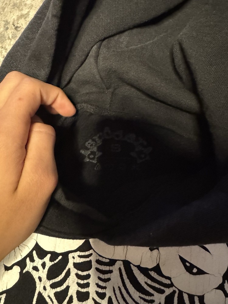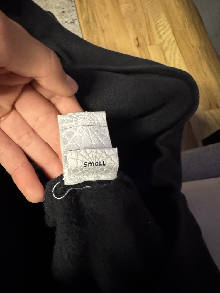 The Sp5der Men's Hoodie in size Small is a stylish and comfortable pullover made from cotton fleece material. This black and white graphic print hoodie features a round neckline, long sleeves, and a hood for added warmth. Ideal for winter, fall, and spring seasons, this hoodie is machine washable and suitable for casual wear or basketball activities. Made by the brand sp5der, this hoodie is a real authentic piece with a regular fit and a classic pullover style.