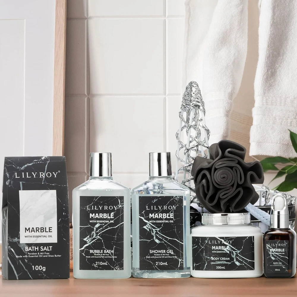 7 PCS GIFT BASKETS FOR YOUR LOVER: This complete gift set contains premium facial skin care products w/ 210 mL Shower Gel, 210 mL Bubble Bath, 200 mL Body Cream, 100 g Bath Salt, 30 mL Bath Oil, Bath Puff SANDALWOOD & OAK SPA GIFT BASKET: This gift set for your lover with our sandalwood and oak fragrance has a cool, woody, fresh flavor. Body wash and bubble bath helps prevent body odor and have a long-lasting unique scent of wood BETTER FOR YOU INGREDIENTS: Take care of your skin with LILY ROY skincare products. Our kit has the highest quality ingredients like lavender essential oil, shea butter, and vitamin E to help moisturize and soothe the skin. No testing on animals. Vegan, Mit-free, Paraben-free lavender essential oil, shea butter, and vitamin E to help moisturize and soothe the skin PERFECT GIFT BOX FOR LOVER: Great gift choice for Valentine's Day, Father's Day, Mother's Day, Anniversary, Birthday, and Christmas. The recipient will like it. Birthday gifts for men & women COMES WITH A REUSABLE BASKET: The skincare and bath gift set has an upscale and beautiful BASKET, making a multi-purpose storage solution to keep your beauty essentials. It also has a gift note card for you to personalize it Smoothing, Moisturizing, Nourishing, Softening, Brightening, Cleansing