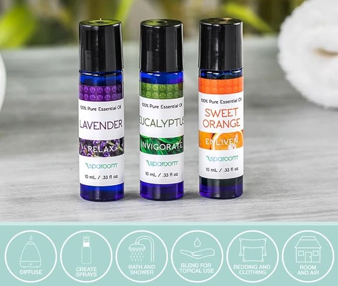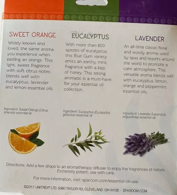 Scent: Eucalyptus, Lavender, Sweet Orange Volume: 10 ml Brand: SpaRoom Features: Diffuser For: Aromatherapy Container Type: Dropper Bottle Number in Pack: 3 Type: Essential Oil