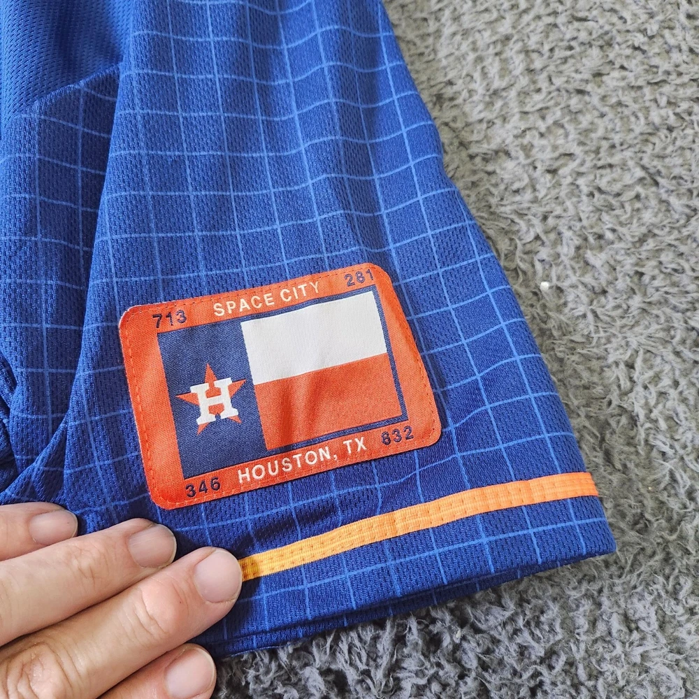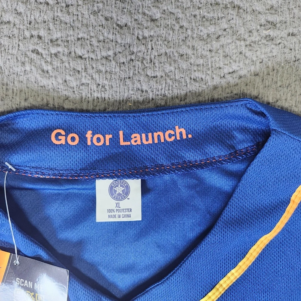 This Space City Houston Astros Hader 71 Jersey in XL features vibrant colors and quality construction, ideal for showcasing team spirit. • Button-down closure • Short sleeves • "Go for Launch" collar text • 100% polyester • Made in China • Official Astros logos • LevelTX branding