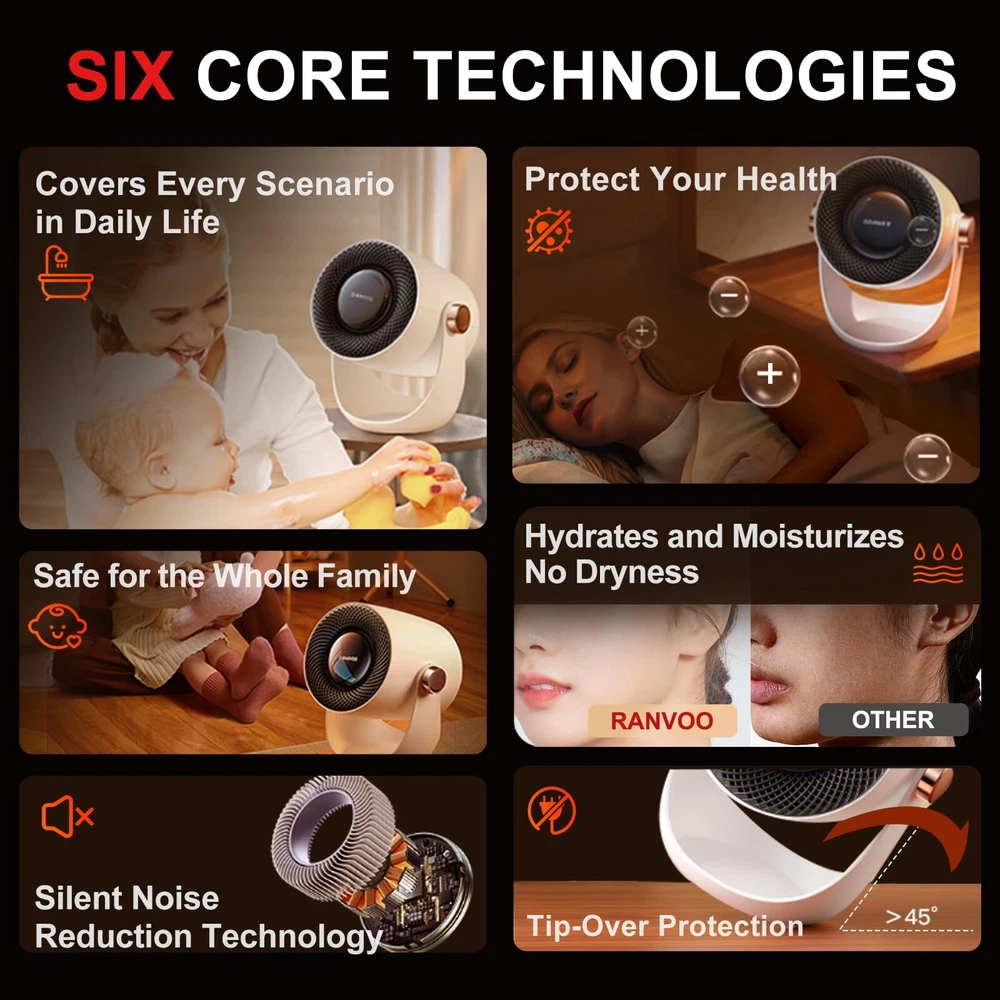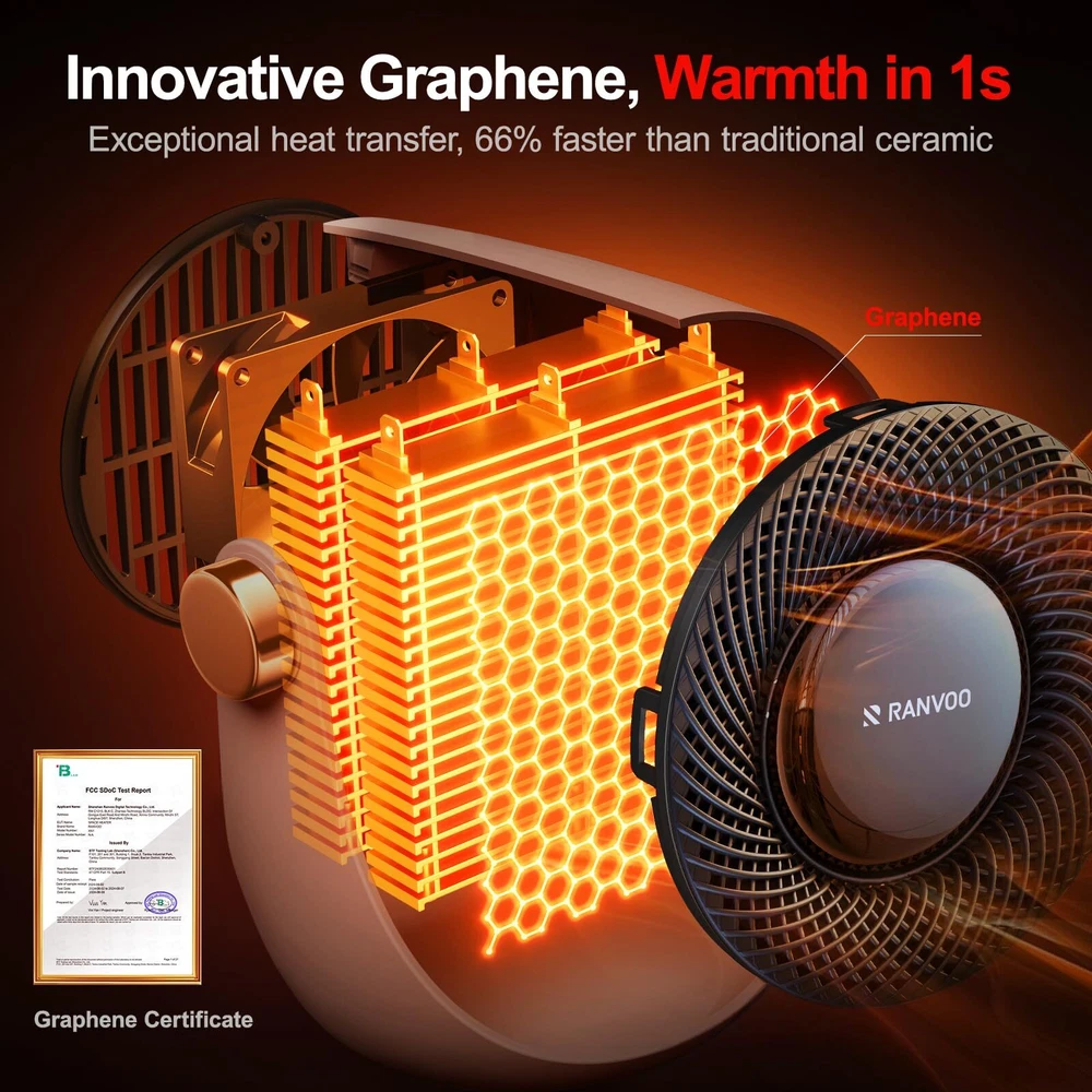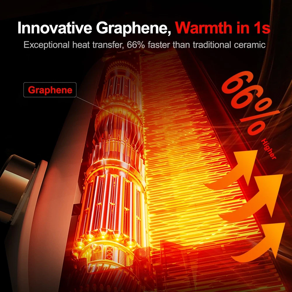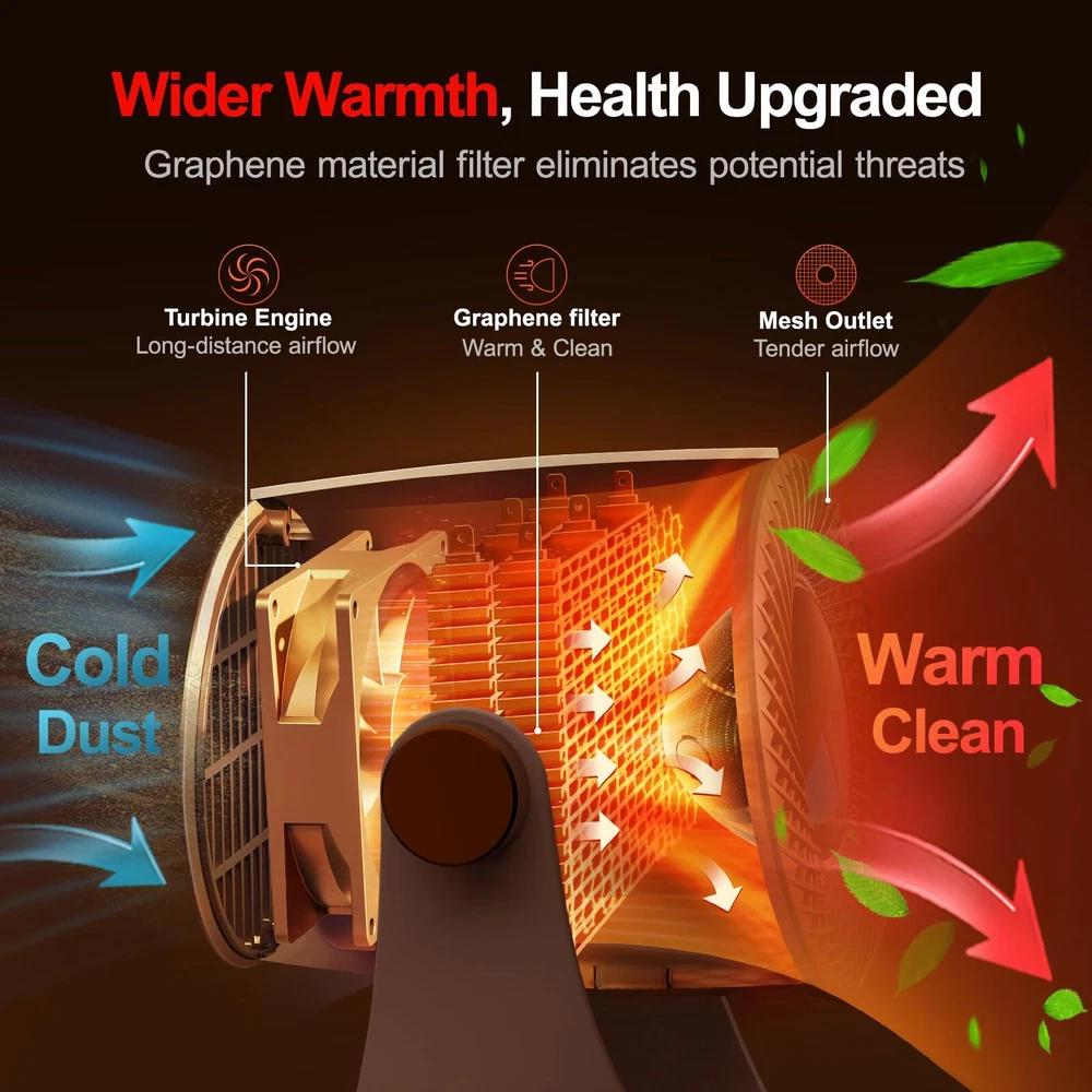 【Heating, Plus Purify Function, Guard Your Safe】Our graphene heater is a great choice as its graphene net can filter the “large particles of dust - like after conflagration" while heating. More important, graphene has purifying property itself. 【Best Gifts】The heater is perfect gifts for mom, dad, and coworker. It’s suitable not only gifts for women but also gifts for men as Valentines, Christmas, New Year, Thanksgiving, and birthdays! 【Instant Heat in 1-s】Unlike ceramic heaters, this graphene heater delivers swift and even heat distribution, achieving true 1-second fast heating. The space heater is engineered with advanced and valuable graphene, a material prized for its exceptional thermal conductivity and commonly used in high-tech applications. With graphene, the heater quickly reaches 1500W for rapid warmth upon activation, then efficiently reduces to 1000W to maintain a comfortable, energy-saving airflow 【Warm Where You Need】This space heater is designed to be adjustable up and down 120°, ensuring you can manually direct heat exactly where it's needed. Unlike fixed-angle heaters, this feature allows you to expand the warmth coverage, making it perfect for heating larger areas. For example, if you want to warm your hands while working, you can adjust it downward to your hands. When you want to warm your legs, you can place this small heater for office under desk and adjust it upward to your legs 【Overheat & Tip-over Protection】With advanced IC technology and a 45° tilt sensor ball, the space heaters for indoor use offer both overheat and tip-over protection, even if knocked down by kids or pets. The IC monitors the environment's temperature and disconnects the circuit if it exceeds a preset safety limit. The 45° tilt sensor cuts power when the angle exceeds 45°, and the heater resumes working once upright. This is a unique design, ensuring safety and reliability at home 【Quite & Healthy Lifestyle】This space heaters for indoor use adopt a bladeless design, so there will be no rumbling sound of the fan blades when they are working, making emits less than 30 decibels of noise. Additionally, the graphene coating can isolate most bacteria, ensuring the heater blows only healthy air, further safeguarding the health of you and your family. Perfect for creating cozy moments in your bedroom during winter 【Energy Efficient & Easy to Use】This space heater is designed for energy efficiency, consuming less than 3 kWh overnight, significantly lower than typical heaters. The key to this efficiency is graphene, which offers a much faster thermal reaction than ceramic. Graphene heats up almost instantly and cools down quickly, minimizing energy waste. Weighing just 2 pounds, this portable heater is easy to move, and the simple knob controls three modes: Fan (Summer), Heat I (800W), and Heat II (1000W) 【Professional Support】's goal is to provide the nice service and ensure you are satisfied with this mini space heater. We value your cooperation and look forward to resolving any issues for you. Please contact us via the Amazon Message Center for any concerns such as unwanted, wrong item or defective item. Steps here: Your Orders → Click the Detail Page of the Product You Purchased → Click in the Store → Ask a Question