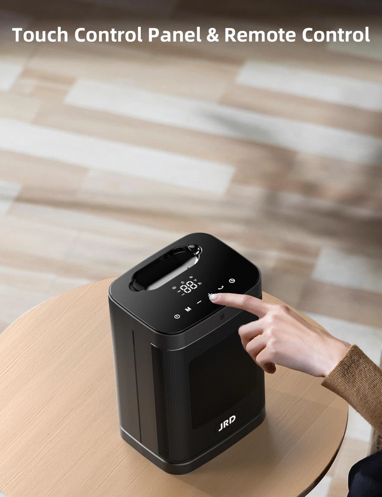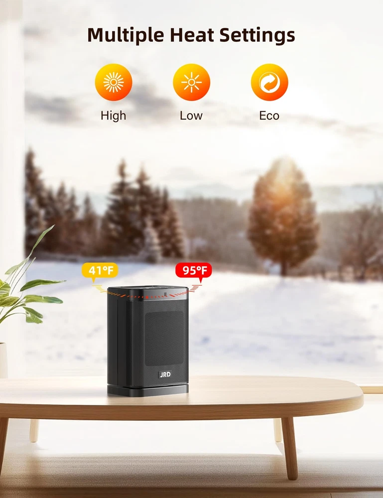 Rapid Heating: This 1500W space heater delivers warmth quickly with advanced PTC ceramic technology. The heating areas are up to 200 square feet. Warm from Every Angle: The 80° wide-angle oscillation covers the entire area, offering even heat for your bedroom, garage, basement, office, desk, and more. It operates quietly and keeps comfortably warm without disrupting your sleep or work. Operation Modes: This electric heater has 3 energy-efficient modes ( Low-900W, High-1500W, and ECO) that cater to different heating needs. The ECO mode automatically adjusts the heating level based on the room temperature, providing precise warmth. Precise Temperature: Adjust temperatures from 41 to 95℉ in 1℉ increments in Low or High mode, set a timer (1-12h), and mute function to customize your comfort at the touch of a button. Easy to Use: This heater is designed with an intuitive LED touch-screen, making you clearly view the heating status. It comes with a remote control allowing you to adjust the settings from anywhere in the room. Safety Protection: This space heater for indoor use has essential safety features, including ETL-certified, tip-over and overheating protection and an enhanced safety plug. The child lock function allows parents to lock this portable heater for their children and pets. Compact & Portable Design: This desk heater is easy to carry around indoors and fits in the bedroom, living room, or office, providing warmth and comfort where you need it.