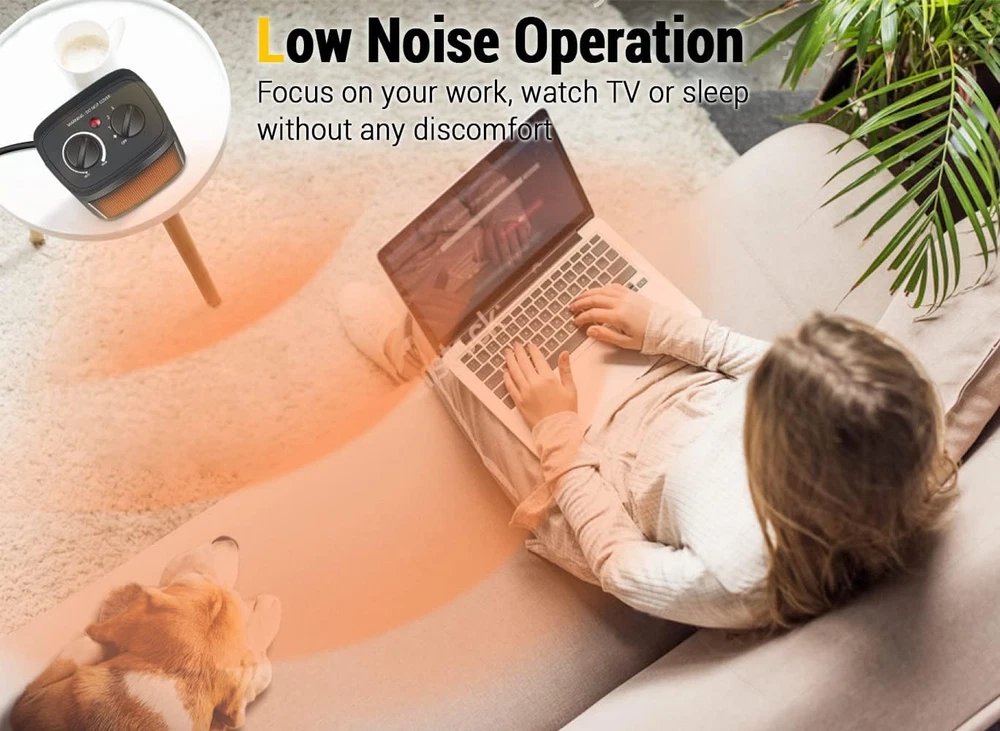 GET NICE & TOASTY FASTER: The advanced PTC ceraming heating technology combined with the ultra-efficient fan will heat up any space faster and distribute the heat more evenly. Just turn on your space heater, count to 3, and enjoy your warm living room, bedroom or office. CUT DOWN ON ELECTRIC BILLS without having to freeze. Our energy-efficient interior space heater features 3 different heat settings (LOW, MEDIUM, HIGH) as well as a fan-only mode, so you can tailor it to your exact needs. Instead of wasting a fortune on central heating, you can warm just the spaces you actually use. ADJUST THE TEMPERATURE TO YOUR NEEDS: Equipped with an adjustable thermostat, our space heater will keep you comfortable at all times. Just set the dial to the desired heat setting and let the thermostat monitor the surrounding air temperature and keep you comfy. PERFECT FOR YOUR HOME OR OFFICE: The compact and portable design combined with the ergonomic built-in handle, will allow you to easily move your space heater to any room you want. Make sure your office, kitchen, bedroom, guest room, study or living room is nice and warm. YOUR PEACE OF MIND IS OUR PRIORITY: We have ensured the safety of you and your loved ones by adding an advanced overheat protection sensor as well as a smart tip-over switch, which will automatically turn off the heater in case it overheats or gets tipped over by your kids or pets. NOTE:Before purchasing the heater, please check the User Guide in the Product Guide and Documentation. Product Description Go From Chilly To Toasty In 3 Seconds! Now you don't have to settle for costly central heating or cheaply-made space heaters anymore. The Aikoper space heater is here to take all the fuss out of heating your home or office. The 3 different heating modes (Low, Medium & High) combined with the fan-only function and adjustable thermostat will help find the ideal temperature for every occasion. Plus, ultra-convenient portable design will allow you to take it with you everywhere. Advanced Safety Features Rest assured that your space heater comes equipped with state-of-the-art safety features, which include a smart tip-over protection feature and a reliable overheat protection feature for your peace of mind. Specification: Model No.: NT15-20A Voltage: 120V, 60Hz Thermostat: Yes Package Dimensions: 6.77x5.59x9.17 inch Product Dimensions:6.4D*4.8W*9.09H in Fan Speed:2500rpm (One Speed) Perfect For All Four Seasons! Use the Low setting in spring, the Medium setting during chilly fall months, the High setting in winter, and cool off during summer with the fan-only mode. Lightning-Fast Heating Function! You will not even get to three-Mississippi and your office or bedroom will be nice and toasty. That's how fast this space heater will work! Tip: Use at a distance of 1.8 feet for better warmth. Handy Adjustable Thermostat! Take the guesswork out of controlling your space heater and adjust it to the comfortable temperature you and your loved ones want. Save Precious Desktop Real Estate! Boost your productivity and enjoy the warm air by placing your compact space heater on your coffee table or office desk. <45dB Sound Level! Ideal for reading, working, listening to music, watching TV, doing homework, taking a nap or sleeping at night, our low noise space heater will not disturb you, your kids or your neighbors. Reliable Safety Features! This electric space heater comes with an ETL certification, which ensures that it is safe for daily use. Perfect for families with curious pets and active toddlers, our easy-to-use space heater features tip-over and overheat protection.