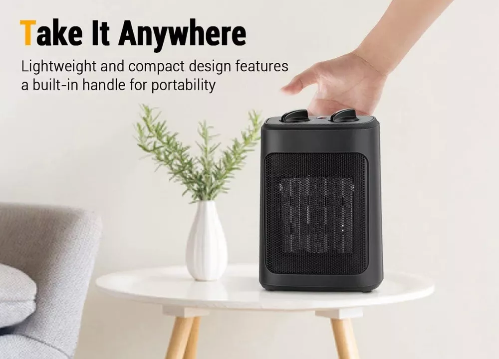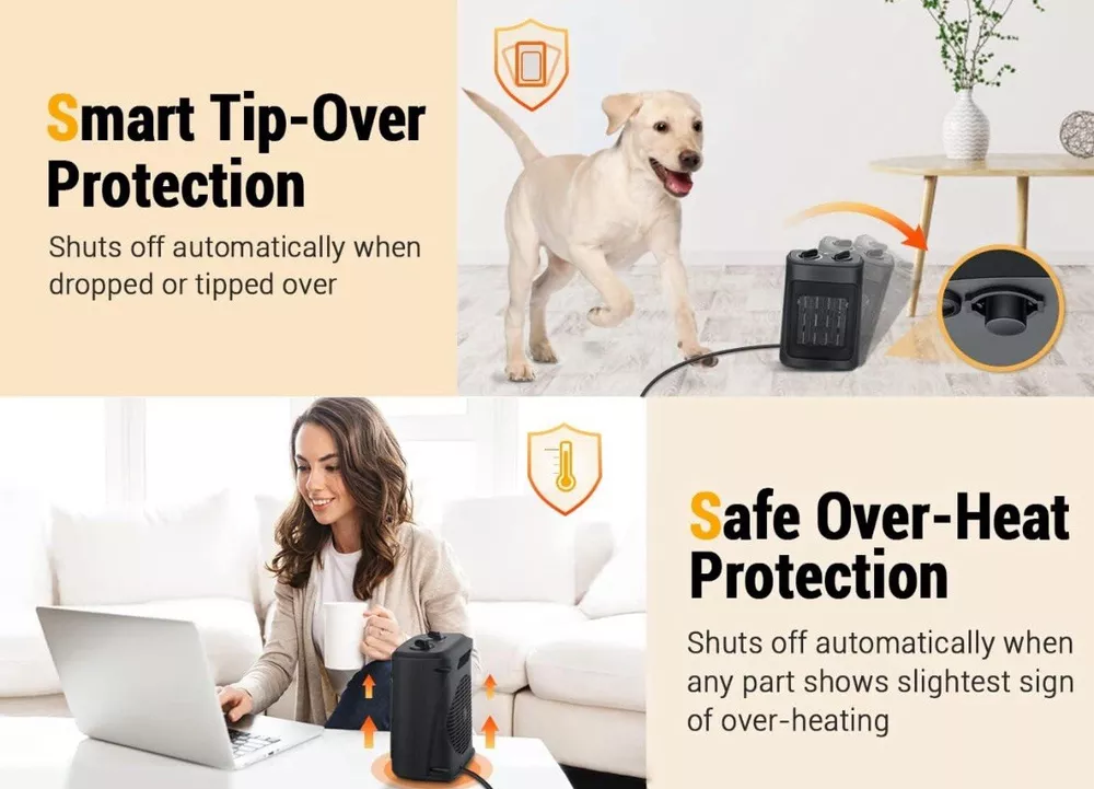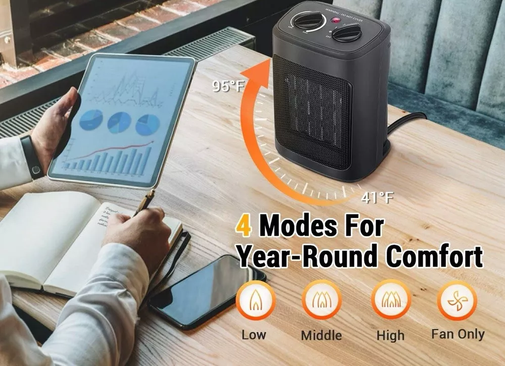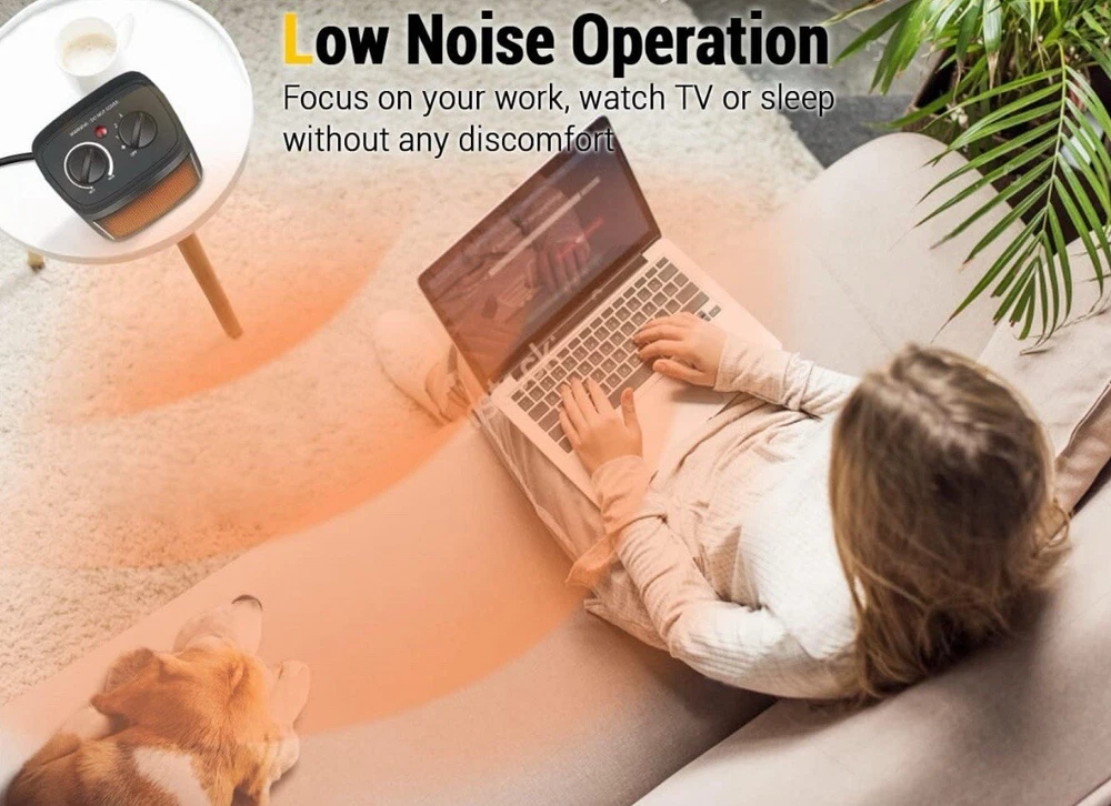RESEARCHED AND VERIFIED BY HEALTHIFIER-NO NEED TO RESEARCH ANYMORE GET NICE & TOASTY FASTER: The advanced PTC ceraming heating technology combined with the ultra-efficient fan will heat up any space faster and distribute the heat more evenly. Just turn on your space heater, count to 3, and enjoy your warm living room, bedroom or office. CUT DOWN ON ELECTRIC BILLS without having to freeze. Our energy-efficient interior space heater features 3 different heat settings (LOW, MEDIUM, HIGH) as well as a fan-only mode, so you can tailor it to your exact needs. Instead of wasting a fortune on central heating, you can warm just the spaces you actually use. ADJUST THE TEMPERATURE TO YOUR NEEDS: Equipped with an adjustable thermostat, our space heater will keep you comfortable at all times. Just set the dial to the desired heat setting and let the thermostat monitor the surrounding air temperature and keep you comfy. PERFECT FOR YOUR HOME OR OFFICE: The compact and portable design combined with the ergonomic built-in handle, will allow you to easily move your space heater to any room you want. Make sure your office, kitchen, bedroom, guest room, study or living room is nice and warm. YOUR PEACE OF MIND IS OUR PRIORITY: We have ensured the safety of you and your loved ones by adding an advanced overheat protection sensor as well as a smart tip-over switch, which will automatically turn off the heater in case it overheats or gets tipped over by your kids or pets. NOTE:Before purchasing the heater, please check the User Guide in the Product Guide and Documentation.