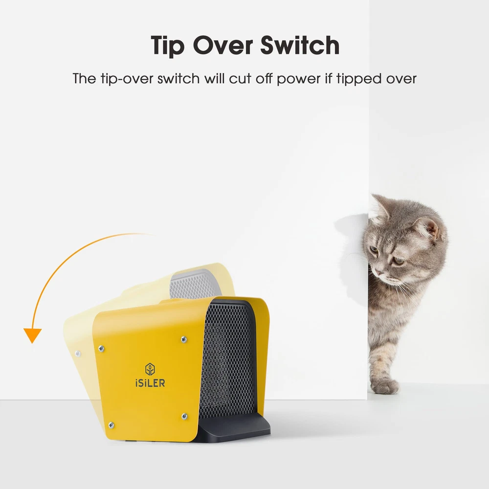 SAFE & RELIABLE: This small space heater made from fire-retardant materials; The ceramic heater has a self-regulating element and automatic overheating protection for added safety. Tip-Over Protection will shut off the room heater if it gets knocked over accidentally to avoid accident happens. It will automatically shut it off if the temperature exceeds the limit value and back to work once it gets to a safe temperature inside. ADJUSTABLE THERMOSTAT CONTROL: Features a temperature range of 41 °F-95 °F; Rotate the thermostat control dial to lower the temperature once the room is warm, this ceramic heater will greatly reduce power consumption. INSTANT WARM-UP: The small space heater heats up a room within seconds thanks to its 1,500 W output, reliable ceramic heating elements and large air outlet; Distributes warm air evenly around a large area of up to 108 sq. ft.; The space heater suitable for living rooms, dressing rooms, bedrooms, studies, offices and more. COMPACT, PORTABLE & CONVENIENT: The space heater only measures 6.7 in x 6.4 in x 6.2 in and weighs in at just 42.3 oz; The light weight and ergonomic handle allow for easy transportation. IMPORTANT SAFETY NOTICES: Please note these for safety: 1. To avoid burns, do not let bare skin touch hot surfaces. 2. Do not use the heater outdoors. 3. In order to avoid overheating, do not cover the heater. 4. Do not use the heater in the immediate surroundings of a bath, a shower or a swimming pool. If you want to use the heater in the bathroom, please use it when the bathroom is dry and avoid the heater/plug splashed water!