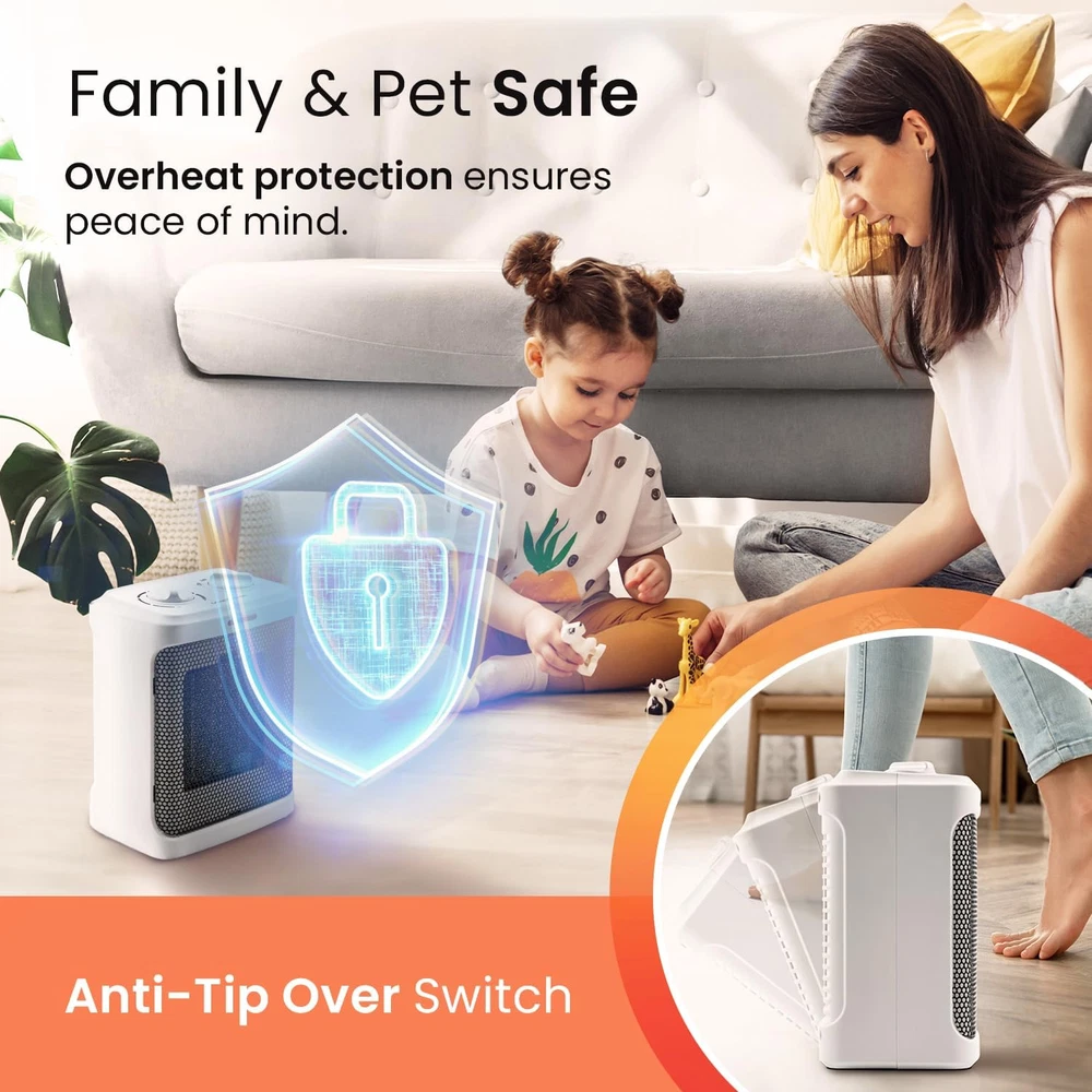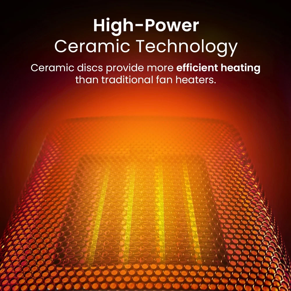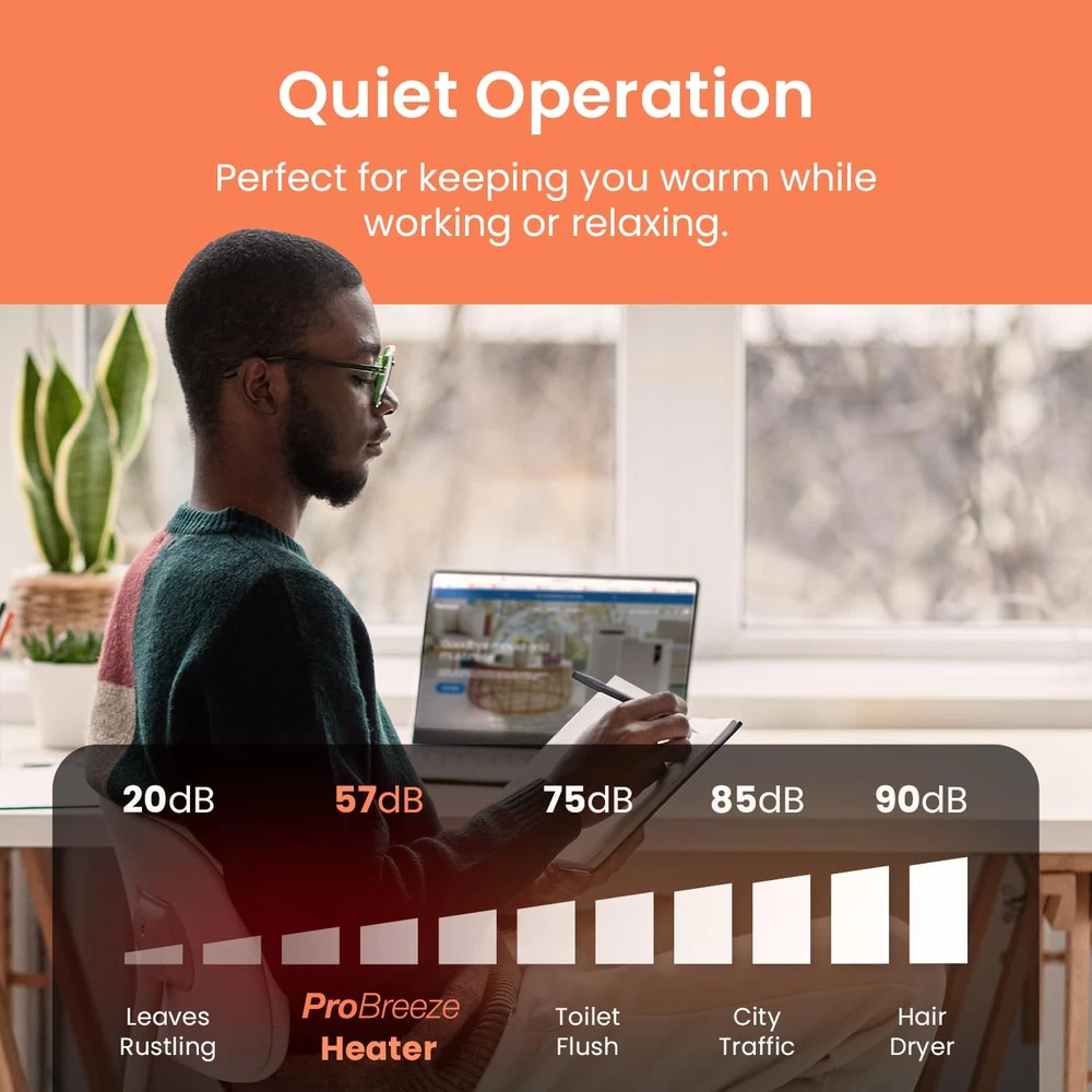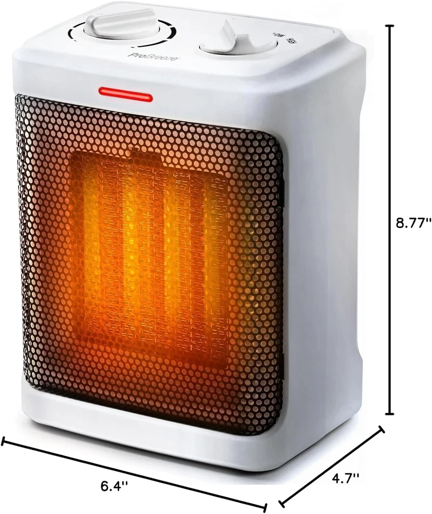 COST-EFFECTIVE, SUPER-FAST WARMING: This electric space heater utilizes industry leading ceramic heating discs for ultra-warm heat transfer in any space of your choice. This advanced technology ensures that you receive faster and more energy efficient heating than traditional heaters for indoor use. The portable heater runs at a cost of just $0.19 per hour which allows you to reduce your bills by being able to heat individual rooms rather than expensively heating your entire home. EASY CONTROL WITH 3 OPERATING MODES: The small space heater offers flexible heat control and features 750W (Low) and 1500W (High) power modes as well as a gentle fan only mode - perfect for keeping you warm this winter. ADJUSTABLE THERMOSTAT: This indoor heater features an easy to use and fully adjustable thermostat control which monitors the surrounding air temperature for optimal heating efficiency. Compact and powerful, this is the ideal room heater, bedroom heater, bathroom heater, office heater and under the desk heater. ADVANCED SAFETY FEATURES: Pro Breeze goes above and beyond to deliver the ultimate level of safety with every mini heater. The built-in overheat protection and an enhanced anti-tip over switch ensures that the space heaters for indoor use instantly switch off in any unsafe situation, giving you complete peace of mind. PLEASE NOTE: If you hear a rattling sound, this is the anti-tip over safety ball mechanism. This is not a defect, but a reassuring sign of the safety switch in action. PORTABLE & COMPACT: The lightweight and convenient design allows you to transport the indoor space heater to wherever you need it most, making it the perfect garage heater, tent heater, cozy cabin heater, dog house heater, and greenhouse heater. The dimensions are 6.5” x 5” x 9” with a useful 73" power cord. Product Description Pro Breeze - Home Appliances World leader in domestic appliances, heaters and fans. Internationally renowned for developing exceptional value, market leading products. Industry Leading Products Customer Focused Brand Specialists in Heating & Cooling Over 500,000 Happy Customers Pro Breeze 1500W Mini Ceramic Space Heater - Black With 3 Operation Modes and Fully Adjustable Thermostat This 1500W Mini Ceramic Heater from Pro Breeze utilizes advanced ceramic heating discs for ultra-warm heat transfer in small spaces. Ceramic heating is the latest technology in mini space heaters and provides a faster, safer and more energy-efficient method of heating than traditional space heaters. At the flick of switch, the ceramic fan heater will produce a stream of warm air to quickly and effectively heat the area in front of the heater. Dimensions: 6.5” x 5” x 9” Cable Length: 1.83 meters Tip-Over Switch Overheat Protection Power: 1500W/750W Input: 120V, 60HZ 3 Operating Modes Choose between High (1500W), Low (750W) and fan only modes for flexible heat control. A built-in thermostat will maintain your desired temperature for optimal efficiency. Adjustable Thermostat Control your room's temperature using the adjustable thermostat. The easy-to-use wheel allows you to stay on top of your space's warmth and keep the energy consumption down. Compact & Portable The heaters small and compact design allow it to be easily transported to wherever you need it most.