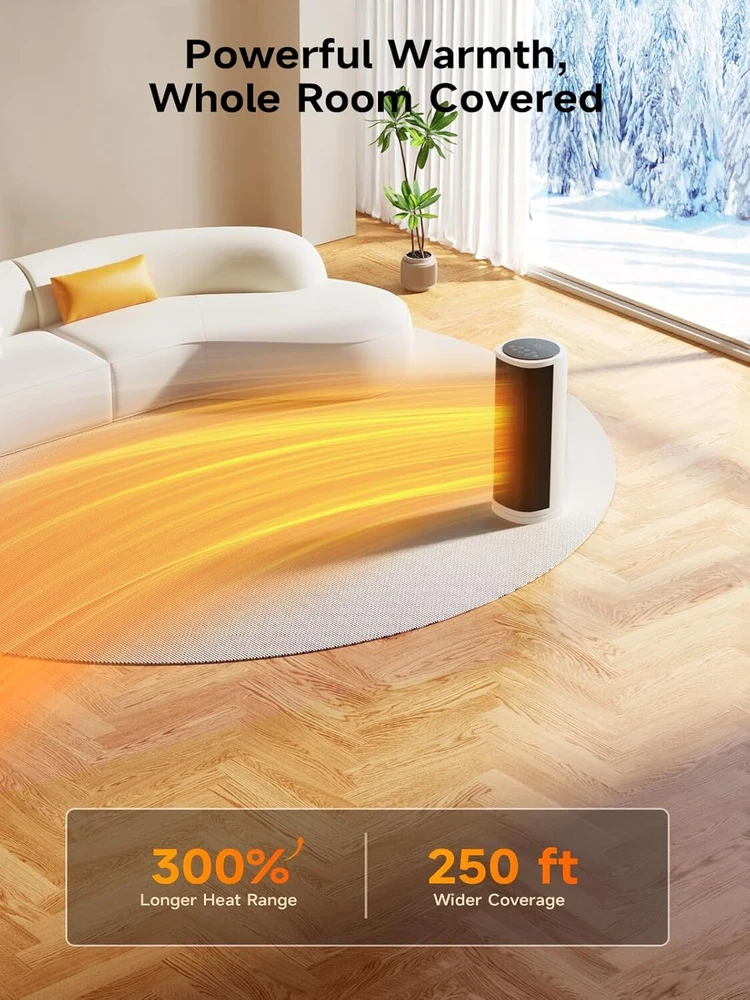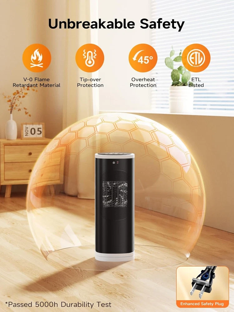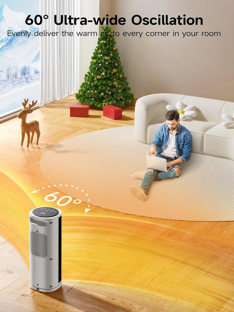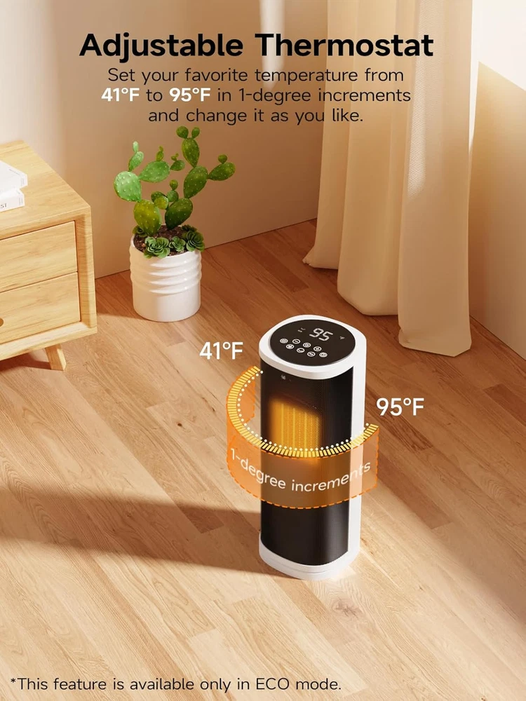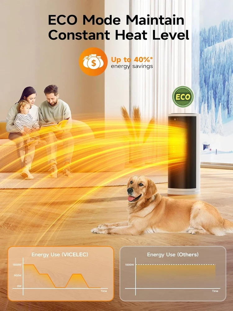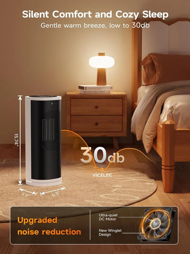 Space Heater, 16 Inch Portable Electric Heaters for Indoor Black and White Product Details Brand: VICELEC Special Feature: Adjustable Thermostat from 41 to 95°F, Remote Control, LED Digital Display, 60° Wide Oscillation, Built-in Tip-Over Protection Color: Black and White Form Factor: Tower Indoor/Outdoor Usage: Indoor Product Dimensions: 5.9"D x 6.3"W x 15.74"H Recommended Uses For Product: Office, Tent, Garage, Bedroom, Desk, Greenhouse, Home Mounting Type: Floor Mount Room Type: Kids Room, Bedroom, Home Office, Study Room, Nursery Heating Coverage: 250 sq.ft. Burner type: PTC Fuel Type: Electric Number of Speeds: 1 Voltage: 120 Volts Amperage: 12.5 Amps Min Temperature Setting: 41 Degrees Fahrenheit Max Temperature Setting: 95 Degrees Fahrenheit Manufacture Year: 2024 Item Weight: 3.68 pounds Manufacturer: VICELEC Item model number: J1 Batteries: 1 CR5 batteries required. Special Feature: Adjustable Thermostat from 41 to 95°F, Remote Control, LED Digital Display, 60° Wide Oscillation, Built-in Tip-Over Protection Adjustable Thermostat from 41 to 95°F, Remote Control, LED Digital Display, 60° Wide Oscillation, Built-in Tip-Over ProtectionAdjustable Thermostat from 41 to 95°F, Remote Control, LED Digital Display, 60° Wide Oscillation, Built-in Tip-Over Protection See more Power SourceHeating Method: Corded ElectricForced Air Item WeightHeat Output: 1670 Grams1500 Watts ☀️FITS INTO YOUR LIFESTYLE WELL: VICELEC small space heater equipped with handle, which makes it easier to carry, featured with multiple heating levels and modes to heat as you like (Power heat, ECO, Fan Only). It also offer handy extras for a hassle-free experience (12-hour timer, 60°Oscillation, mute, remote, and memory function). ☀️MORE WARMTH, LESS NOISE: No more choosing between quiet or warmth. VICELEC desk heater has a brushless DC motor with frictionless performance and a winglet fan design that reduces turbulence, reducing noise to only 30dB.Cord Lenth: 4 ft / 1.2 m ☀️SPEEDY HEAT FOR INSTANT COMFORT: VICELEC portable space heater for large room combines Hyperamics 1500W advanced PTC system with a new heat funnel design to deliver heat within seconds and enhance warm air circulation for up to 200% farther reach than traditional heaters. Heating Coverage:250 sq.ft. ☀️All-ROUND SAFETY: Stay warm this winter with VICELEC small room heater. The innovative tilt-detection sensor improves accuracy and reliability for better tip-over protection, and built with V0 flame retardant materials, overheat protection, and safety plug, all certified by ETL. ☀️PRECISE TEMPERATURE CONTROL:The enhanced NTC chipset brings more precision to turn your space heater office into a smart heating powerhouse, providing precise temperature control and up to 50% energy savings, bringing you all-day comfort without worrying about your electricity bills.