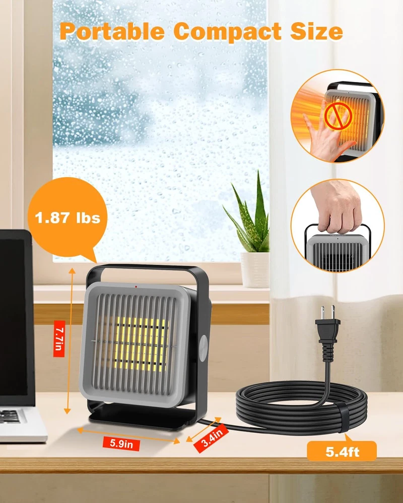 🔥🔥 Instant Warmth with PTC Ceramic: Experience cozy comfort within 3 seconds, thanks to our advanced PTC ceramic heating technology. Say goodbye to chilly office spaces and hello to rapid warmth. 🔥🔥 Customize Your Comfort: Find your ideal heat angle with the 45° adjustable design. Whether it's for targeted warmth during work or a subtle heat adjustment, this heater has you covered. 🔥🔥 Double the Safety, Double the Peace of Mind: Your safety is our priority. This space heater features both overheating and tip-over protection, ensuring you stay warm without worries. It's safety meets warmth in one sleek package. 🔥🔥 Modern Minimalist Elegance: Elevate your workspace with this modern, minimalist space heater. It's perfect for your indoor office desk or any small area. The sleek design seamlessly blends with your decor. 🔥🔥 Perfect Winter Gift: Looking for a thoughtful gift for the winter season? This small desk space heater is an ideal choice for Halloween, Thanksgiving, Christmas, or your parents' birthday. It's a practical gift that keeps your loved ones warm all winter long.