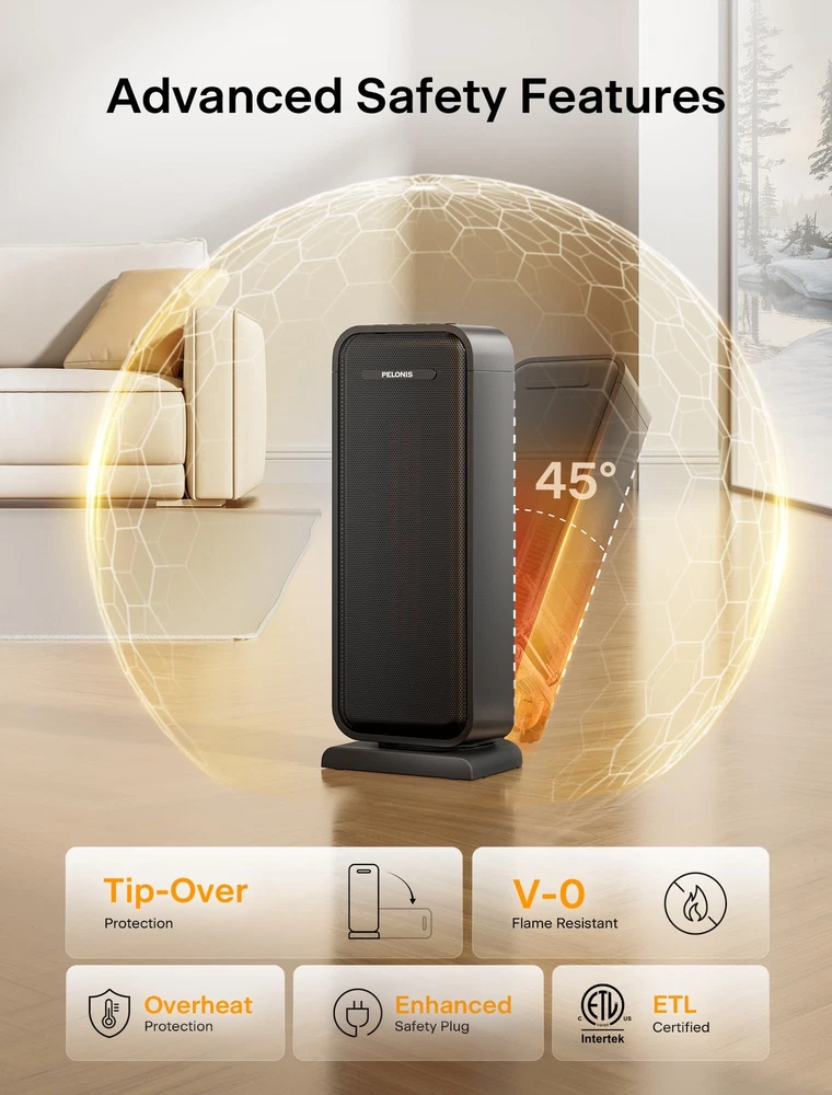 More Durable and Reliable Warmth from PTC Tower Heater PTC ceramic heater deliver instant and directional warmth. The innovative and ultra-wide PTC energy-saving heating element can give out heat in large area., and with the ultra-high heat efficiency, it can improve the indoor temperature in a short time. 𝑭𝒂𝒔𝒕 𝒂𝒏𝒅 π‘·π’π’˜π’†π’“π’‡π’–π’ π‘―π’†π’‚π’•π’Šπ’π’ˆ: 2X heating speed is thanks to the increased PTC area, the upgraded structure allows farther heating distance. Dual technology upgrades ensure efficient heat and sufficient warmth transfer in an instant π‘¬π’π’‹π’π’š 𝑬𝒗𝒆𝒏 𝑯𝒆𝒂𝒕 π’‡π’“π’π’Ž π‘¬π’—π’†π’“π’š π‘¨π’π’ˆπ’π’†: The wide 75Β° oscillation allows you to enjoy the warm air from any angle in the room. Equipped with remote control, you can feel warm anytime and anywhere π‘Ύπ’‰π’Šπ’”π’‘π’†π’“ π‘Έπ’–π’Šπ’†π’• 𝒇𝒐𝒓 Sπ’˜π’†π’†π’• Dπ’“π’†π’‚π’Žπ’”: The noise level is as low as 32dB due to motor and turbine upgrades, without causing any disturbance to sleep. The 12H ultra-long timer ensures all-night sleep, no worries about setting it again in the middle of the night π‘ͺπ’π’Žπ’‘π’“π’†π’‰π’†π’π’”π’Šπ’—π’† π‘Ίπ’‚π’‡π’†π’•π’š: This ETL-listed electric heater provides tip-over and overheat protection, as well as an enhanced safety plug. Along with UL94 V-0 flame-retardant materials to ensure unbreakable safety in all aspects. 𝑺𝒂𝒗𝒆 π‘©π’Šπ’π’π’” π’˜π’Šπ’•π’‰π’π’–π’• π‘ͺπ’π’Žπ’‘π’“π’π’Žπ’Šπ’”π’Šπ’π’ˆ π‘³π’Šπ’‡π’† π‘Έπ’–π’‚π’π’Šπ’•π’š: The ECO mode is used to save winter bills while you can choose ideal temperature with adjustable thermostat. The temperature range is 41-95F with Β±1℉ increments, precise control for your ultimate enjoyment π‘ͺπ’π’Žπ’‘π’‚π’„π’• 𝒂𝒏𝒅 π‘³π’Šπ’ˆπ’‰π’•π’˜π’†π’Šπ’ˆπ’‰π’• 𝒕𝒐 𝑴𝒐𝒗𝒆: This compact heater can be placed on the floor, on/under the desk, suitable for small/large bedrooms, living rooms, offices, and more. A handle is specially designed for easy transfer between rooms, so the warmth can follow wherever you go