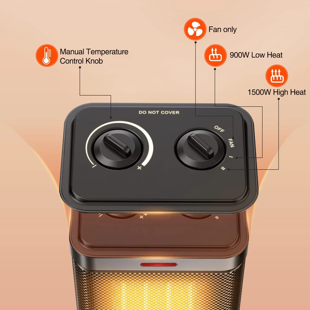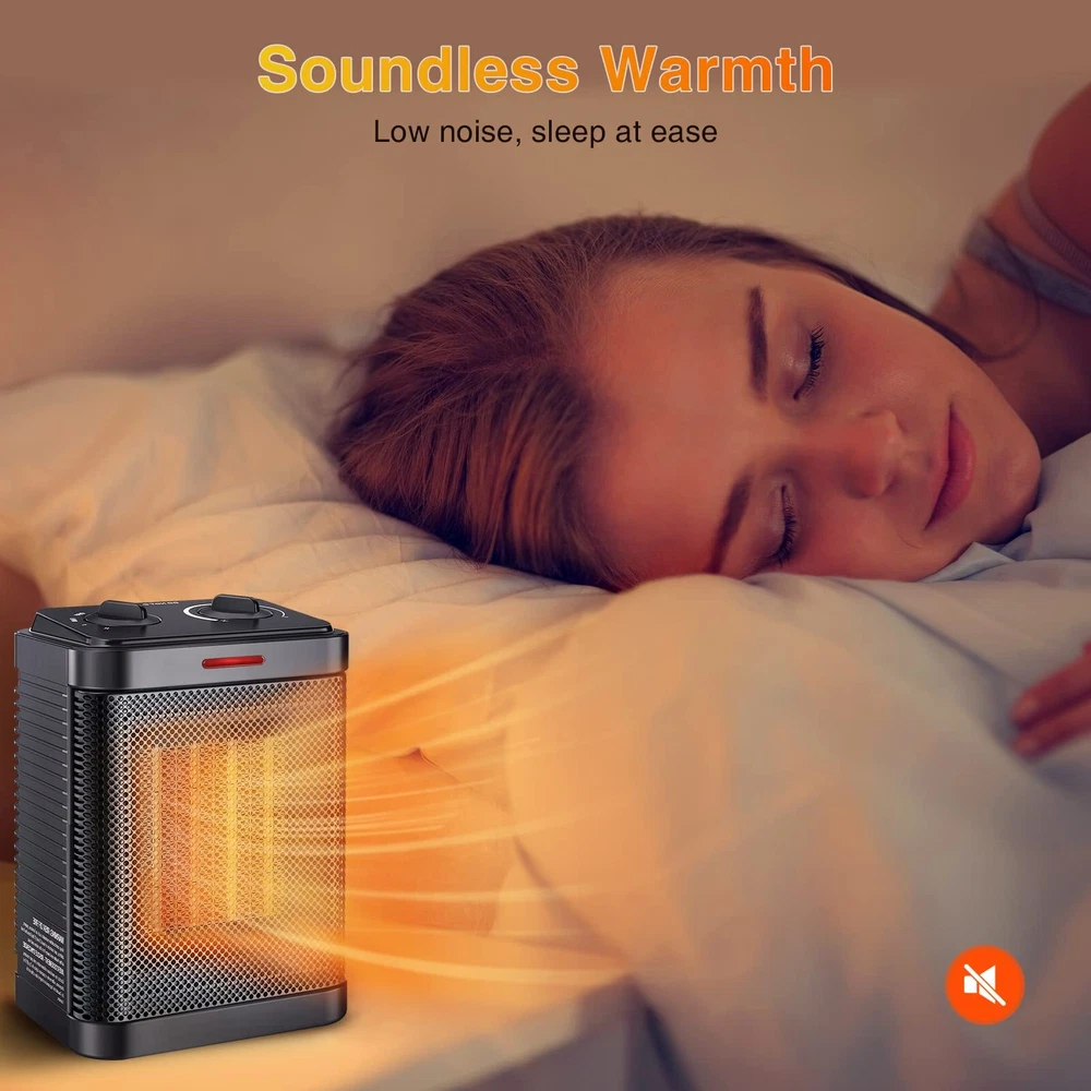 MULTI-HEATING MODES: 3 desired comfort settings, High Heat (1500 watts), Low Heat (900 watts), and Natural Wind, make this electric space heater perfect for warming up your home or home office area. Adjustable temperature settings help to quickly increase the temperature based on the thermostat control. DEFEAT COLD IN 2S: Ceramic space heaters are a great way to save floor space while beating the cold. Our advanced PTC ceramic heating element adopts quick heat technology to achieve rapid heating within 2 seconds. Dual wattage 900/1500W heat provides you with constant comfort. RELIABLE SAFETY PERFORMANCE: Our space heaters have built-in safety overheating and tip-over protection, the electric heater will auto turn off if accidentally tipped over or overheated cannot be controlled or surveilled, and will not harm children and pets. The power indicator light lets you know when it's plugged in. SAFE AND HASSLE-FREE: This tabletop heater features safety features to protect against tip-over and overheating. Made of premium-quality flame retardant material to avoid fire accidents. And certified by the United States Electrical Testing Laboratory (ETL). Your family enjoys being wrapped in the safe and quiet heat through dark and cold months. COMPACT SPACE SAVINGS: Dimensions are 6.3" long, 4.73" wide, 8.66" high, and weigh 2.43 lbs. Small indoor electric heaters with two heating modes are an excellent design for homes, dorms, studios, and offices. Adopt the convection heating method to create a comfortable environment.