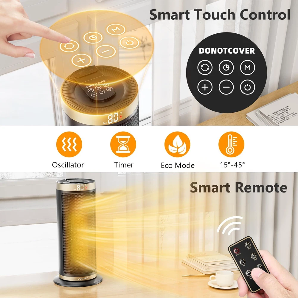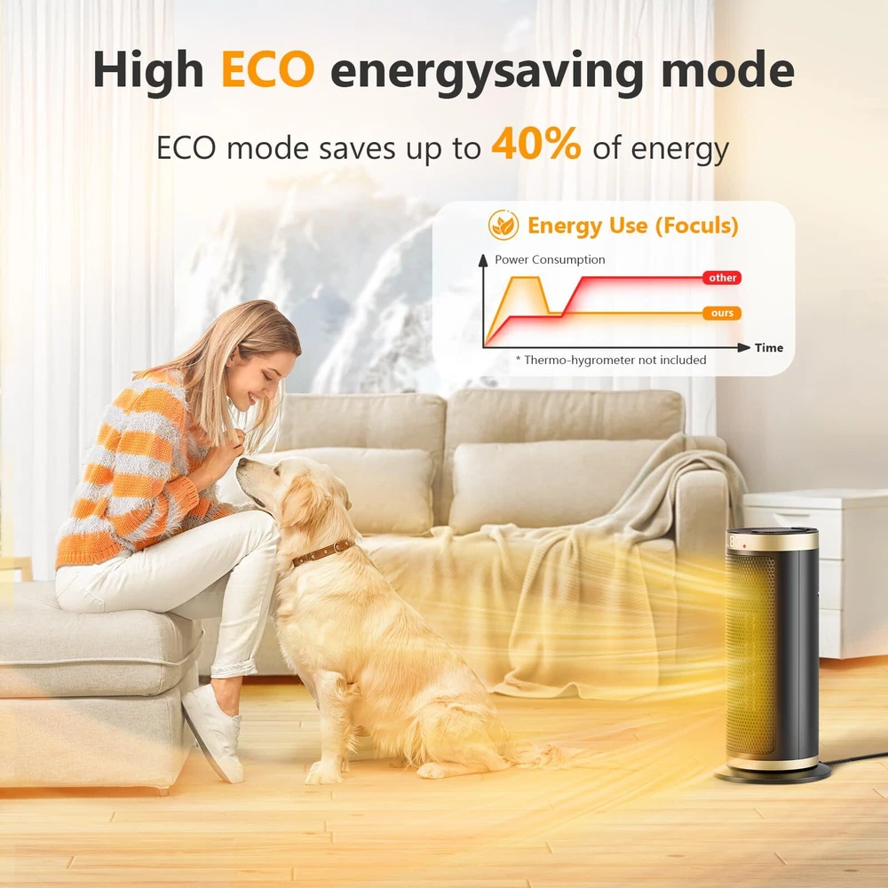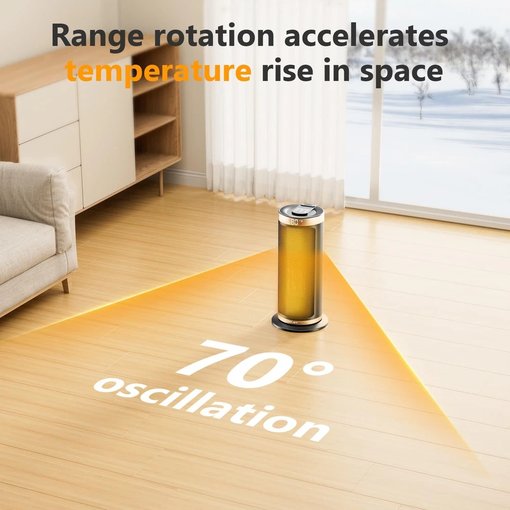 Fast and Uniform Indoor Heating: ceramic heater adopts advanced PTC ceramic heating technology and a high-efficiency fan to provide fast heating in 2S. The 70° wide-angle oscillation, boosts heating coverage by 20%, which helps distribute the warm air more evenly towards the room's corners, suitable for warming up spaces in the home including bedrooms, basements, garages, living rooms, and can also be used in offices, dorms, hot yoga studios, etc Multiple Safety Protections: This room heater has multiple safety features, including anti tipping protection, overheating protection, 24-hour no interaction, automatic shutdown, safety plug, and V-0 flame retardant, and it has passed ETL certification. It will shut off automatically when it is overheated or tipped over accidentally. It is made of high-quality V-0 flame-retardant ABS material, which is suitable for families with children and pets, allowing you to spend a safer and warmer winter. Smart Control and Low Noise: One touch to change the temperature and mode on the LED digital display, or use the remote control to adjust the heater's temperature, timer, and more from a distance. While the adjustable timer allows you to select 1 to 12 hours. This heater fan adopts a brushless DC motor that runs quietly and smoothly, as quiet as 35 dB, allowing you to sleep or work with peace of mind. Save More on Energy Bills: Equipped with 900W low-temperature mode and 1500 high-power heating mode, energy-saving heater with built-in intelligent temperature sensor, ECO Mode adjusts the heat level automatically to reach your desired temperature while saving more on energy bills. Personalize your own comfort with the digital thermostat from 41 to 95 ℉, adjustable in 1℉ increments. Precise Heat, Precise Comfort. The built-in handle on the back of this indoor space heater makes it easy to carry and store, allowing you to easily move it from the bedroom to the living room, kitchen, office, dormitory, garage, basement, and other places you want to use.