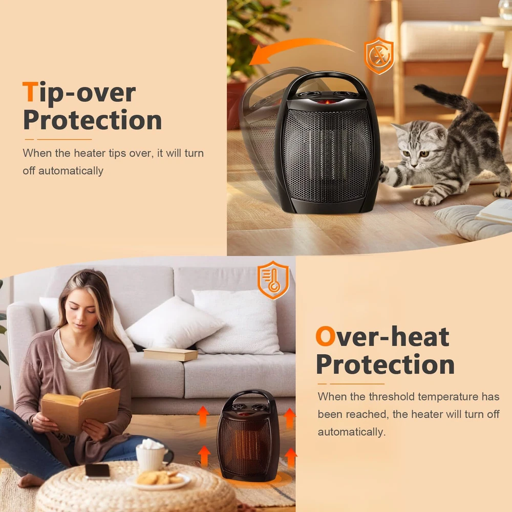 Easy Control Heater : Adjust the control knob on the right to turn the unit on. "I" is for producing heat at 750 watts, "II" will produce heat faster and hotter at 1500 watts, and ”Fan” will blow out cool air. Then turn the thermostat knob on the left toward the + sign.you can turn the Temperature Control Switch clockwise, to the highest setting. When the desired room temperature is reached, slowly rotate the temperature Control Switch counter-clockwise until the heater tums off automatically. Overheat protection & Tip-over protection - Thermostat control of the heater will turn the heater off when it reaches a preset temperature and turn the heater back on when the temperature dips below the thermostat setting. When the heater is accidentally overturned or the angle between the heater base and the ground exceeds 45 degrees, the heater will automatically cut off power to protect the safety of you and your family. Compact and Powerful :Dimensions:9.45" x 7.28" x 5.31", 2.81 pounds light weight mini heater easy to carry around .Ceramic space heaters can quick heating within 2S.Heat 200 square feet in seconds. By heating the required small space instead of using other centralized heaters to heat the entire house, helping to save electricity bills. Small weight, easy to carry, suitable for bedroom, living room, study and office, etc. Ceramic Technology :PTC heating element is the abbreviation of ceramic electric heating element, which is more stable than traditional heating element, heating quickly, safe and reliable. The heater has low thermal resistance, automatic constant temperature, no redness on the surface of the electric heating tube heater, and can prevent burns, fires and other safety hazards. At present, it is an ideal electric heating component. Low Noise :The noise this ceramic heater makes is lower than 45 dB, quiet enough for people to use in a bedroom while sleeping. Provide a quiet space for your comfort.