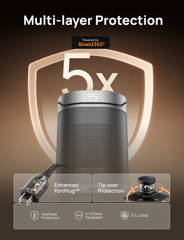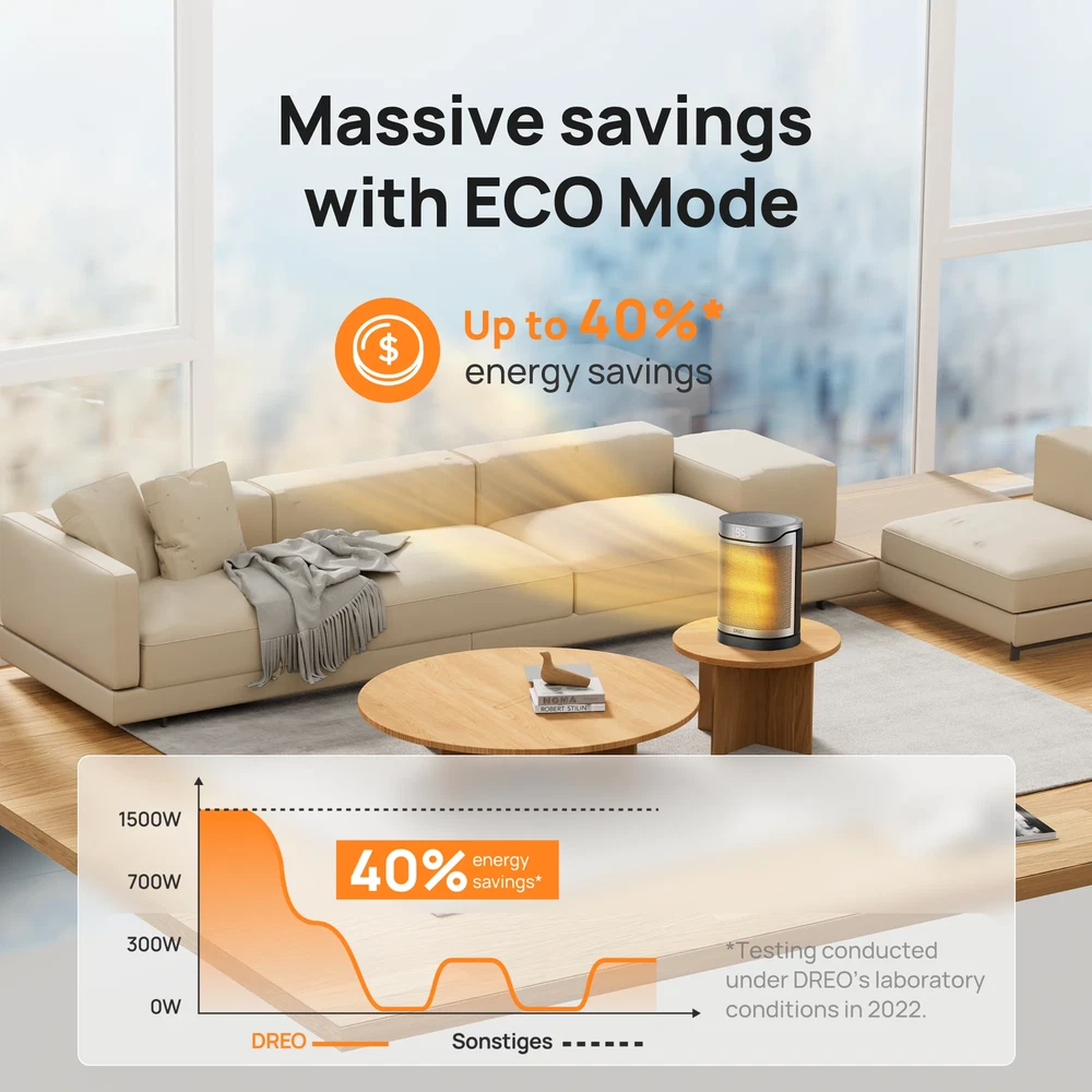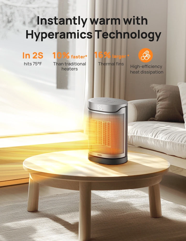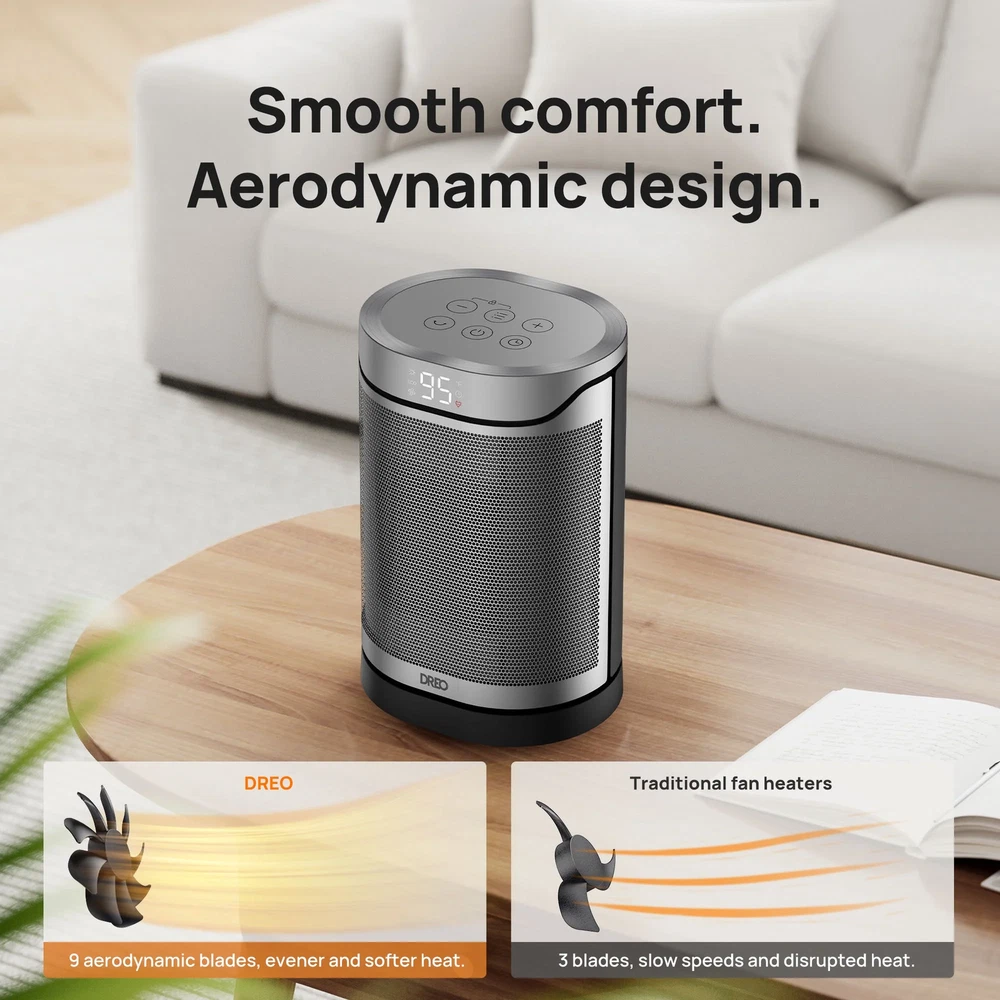 Dreo Space Heater, powered by Dreo Hyperarcs Technology, the electric heater heats up more efficiently with up to 1500W working power and can heat up to 200 square feet. DREO Space Heater Series?America's Home & Garden Best Brands of 2022* *Based on Newsweek's 2022 America's Best Brands ranking. Dreo Portable 1500W Fast Ceramic Space Heater ? Compact Size. Gigantic Warmth. Instant Heat that Fits Everywhere Take this 1500W heater with you and bring warmth to every room. Hyperamics PTC system delivers rapid heat through an upgraded heat booster, reaching 200% farther distances than traditional heaters, making it the ideal solution for small to mid-sized rooms don't have much space but need fast powerful heat for inside in winter. Safety is Paramount Stay cozy and safe with DREO's multi-layer protection, featuring smart tilt sensor for reliable tip-over protection. Built tough with V0 flame-retardant materials, overheat protection, and a safety plug. Every feature is ETL certified, giving you solid warmth performance without sacrificing your safety. Choose your temp, let DREO do the rest The room heater features a high-precision ECO mode with a wide range of 41 to 95°F, adjustable in 1°F increments, thanks to its NTC chipset and high-accuracy sensor, you can enjoy complete control over your comfort level while maximizing energy efficiency. Feel the warmth, not the noise This electric heater sets a new standard for quietness thanks to its innovative brushless DC motor and winglet design, achieving an incredibly low noise level at 34dB. Enjoy the perfect balance between warmth and serenity for a truly restful space and better sleep at night. Perfect companion for daily use Carry this portable heater easily from room to room with its handy handle, ensuring comfort anywhere. Adjust warmth with various heating levels and modes (Power Heat, ECO, Fan Only) Includes a 12H timer,child lock, and memory function for added convenience. 1-12h Timer 41-95℉ Adjustable Carry Effortlessly H1/H2/H3/ECO/Fan Only Modes DC motor LED Display Touch Control/Remote Control 70℃ Oscillation 37.5 dB Low Noise