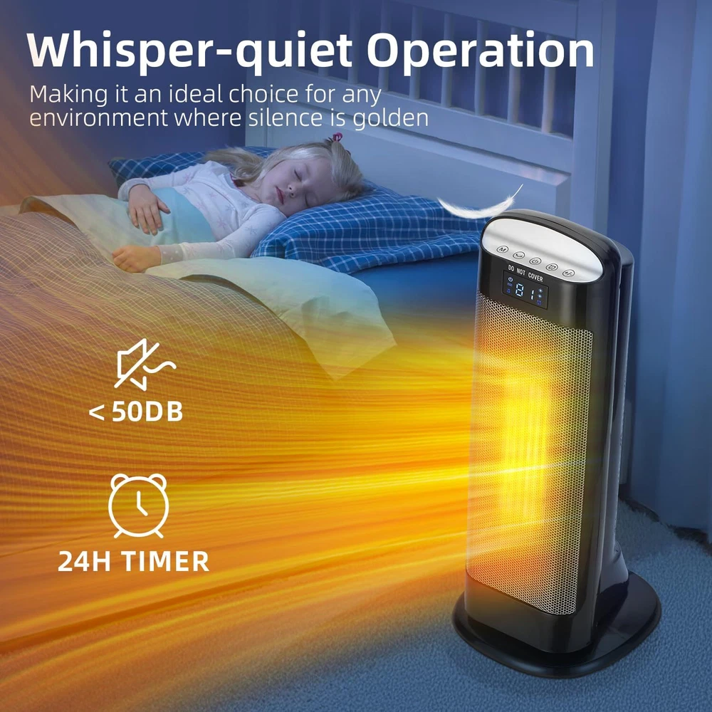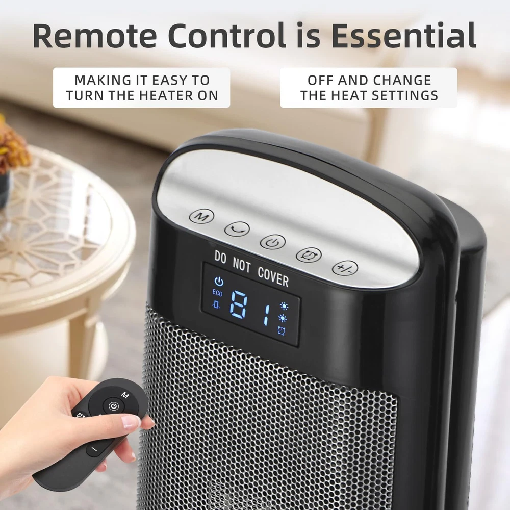 Space Heaters for Indoor Use 3 HEATING MODES:The heater does a great job of heating up a 500 sq ft room like bedroom or living room with multiple heating levels of 1000watts,1500watts and ECO mode.The ceramic heating element ensures efficient operation and quiet heating.The fan motor blows very strongly,and the heating element heats up in seconds after it is turned on ADJUSTABLE THERMOSTAT:It allows precise control over the desired temp.from 50-99°F,ensuring you can maintain a comfortable temp.throughout the day.It's the high (99°F) heat limit while many others have a lower (from 55-90°F).It allows the temp to rise 4 degrees above the set temp. before shutting off,then kicks back on when it reads 1 degree below set temp. which is a energy saving feature.So you don't have to keep turning it on and off,or worry about heating up a room way too hot BUILT-IN SAFETY:It comes with tip-over protection,making it safe for homes with children and pets.It also has overheat protection,which prevents the unit from overheating even if accidentally left on for an extended period MULTI-FUNCTION REMOTE:It allows for easy adjustments from across the room.Whether you need to turn the heater on/off,set the 24H timer,adjust the thermostat,or control the oscillation feature,everything can be done without needing to get up.This is especially appreciated during cold nights.Moreover,the digital display is intuitive and easy to read,providing real-time information on the current settings,making it easy to set the temperature OSCILLATES TO SPREAD THE HEAT:One of the standout features of the tower heater is its oscillation capability,which ensures even distribution of heat throughout the room.This feature is useful in larger spaces or rooms with multiple seating areas,ensuring everyone feels the warmth without needing to constantly adjust the heater's position