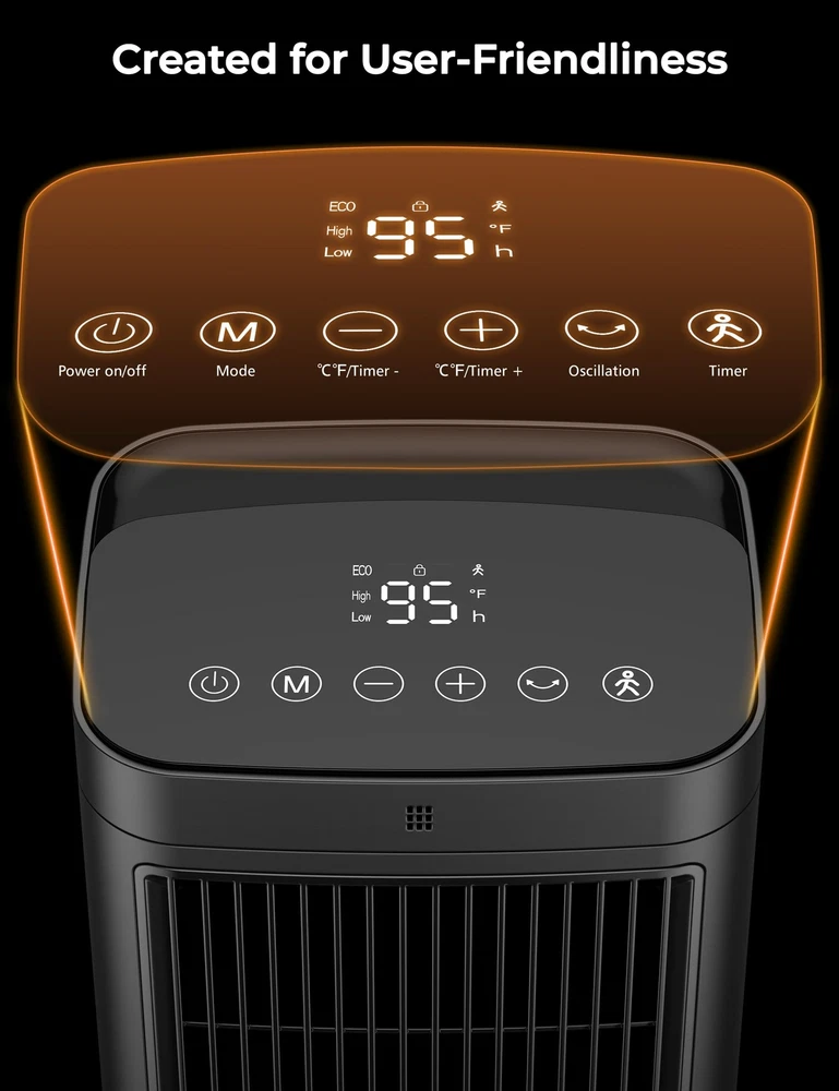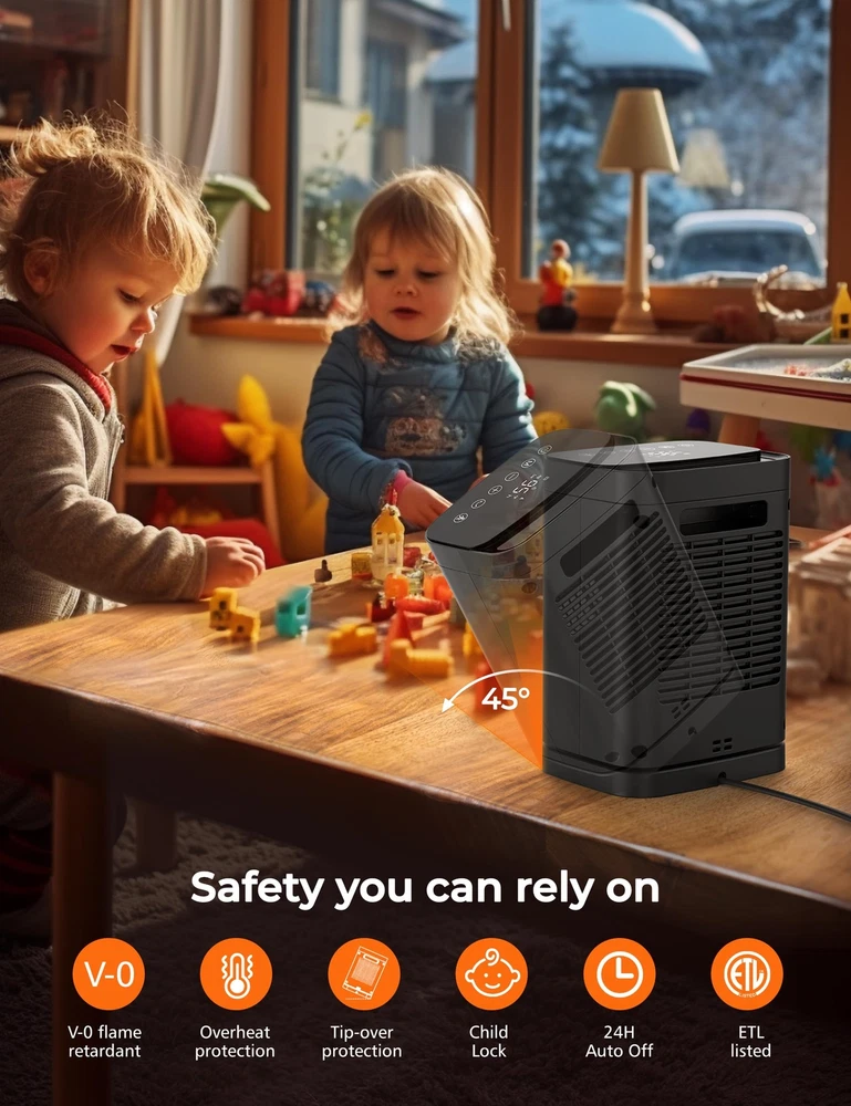 【Heats When Necessary】:With an intelligent motion sensor, our space heater could sense you're present. No need to worry about switching your space heater on and off each time you come and go. After leaving the detection range for 180s, the heater will automatically turn off. Concentrate on your priorities while cutting down on energy costs during chilly winter periods. 【Ultimate Protection】: This ETL-listed Shield360°indoor space heater provides overheat/tip-over protection, UL94 V-0 flame-retardant materials, safe children lock, 24-hour automatic power off without interaction, and enhanced safety plug to ensure heating your day and night without worries. You can move the lightweight heater to the bedroom,office,garage, basement,desktop,etc 【Superpower Heating】: This portable space heater with energy-efficient 1500W PTC ceramic heating technology, can quickly reach your desired temperature and enjoy cozy warmth in seconds. This compact space heater is equipped with 1500W and 1000W working power to meet your various needs and warm your feet/hands quickly. 【Customizable Comfort】: Featured with 4 modes (High/Low/ECO/Human Sensor) that provide a tailored warming experience to beat the cold. With smart ECO mode, the heater can adjust the working mode(1500W or 1000W) based on the ambient temperature, easily providing the balance you want between heat and energy saving. 【Convenient & Reliable】: With an LED touch-screen and remote control, you can easily know the current temperature at a glance and freely control it with a single click. Customize your ideal climate with a 41-95℉ digital thermostat, 1-12h timer, 70°wide-angle oscillation, human sensor, and a variety of heating modes for your selection. Comes fully assembled and ready to use.