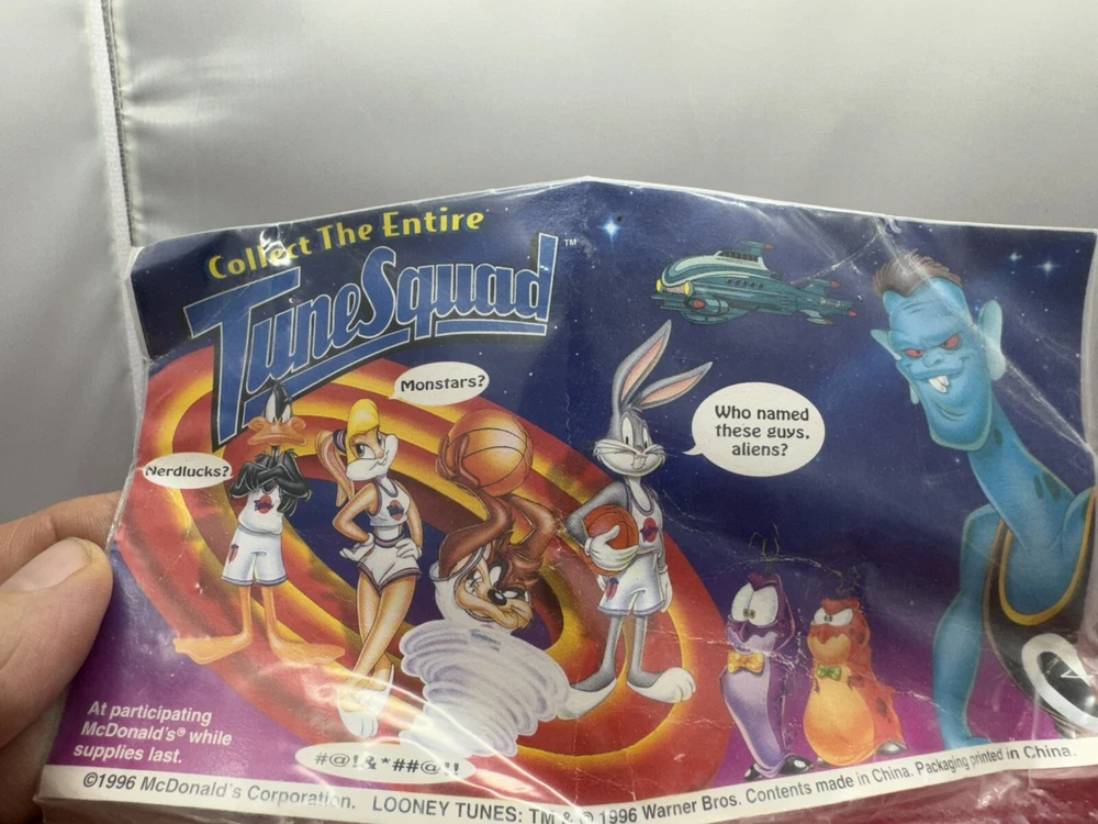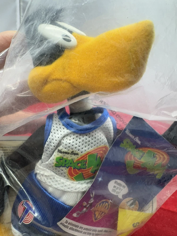 The product is a 9" plush stuffed animal of Daffy Duck from the 1996 Space Jam movie, produced by Warner Bros. and McDonald's. The item is sealed and in its original packaging. It features Daffy Duck alongside Michael Jordan. Made in China as part of the Looney Tunes character family. This item is not a custom bundle and has not been modified.