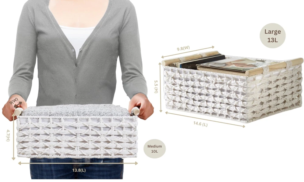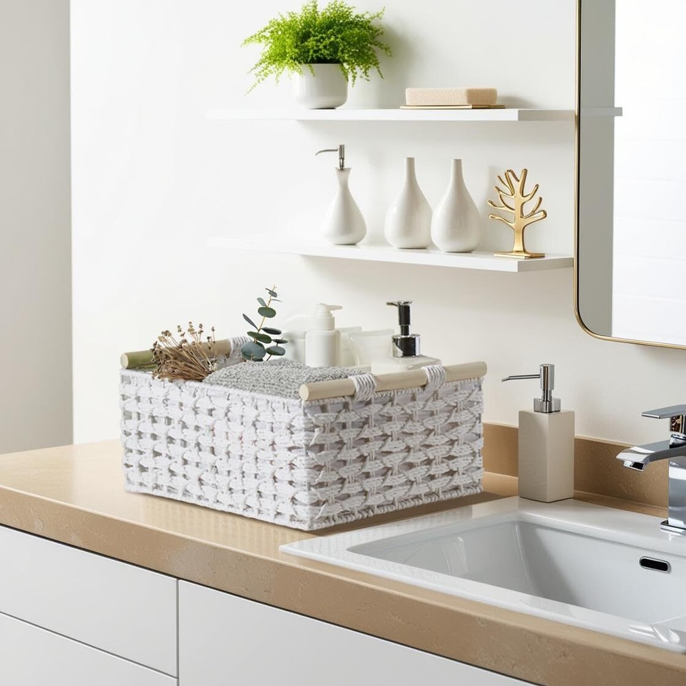 DECOMOMO Bathroom Basket White Wicker Baskets for Back of Toilet, Countertop, Pantry, Home Decor (White – 2 Pack) Durable & Handmade: Attractive hand-woven paper rope white baskets for storage, designed with a sturdy wire frame. Featuring wooden handles and a linen lining, these decorative baskets for home decor protect items while adding charm to your space. Perfect as organization baskets or shelf baskets. Bathroom & Toilet Tank Basket: This bathroom basket organizer is both stylish and functional, perfect as a back of toilet basket for toilet paper, face and hand towels, hairbrushes, body care products, and perfumes. The medium size fits perfectly as a toilet basket tank topper, while both sizes work well on vanities and shelves. Extra Spacious & Easy Care: Set of 2 white baskets. Large: 14.6" L x 9.8" W x 5.5" H & Medium: 13.8" L x 9" W x 4.7" H—crafted for ample storage of essentials. These white wicker storage baskets are easy to maintain; simply wipe the linen lining and woven exterior. Creative Gifts: These decorative storage baskets make a unique gift idea! Use the basket white as a makeup basket or fill with candles, wine, and treats for housewarming, birthdays, or baby showers. Multi-Purpose: Our small white baskets are versatile for the living room, bathroom, shelves, or as toilet baskets. These white wicker storage solutions add a stylish touch to any room, and are also perfect for a coffee table, pantry, or bedroom. Trusted Brand: Since 2017, DECOMOMO has been dedicated to superior storage solutions. We prioritize 100% customer satisfaction, backed by a money-back guarantee. Need assistance? Contact us on Amazon for a response within 24 hours. SHIPPING Domestic Buyers - We have confidence in our products, but if you are not fully satisfied please contact us within 30 days of purchase and you will get full refund. - We ship within 3 business days of payment, usually sooner - We offer FREE shipping on all orders! - We only ship to the lower 48 states, no APO/FPO addresses or PO Boxes allowed International buyers – please note: Import duties, taxes, and charges aren't included in the item price or postage cost. These charges are the buyer's responsibility. - Please check with your country's customs office to determine what these additional costs will be prior to bidding or buying. * Order Cancellation Policy ** You can return a product for up to 30 days from the date you purchased it. 1. The seller reserves the right to cancel the special case only due to eBay cancellation fee. 2. The decision of seller is the final. 3. The seller will respond to the cancellation request within 2 business days. Please wait for the result of cancellation. 4. In case the cancellation is not completed by some reasons, the buyer can follow the options below to get the refund. 4.1 The buyer can reject the item when it arrives. 4.2 The buyer can send the item back to the seller within 30 days If the buyer receives item (USA Shipment ONLY). The seller will provide the FREE return label to the buyer when the buyer opens " Return Item" case on eBay by using the reason as "Change my mind" ONLY. 5. When buyer has placed the order. The order will be processed and completed by automatic warehouse system within 5 minutes. In case that buyer sends the cancellation request after 5 minutes of placing the order, the request will be rejected. **Sending direct message to cancel the order is not allowed for every case.* Return Policy For the return case - If buyer would like to return the items for refund or replacement, please CONTACT SELLER to receive the free return label from seller. The refund or replacement will be processed with the tracking number of return label which is provided by seller only. The other ways of return which are not approved by seller will not be processed for the refund or replacement.