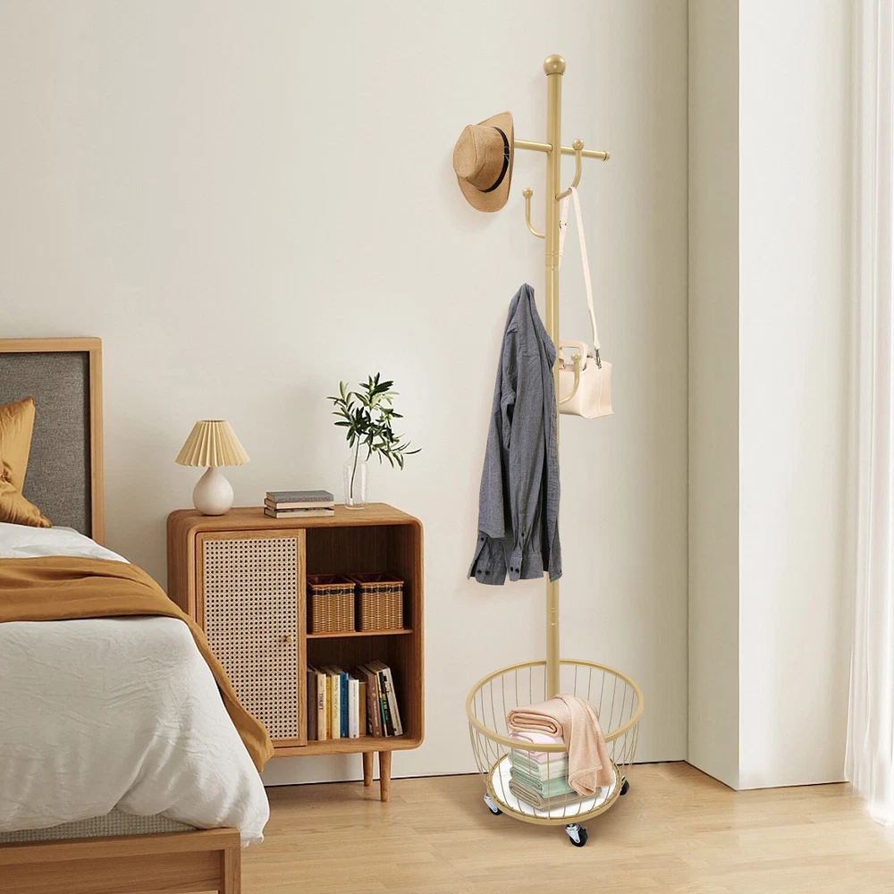 Specification Material: Carbon Steel Color: Gold Style: Modern Process: Baking Paint Number of Hooks: 6 Number of Wheels: 4 Mount Type: Free Standing Assembly Required: Yes Wheel Height: 5cm/1.97 in Basket Size(D*H):40*22cm/ 15.75*8.66 in Length of Top Crossbar: 37cm/ 14.57in Product Height: 1.68 m/5.51ft Gross Weight: 3.2kg/ 7.05 lbs Net Weight: 3kg/ 6.61 lbs Package Size: 42*41*24 cm/ 16.54*16.14*9.45in Package Included 1* Coat Rack All Accessories for Installation Coat Rack, Entryway Coat Hanger Stand with Storage Basket, Standing Coat Rack Description~~ Description A great coat rack is not only a caring steward for your clothes, but also an artistic accent to your home life. High-quality carbon steel and exquisite baked paint craftsmanship make our coat rack sturdy and durable. With its fashionable appearance, it can embellish your room. In short, it is your storage assistant, creating a tidy home environment for you. Key Features Sturdy and Durable: This product is made of high- quality carbon steel with a baked paint proces s, which is sturdy, rust-proof, wear-resistant , not easy to deform, and has a long service life. Stylish Style: The cactus -shaped look, stylish gold color, and minimalist lines make for a chic and elegant product that will fit in ideally with your existing furniture and add a splash of color to your room. Great Stability: This product is made of heavy-duty carbon steel, and the design of the thickened main pole and round basket base ensures high load-bearing capacity and overall stability. Storage Assistant: Four curved hooks staggered top and bottom and in different directions and two straight hooks ensure a balance of forces, add layers and avoid stacking of clothes, allowing you to easily reach coats, handbags, scarves and jackets (not included). The bottom hollowed out basket can also be used as a dirty clothes storage basket for more organized storage and improved space utilization. Convenient to Move: The basket base with universal wheels makes the coat rack easy to move anywhere, making any part of the room potentially an ideal place for storage. Assembly in a Breeze: Th e simple structure of the product, the complete set of mounting parts, and simple screw-in installation make it possible for even a novice to complete the installation quic kly and accurately. Easy Cleaning: Thanks to the smooth surface, simple structure, and open design, you can easily wipe off the dirt on it with a soft cloth. Good Customer Service: We stand behind all our guests and look forward to assisting you with your purchase. It is our pleasure to answer your confusion and questions. The end of the story between us is not "we sell and you buy". Details Round Head Hook: It is not only aesthetically pleasing but also prevents clothes from falling off and cares for your clothes and hands. Open Frame: No more complicated design, whether it's clothes, canes, bags, or umbrellas needed on a rainy day, they can be easily placed and accessed. Suitable Height: It's tall enough (5.51 ft) to keep most of your clothes from touching the floor and getting dirty, so you can hang pants, long skirts, jackets, etc. (not included) with confidence. Application It can be used in hallways, bedrooms, living rooms, bathrooms, entryways, foyers, study rooms, children's rooms, laundry rooms, offices, clothing stores, apartments, hotels, dormitories, etc. It can be used to hang coats, scarves, hats, school bags, book bags, handbags, purses, suits, garments, and so on. Specification Material: Carbon Steel Color: Gold Style: Modern Process: Baking Paint Number of Hooks: 6 Number of Wheels: 4 Mount Type: Free Standing Assembly Required: Yes Wheel Height: 5cm/1.97 in Basket Size(D*H):40*22cm/ 15.75*8.66 in Length of Top Crossbar: 37cm/ 14.57in Product Height: 1.68 m/5.51ft Gross Weight: 3.2kg/ 7.05 lbs Net Weight: 3kg/ 6.61 lbs Package Size: 42*41*24 cm/ 16.54*16.14*9.45in Package Included 1* Coat Rack All Accessories for Installation Notes Please note that this product does not include any clothes. For daily cleaning, please wipe gently with a soft cloth or sponge, do not use corrosive detergents to clean. Please stay away from sharp objects to avoid scratching the product. Gloves are recommended for installation to avoid injury. Please keep away from children during installation to avoid accidental injury or swallowing small accessories. When assembling, please half-screw all screws into the holes first, and then tighten completely after all screws are screwed in. Please allow the slight color difference caused by the shooting light and the 1-3 cm error due to manual measurement, and make sure you do not mind before ordering. Notes Please note that this product does not include any clothes. For daily cleaning, please wipe gently with a soft cloth or sponge, do not use corrosive detergents to clean. Please stay away from sharp objects to avoid scratching the product. Gloves are recommended for installation to avoid injury. Please keep away from children during installation to avoid accidental injury or swallowing small accessories. When assembling, please half-screw all screws into the holes first, and then tighten completely after all screws are screwed in. Please allow the slight color difference caused by the shooting light and the 1-3 cm error due to manual measurement, and make sure you do not mind before ordering. Notes Please note that this product does not include any clothes. For daily cleaning, please wipe gently with a soft cloth or sponge, do not use corrosive detergents to clean. Please stay away from sharp objects to avoid scratching the product. Gloves are recommended for installation to avoid injury. Please keep away from children during installation to avoid accidental injury or swallowing small accessories. When assembling, please half-screw all screws into the holes first, and then tighten completely after all screws are screwed in. Please allow the slight color difference caused by the sh