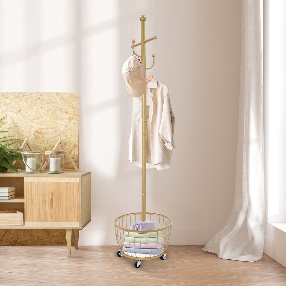 Space-Saving Coat Rack with Storage Basket for Entryway or Hallway