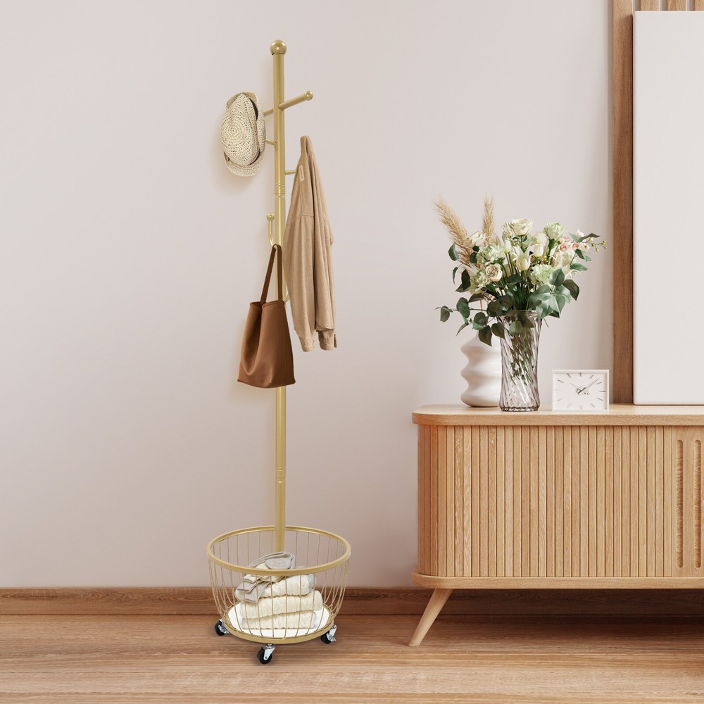 This coat rack is a stylish and functional addition to any entryway! The gold finish gives it a modern, elegant look, while the six sturdy hooks easily hold coats, bags, and hats. The included storage basket is perfect for shoes or small items, and the smooth-rolling wheels make it easy to move around. Assembly was straightforward, and the quality feels solid—much sturdier than expected for the price. Great for small spaces but still holds plenty! Highly recommend for anyone needing extra storage with a touch of class.