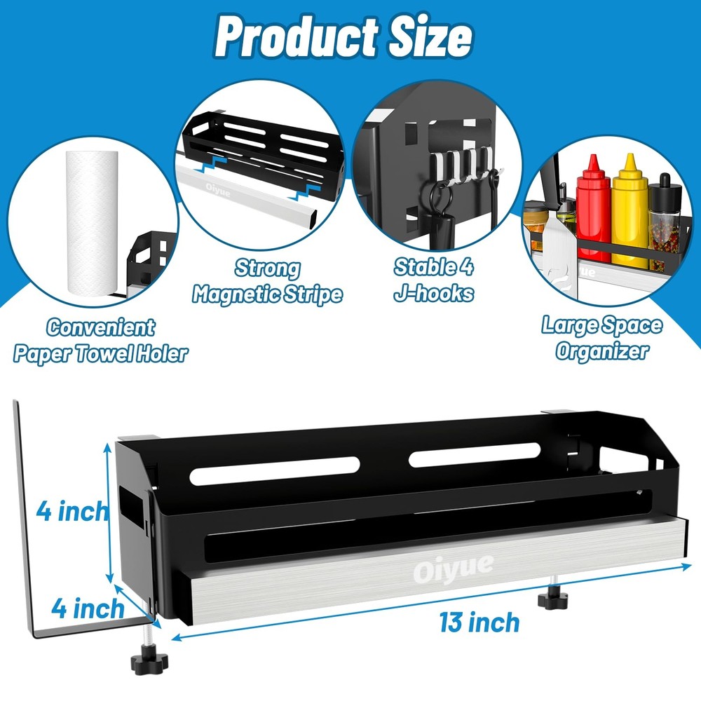 Griddle Caddy for Blackstone Griddle Accessories 【Large Space Saving Design】Designed for blackstone griddle 28"/36" with countertop side stand ( Width > 11.5 inches, Thickness < 3.5 inches ). Griddle caddy space can contain lots of seasonings and other bottles. Clear up your counter space to place more food and make your countertop more tidier. 【Upgrade Premium Material】The blackstone caddy is made of premium metal materials with an antirust coating, which greatly improves the strength and corrosion resistance. The elaborate mesh design keeps you away from the oil and water stains. The grill caddy is durable and can be used for a long time. 【Strong Magnetic Tool Holder】Upgraded strong magnetic tripe has strong magnetic absorption capacity, which can provide a better place for the blackstone grills, scrapers, spatula, scissors, etc, and won't fall off easily. Blackstone griddle accessories will bring you a better experience for barbecue. 【Paper Towel Holder & 4 J-Hooks】Convenient paper towel holder design, you can easily use it to make cleaning faster and cleaner. The 4 J-Hooks can be hung on any side of the blackstone griddle without shaking and falling, which will provide you with more space to store blackstone accessories. 【Easy to Install & Removable】The package comes with an installation manual. You can install it on the blackstone griddle 28"/36" with a tool-free no drill. The large capacity provides enough storage space for your necessary grill tools and seasonings, which is the perfect tool for outdoor barbecues or party.