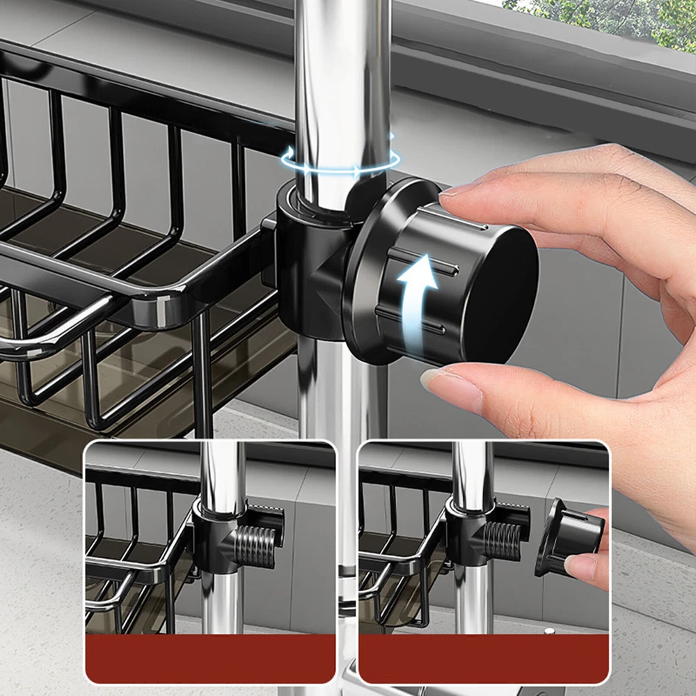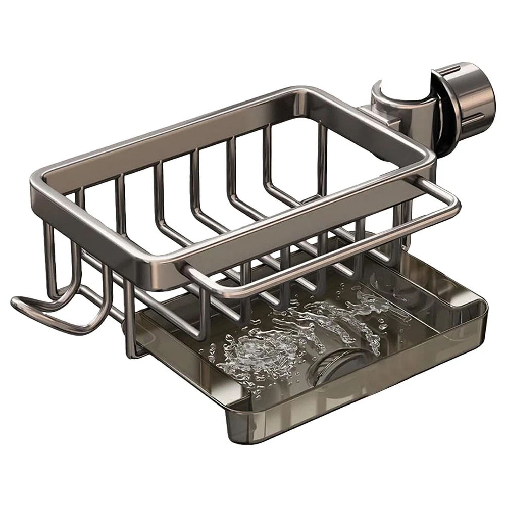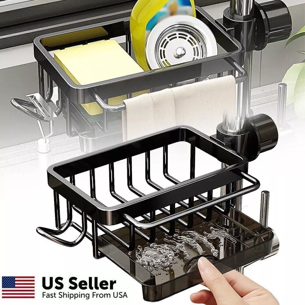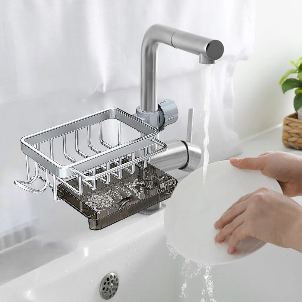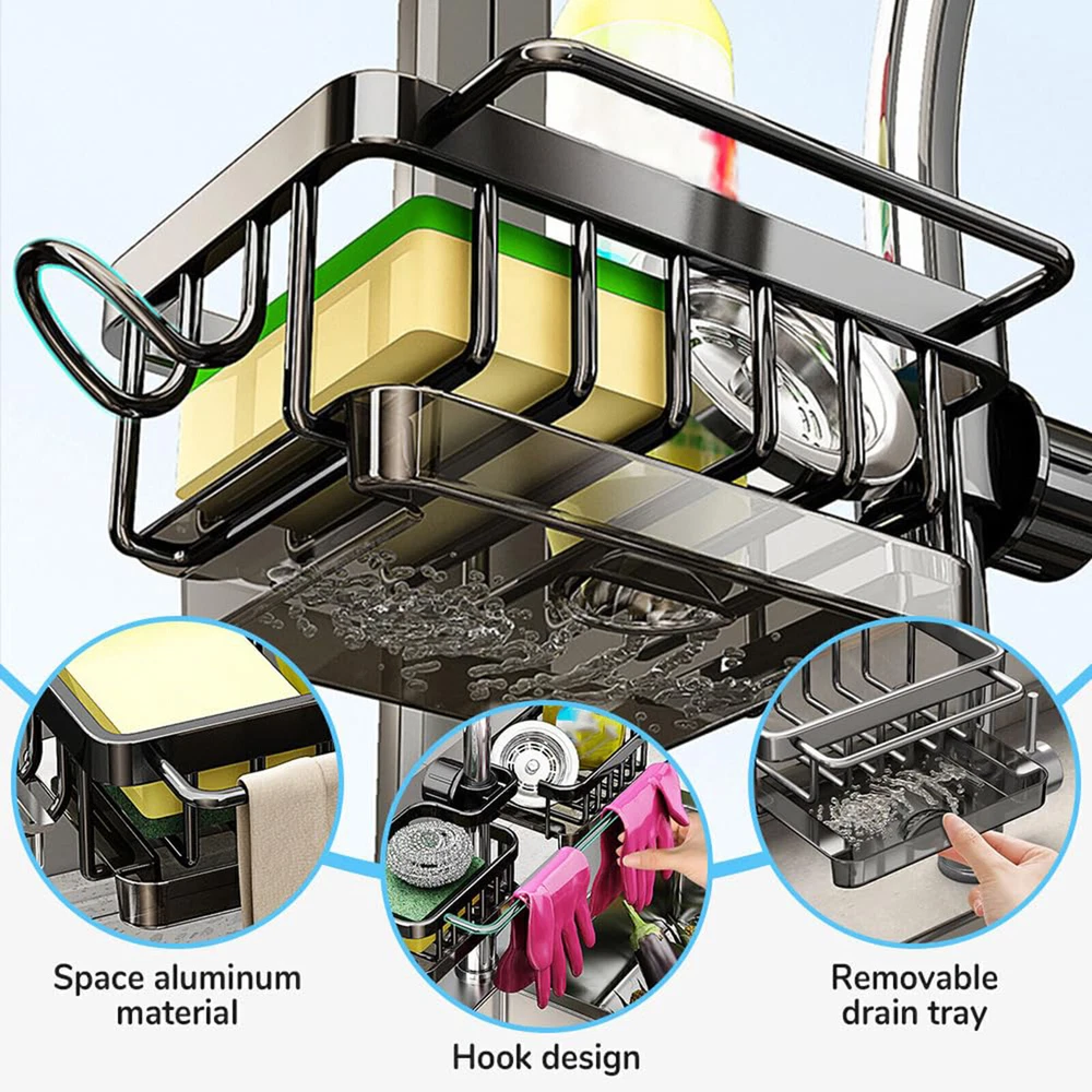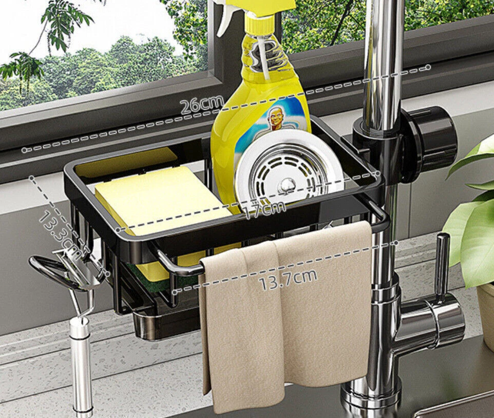 Product Description Kitchen Sink Faucet Organizer, Dish Sponge Holder Over Faucet Kitchen Sink Caddy Bullet Points: Robust Foundation: With a strong and sturdy aluminum and ABS construction, this faucet sponge holder boasts high load-bearing capacity and wear-resistance for durability and long-lasting use, providing a strong foundation for your sponge. Quick-drying design: With a drip tray to prevent water stains and a quick-drying design, this sink rack ensures your sink area maintains clean, hygienic, and free from water accumulation. Streamlined Organization: With its innovative hook design, this faucet sponge holder optimizes sink space and delivers a space-saving solution ideal for storing cleaning cloths, sponges or brushes. Effortless Assembly: Fix our sponge holder onto the faucet rod with ease - no tools needed! Simply insert and tighten the knob for a hassle-free installation that streamlines your kitchen organization in seconds. Versatile Storage: Not just for kitchens, this faucet sponge holder expands your organization options—perfect for bathroom must-haves like shampoo and soap, ensuring everything is within reach. Avoid water accumulation and keep items within reach. Simply insert the faucet rod and tighten the knob to fix it in place. Product material: aluminum + ABS Product size: 26x11cm/10.23x4.33 inches Product list: Kitchen sink faucet storage rack * 1pcs powered by