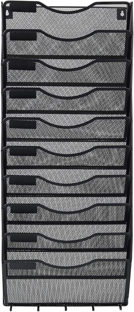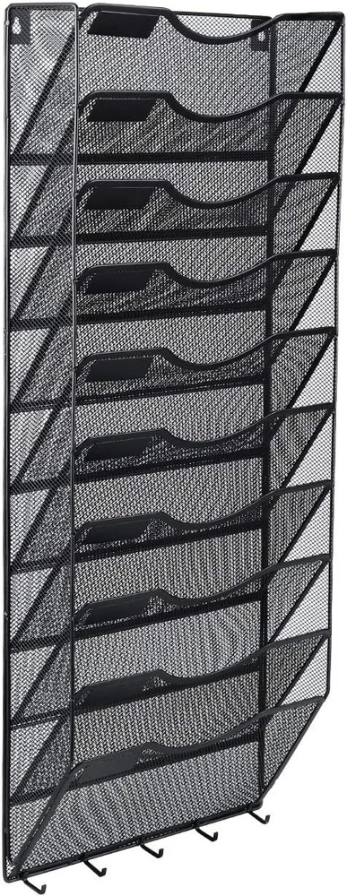 Size: 10 Tier With Hooks Features: Fastener Included, Heavyweight, Moisture Resistant, Anti-Microbial, Business Card Holder, Coated Rod Tips, Flap Closure, Recycled Materials, Reinforced Gusset, Tear Resistant, Durable Metal Structure, One-Piece Design File Holder, Humanize Design, Space-saving Design, Stylish mesh arched design, Rust Resistant, Easy Access Design Batteries Required?: No Number of Pockets: 10 Batteries Included?: No UPC: Does not apply Special Feature: Rust Resistant Finish: Powder Coated Type: Hanging File Folder gtin13: Does not apply Number Of Items: 1 Package Type: Standard Packaging Number Of Compartments: 10 Item Package Quantity: 1 Item Weight: 5.39 Pounds Number Of Pieces: 1 Sheet Size: Letter Material: Metal Brand: Unbranded Shape: Rectangular Color: Black Special Features: Rust Resistant Specific Uses For Product: Offices, Classrooms Tab Cut: No Tab Finish Type: Powder Coated Product Dimensions: 4.15"d X 13.25"w X 32"h