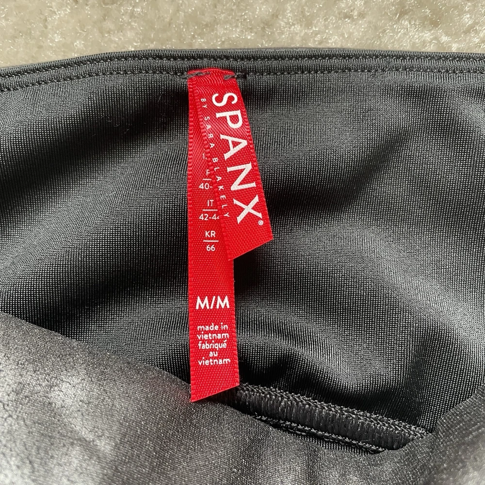 Elevate your wardrobe with these Spanx faux leather black leggings, perfect for any stylish woman. These leggings come in a size medium and are brand new with tags. The blended fabric provides a comfortable stretch while shaping your figure. These leggings have it all - a sleek black color, a flattering style, and are even machine washable for easy care. Whether you're dressing up for a night out or running errands during the day, these Spanx leggings are a versatile addition to any outfit. *small blemish on right side waistband-see photo Please review photos for details, measurements and condition