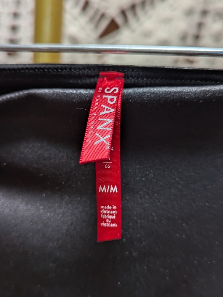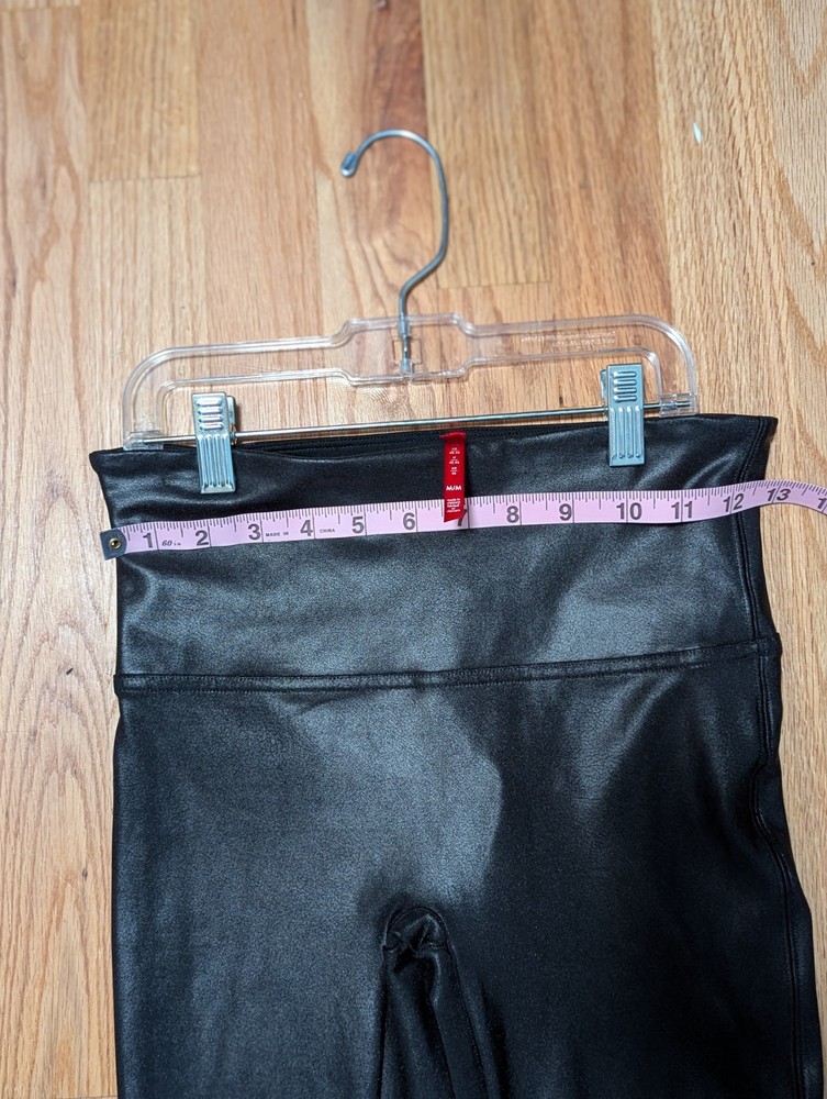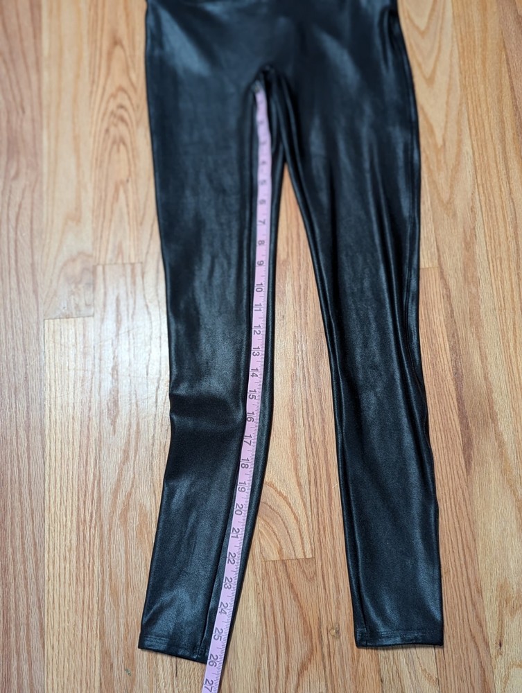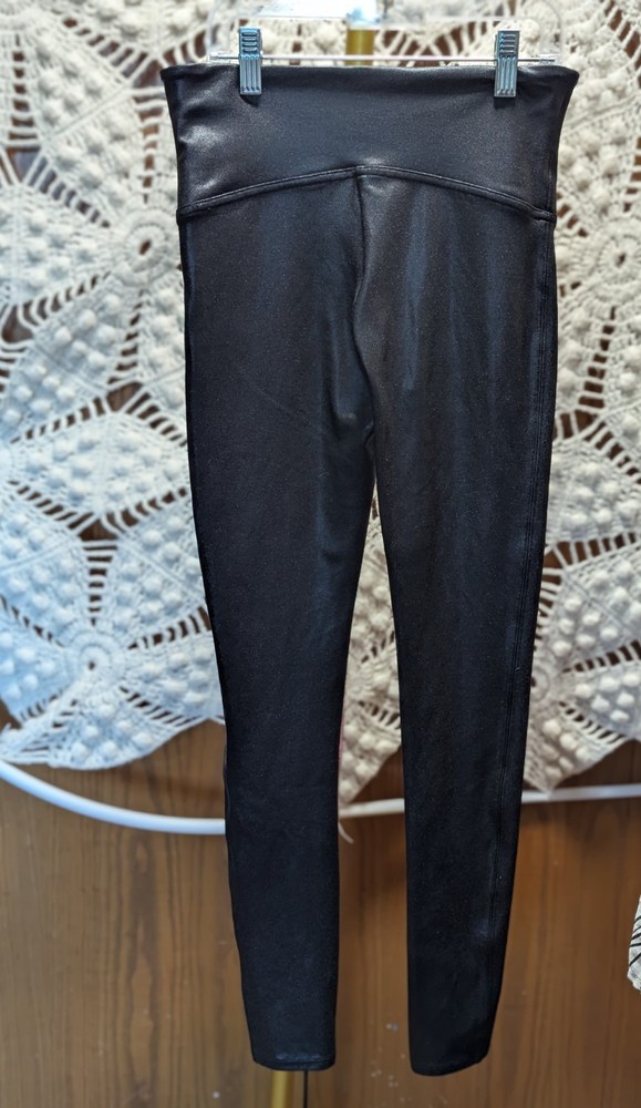 These Spanx Faux Leather Leggings in black size M offer high-waisted tummy control with a sleek and slimming design. Made from a comfortable nylon blend with elastane for stretch, these leggings are perfect for various occasions including activewear, casual wear, or party outfits. The ankle length and elastic waistband ensure a comfortable and secure fit, while the shaping and tummy control features make them a versatile choice for different activities such as gym workouts, yoga, or running. Perfect for those looking for a stylish and practical wardrobe staple.