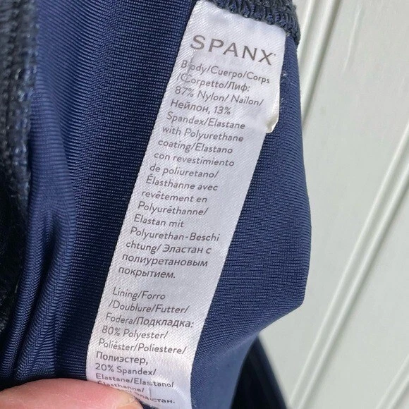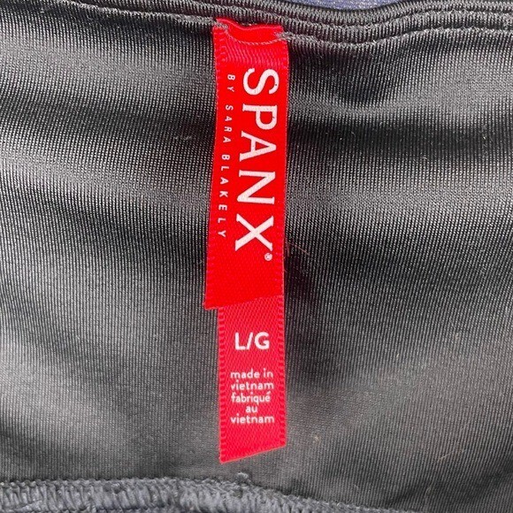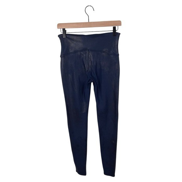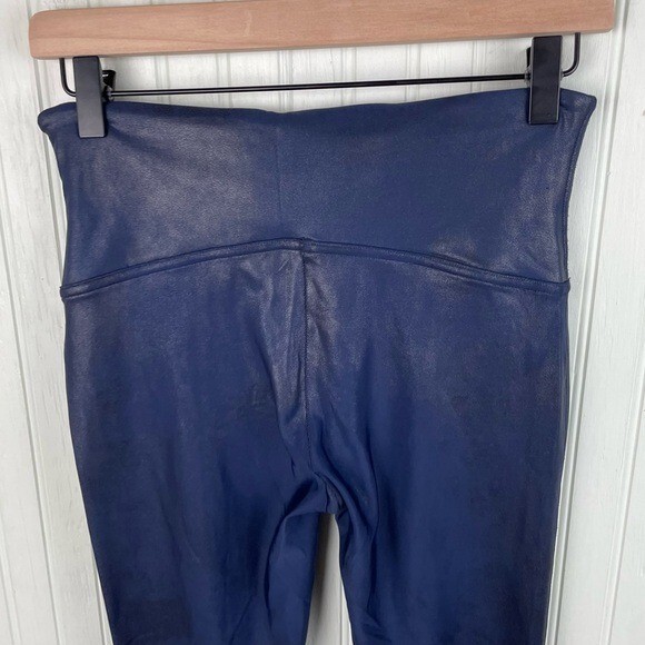 Spanx Faux Leather Leggings in Deep Navy Blue/Black Style 2437 Wide waistband, high rise, with metallic shine. Size Large Great pre-owned condition Some minor wear/pilling on leg area - see last photo Approximate measurements: Waist: 14” across Rise: 9” Inseam: 28”